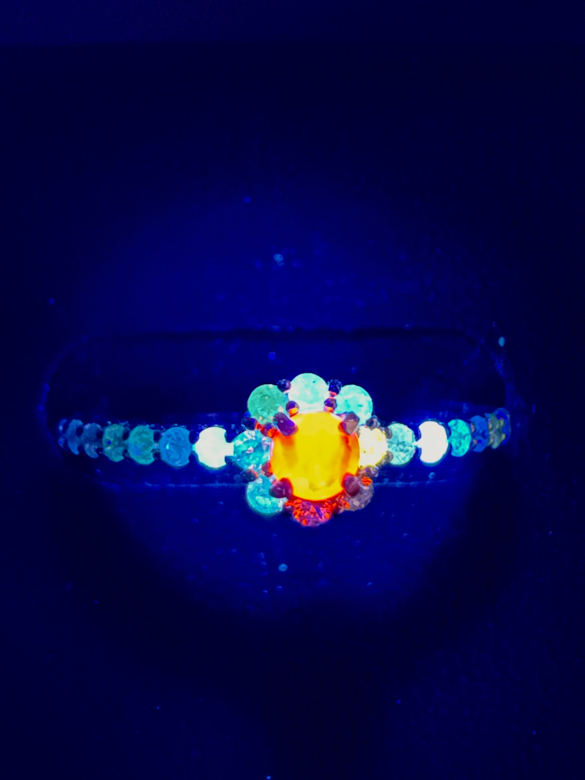 長波のUVライトではピンクパープルに蛍光し短波のUVライトではオレンジからイエローに蛍光します。