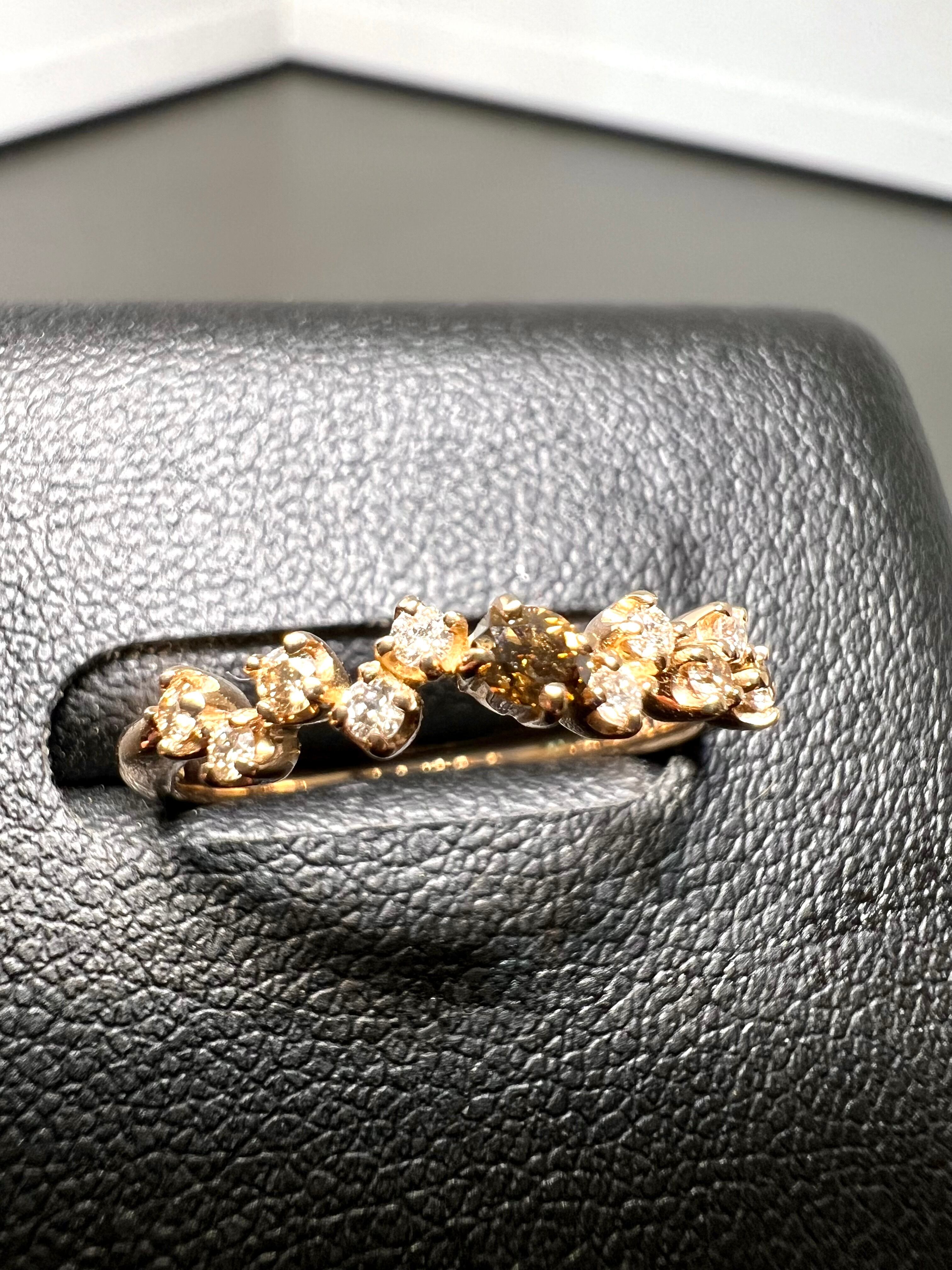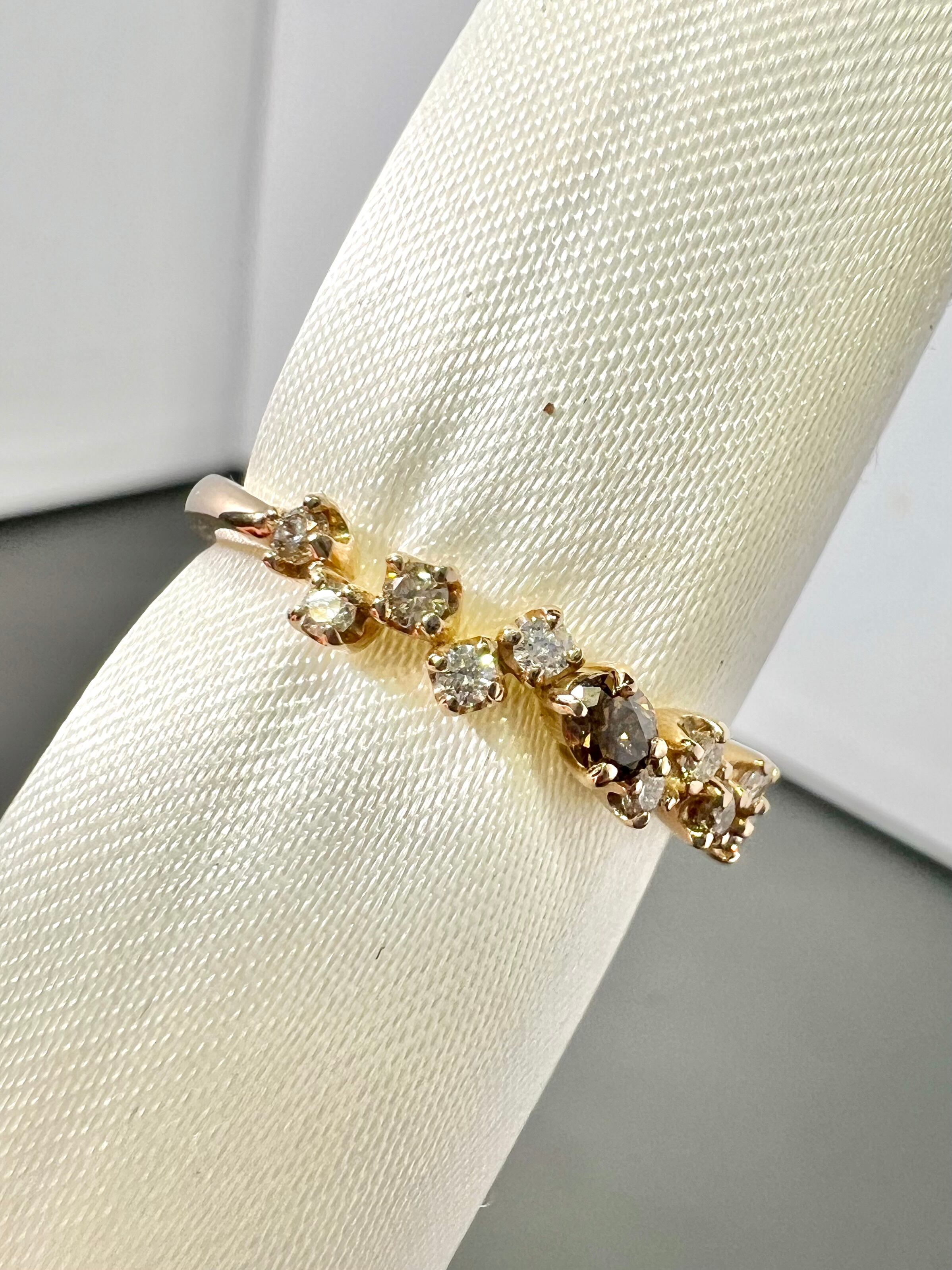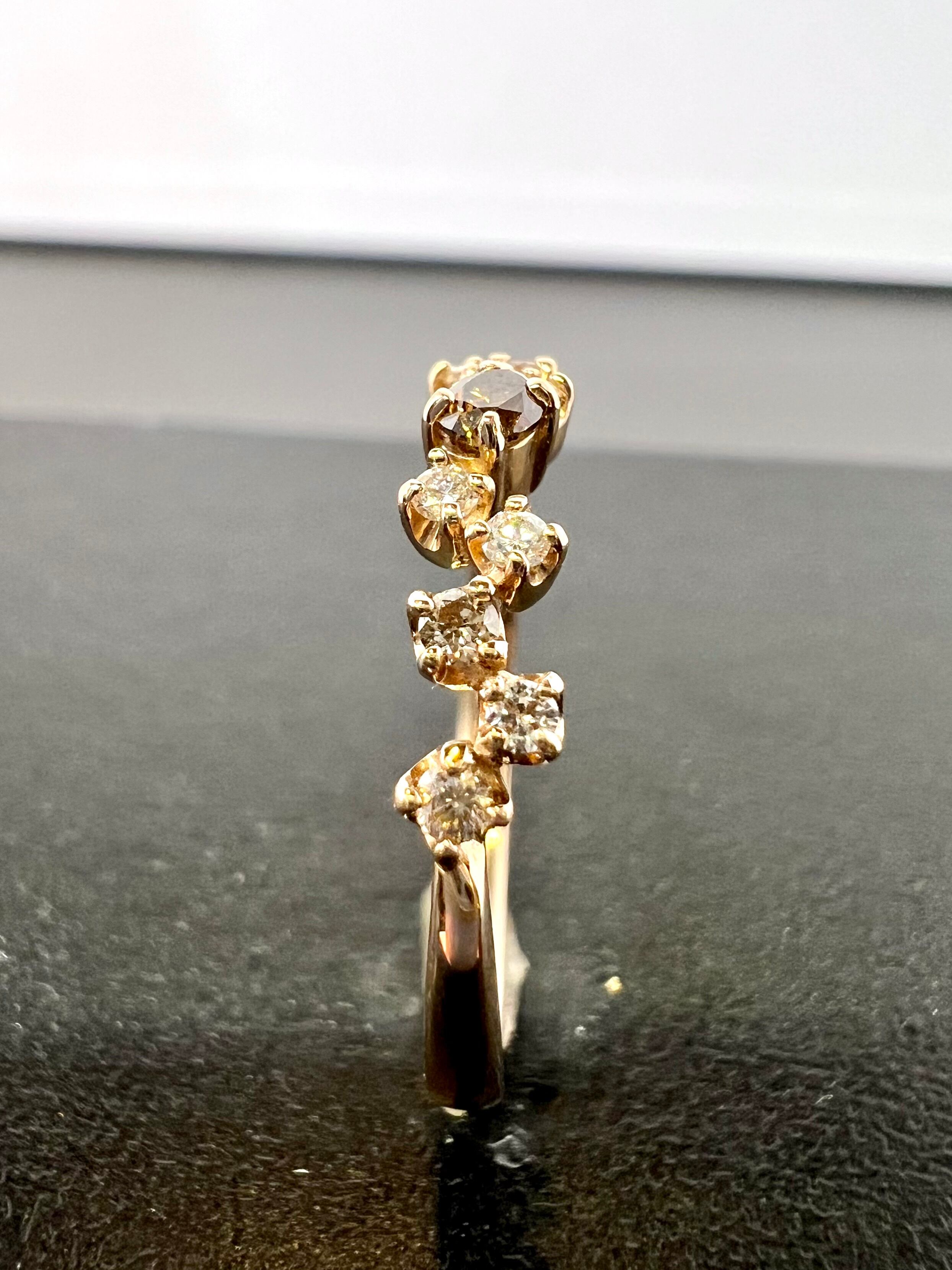オーバルのブラウンダイヤモンドを斜めにセットしてウデには互い違いに並べた可愛いデザイン。