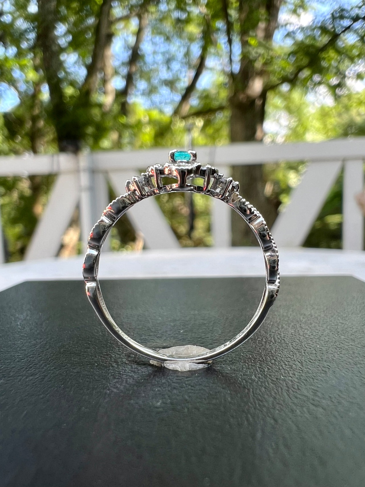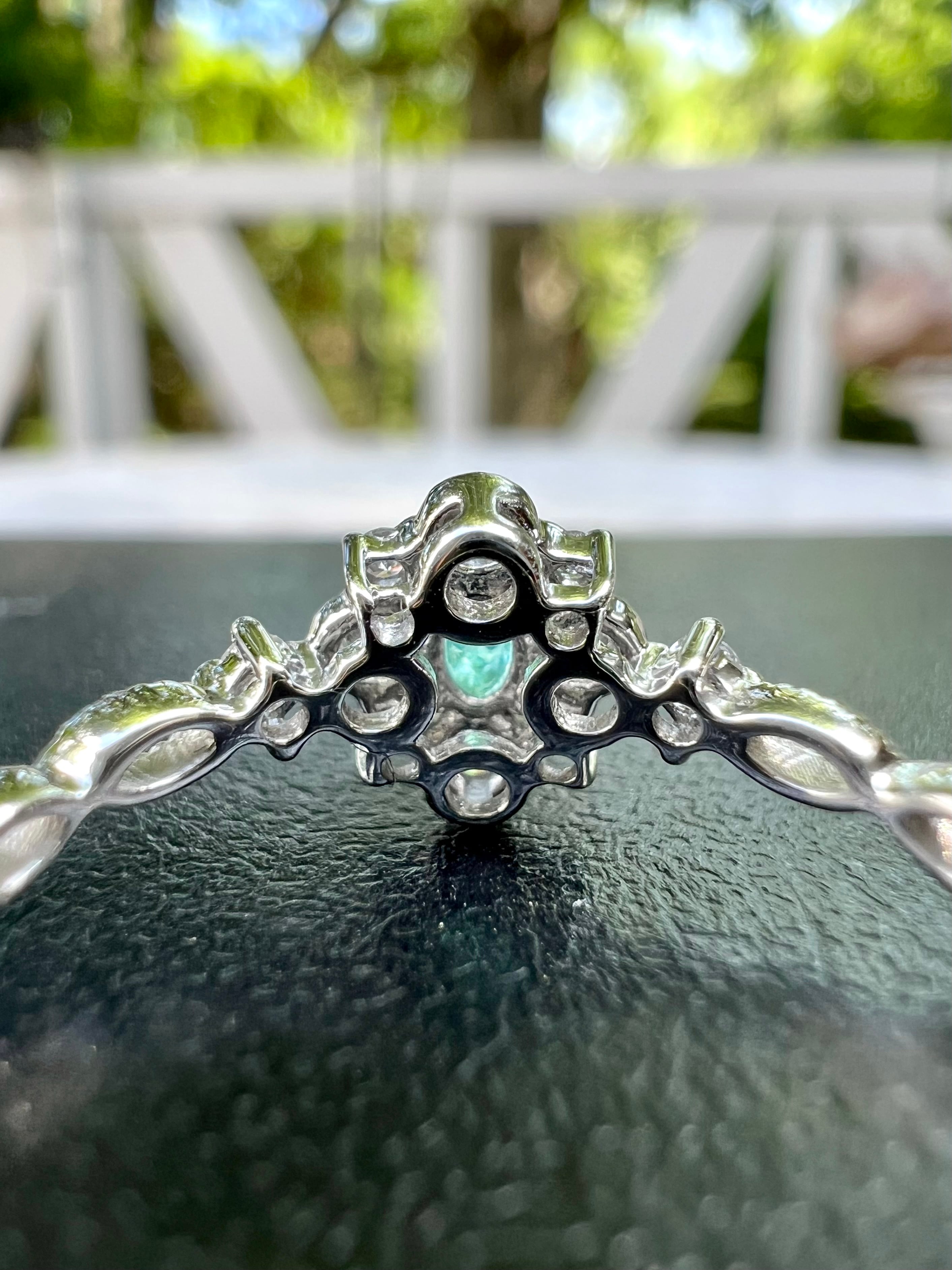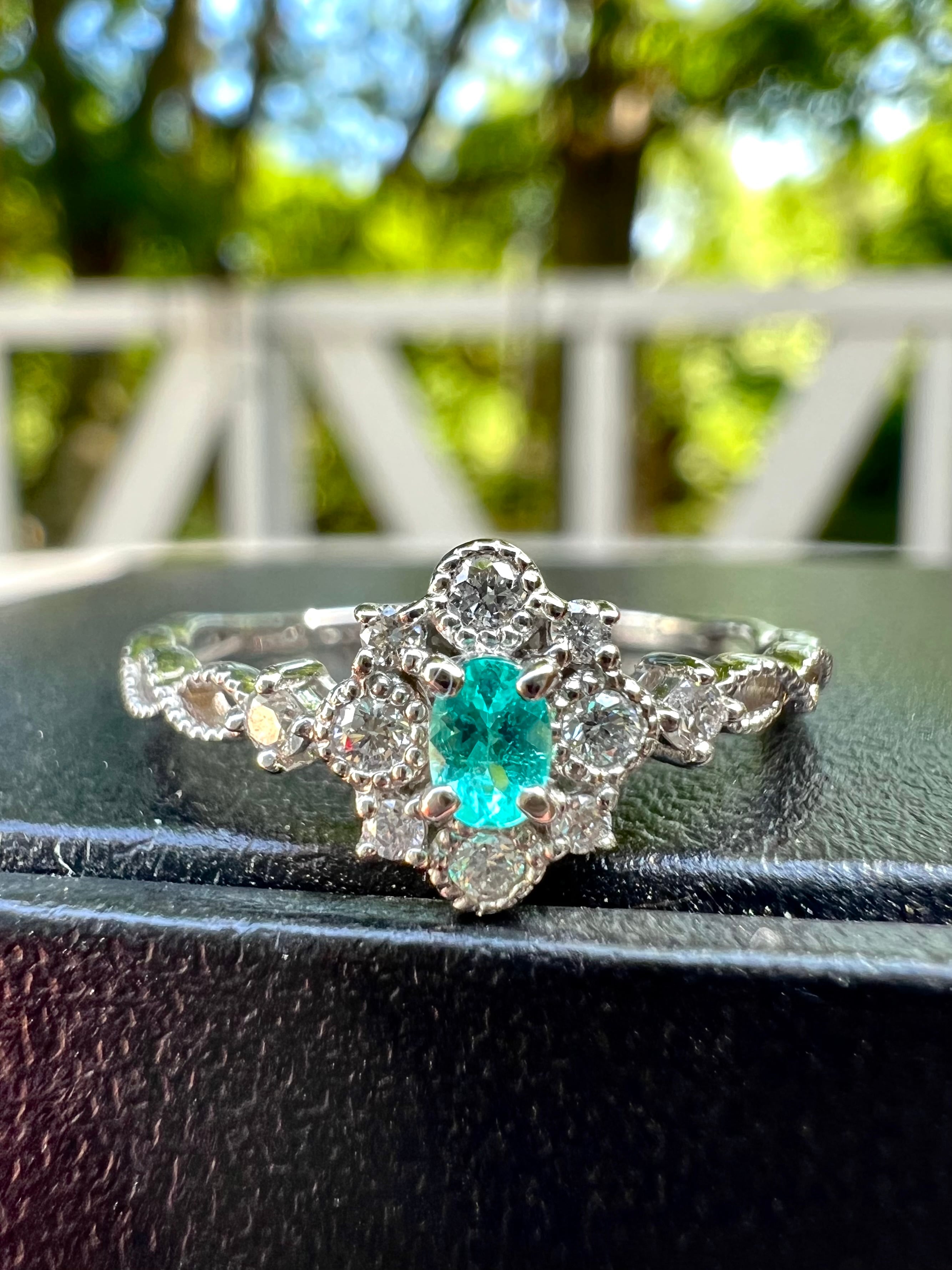 とても綺麗なブラジル産パライバトルマリンをダイヤモンドで取り巻き外側に大きさの違うダイヤモンドを隙間を作りながら配置しとても立体的に見せるカッコイイデザイン。
