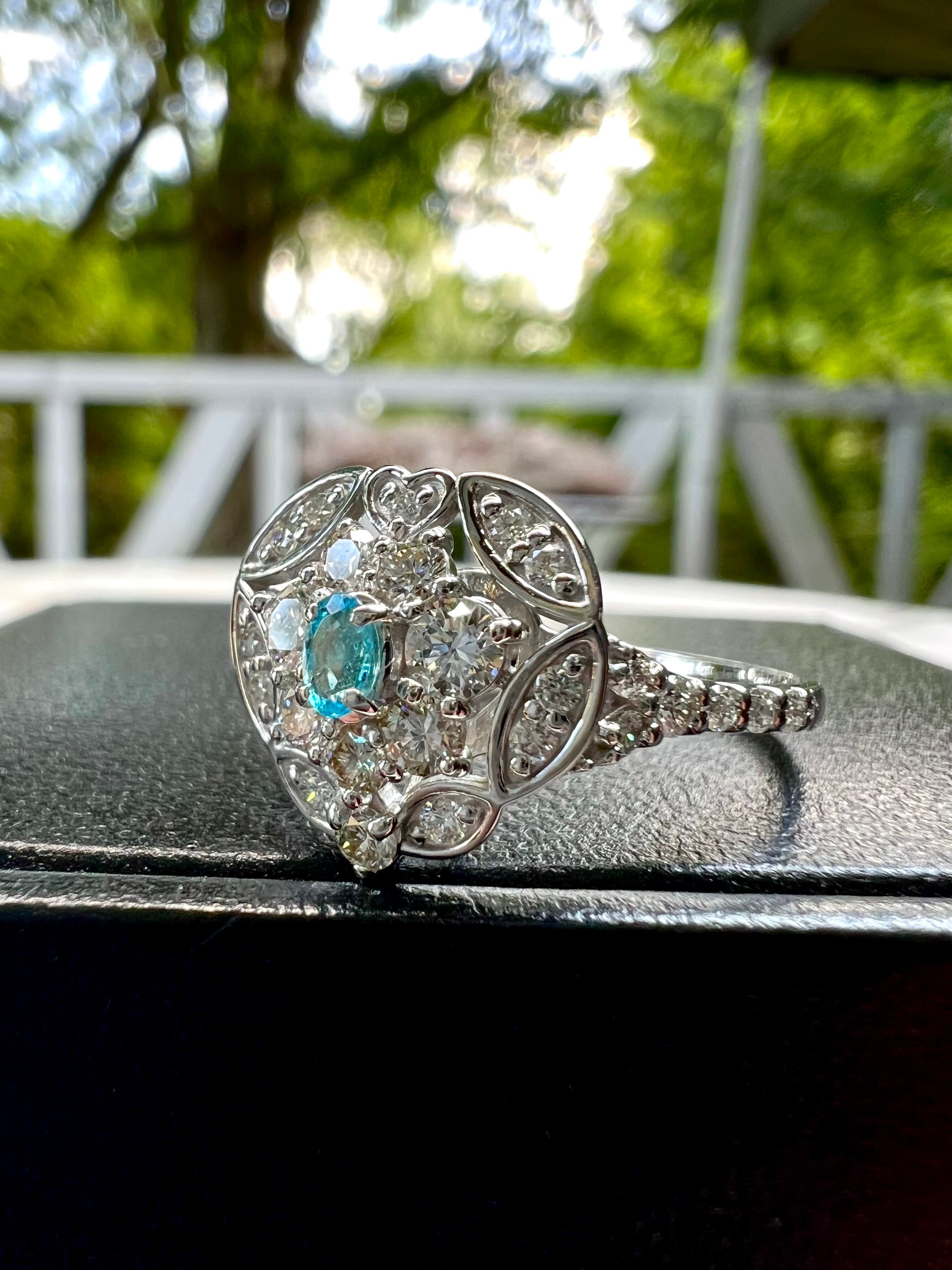 とても綺麗なブラジル産パライバトルマリンをダイヤモンドで取り巻き外側にはハートモチーフにダイヤモンドを配置しとても立体的に見せるカッコイイデザイン。