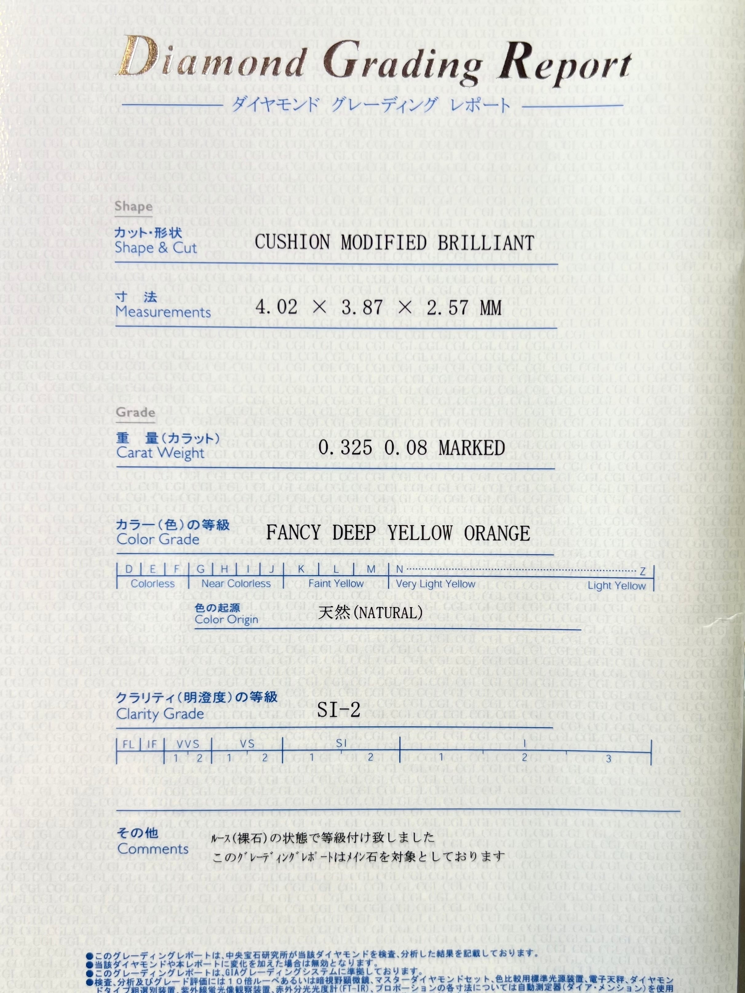 オレンジがかっておりハッキリとしてとても色濃いとても素敵なお色のダイヤです。