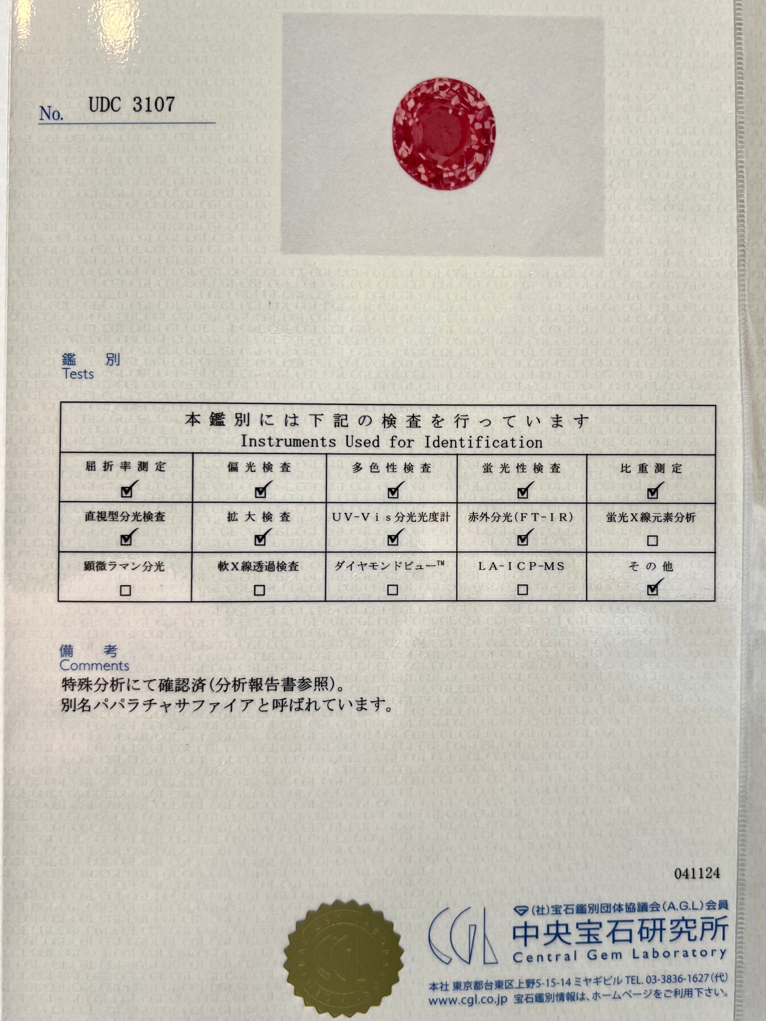 CGLがパパラチアサファイヤ・非加熱を記載してるので安心ですね。