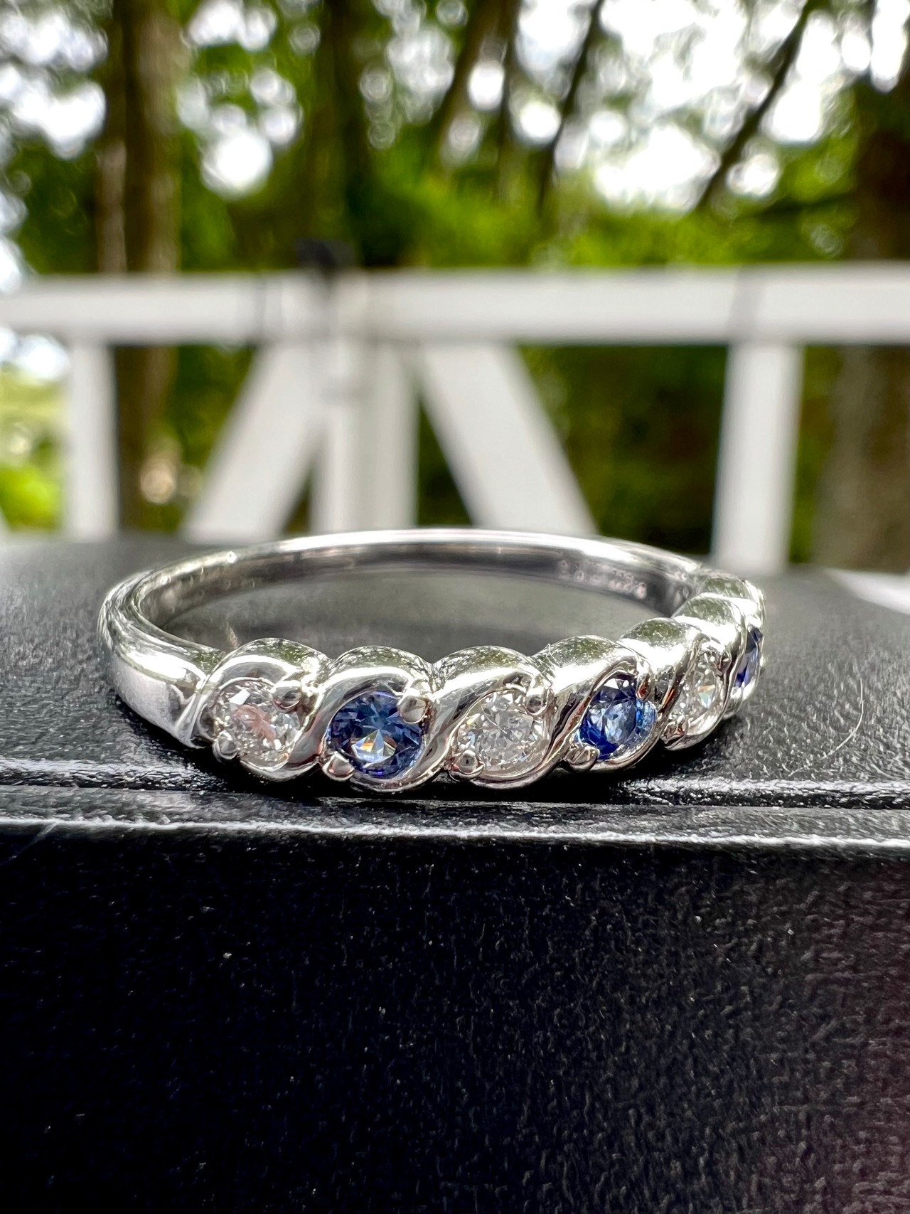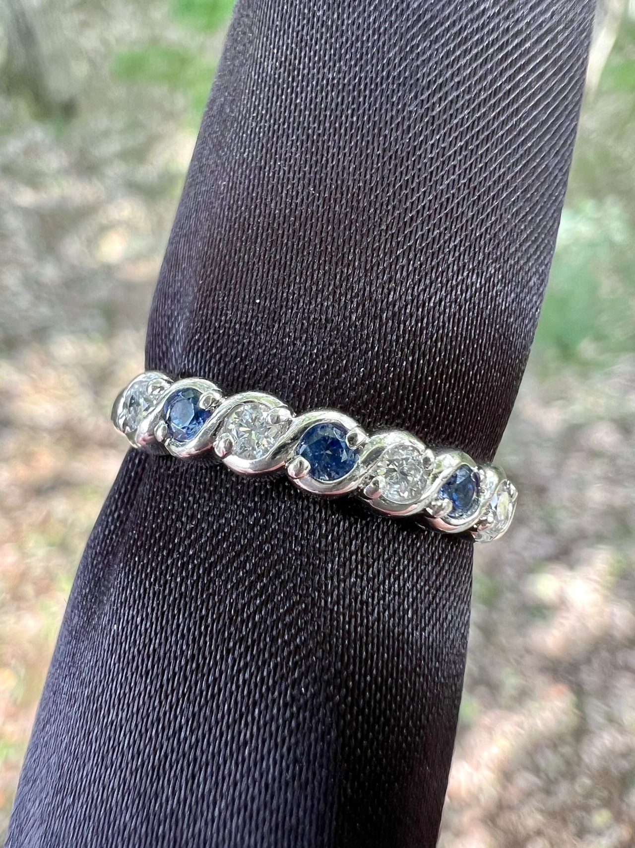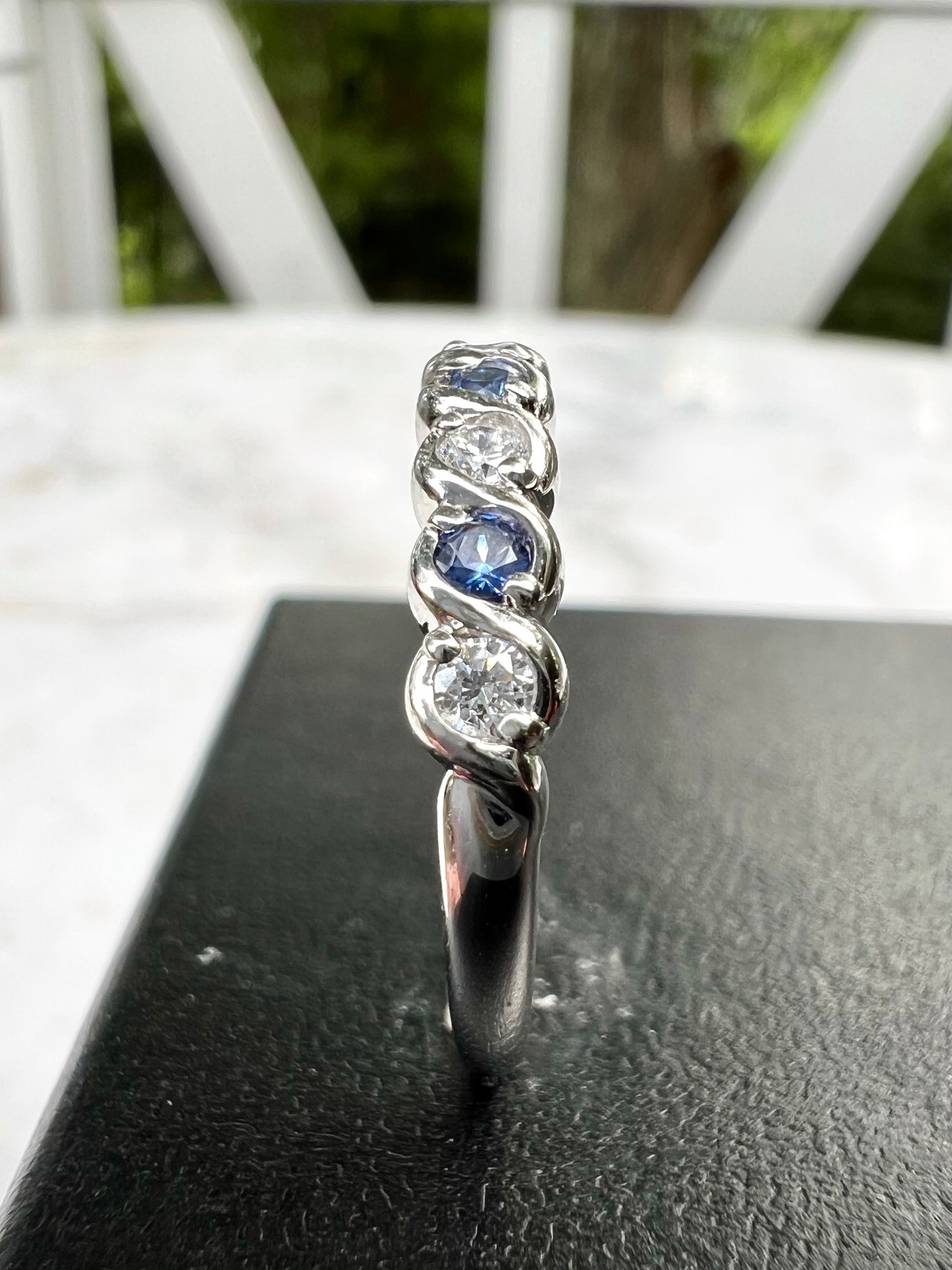 ダイヤを使わずベニトアイトのみで作ったハーフエタニティは圧巻です。