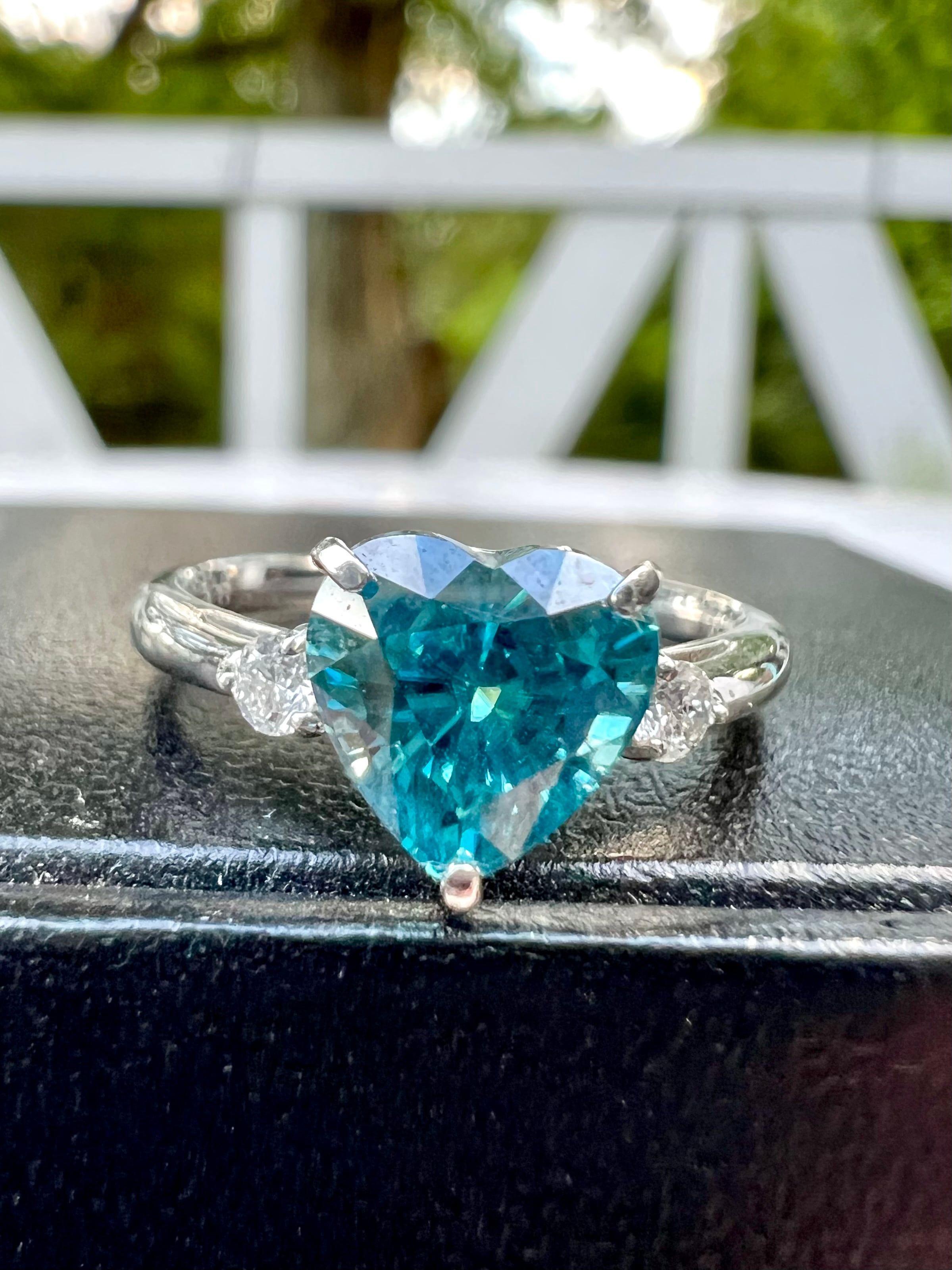 Pt900 超輝!天然ブルージルコンハートシェイプダイヤモンドリング カンボジア産