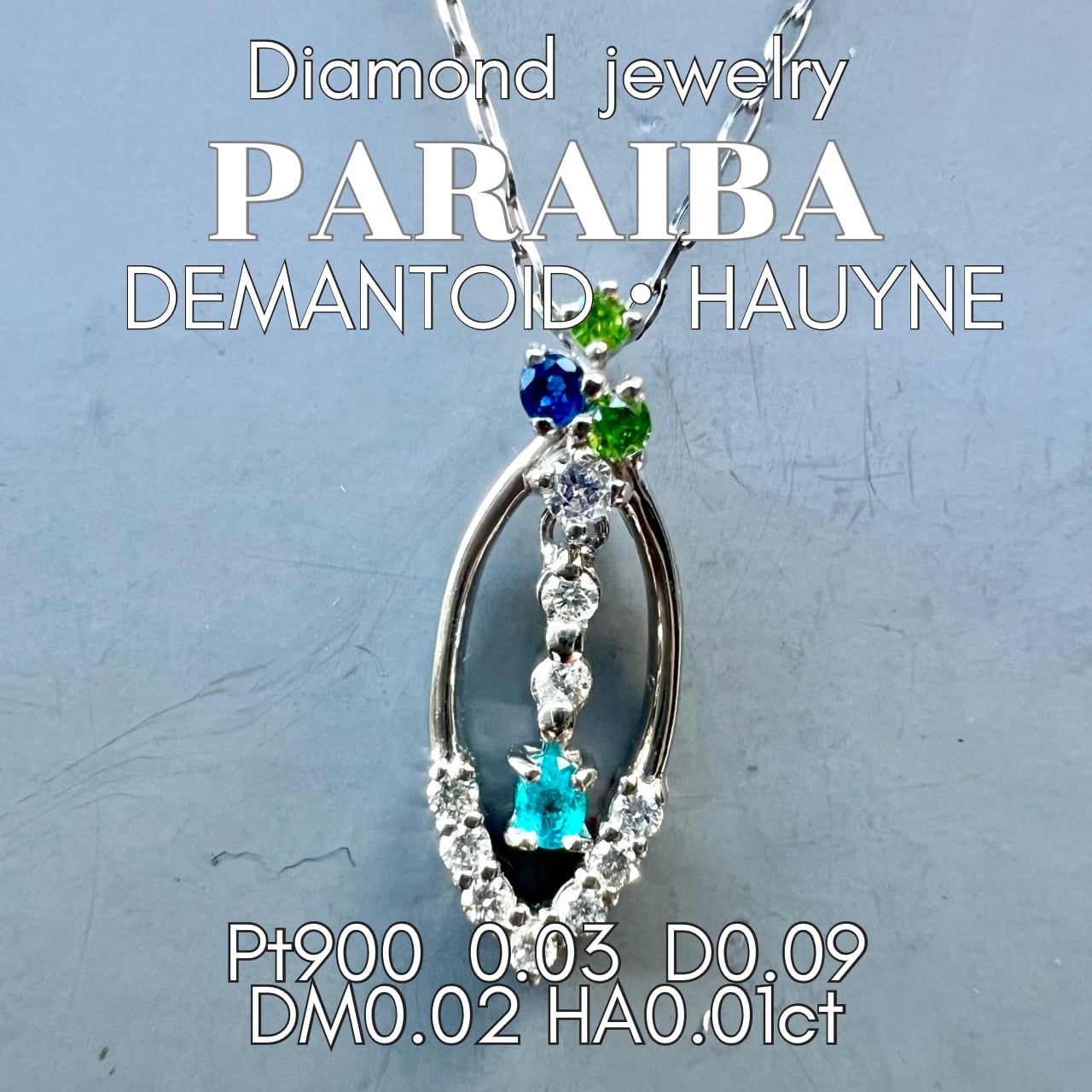 発色の良いパライバトルマリンを中心にダイヤモンドだけではなくバチカン部分にはデマントイドガーネット2石アウイナイト1石を施しました。