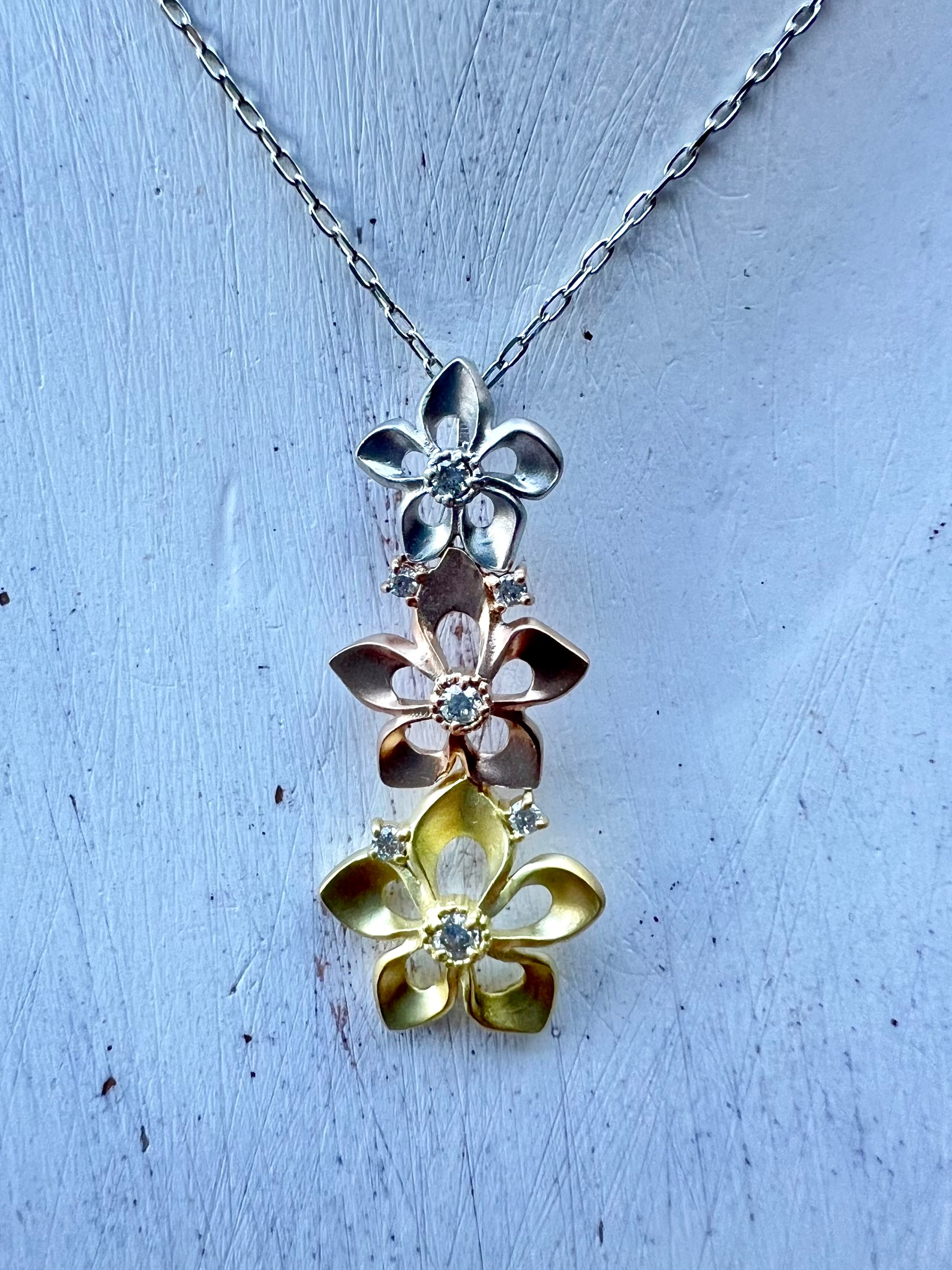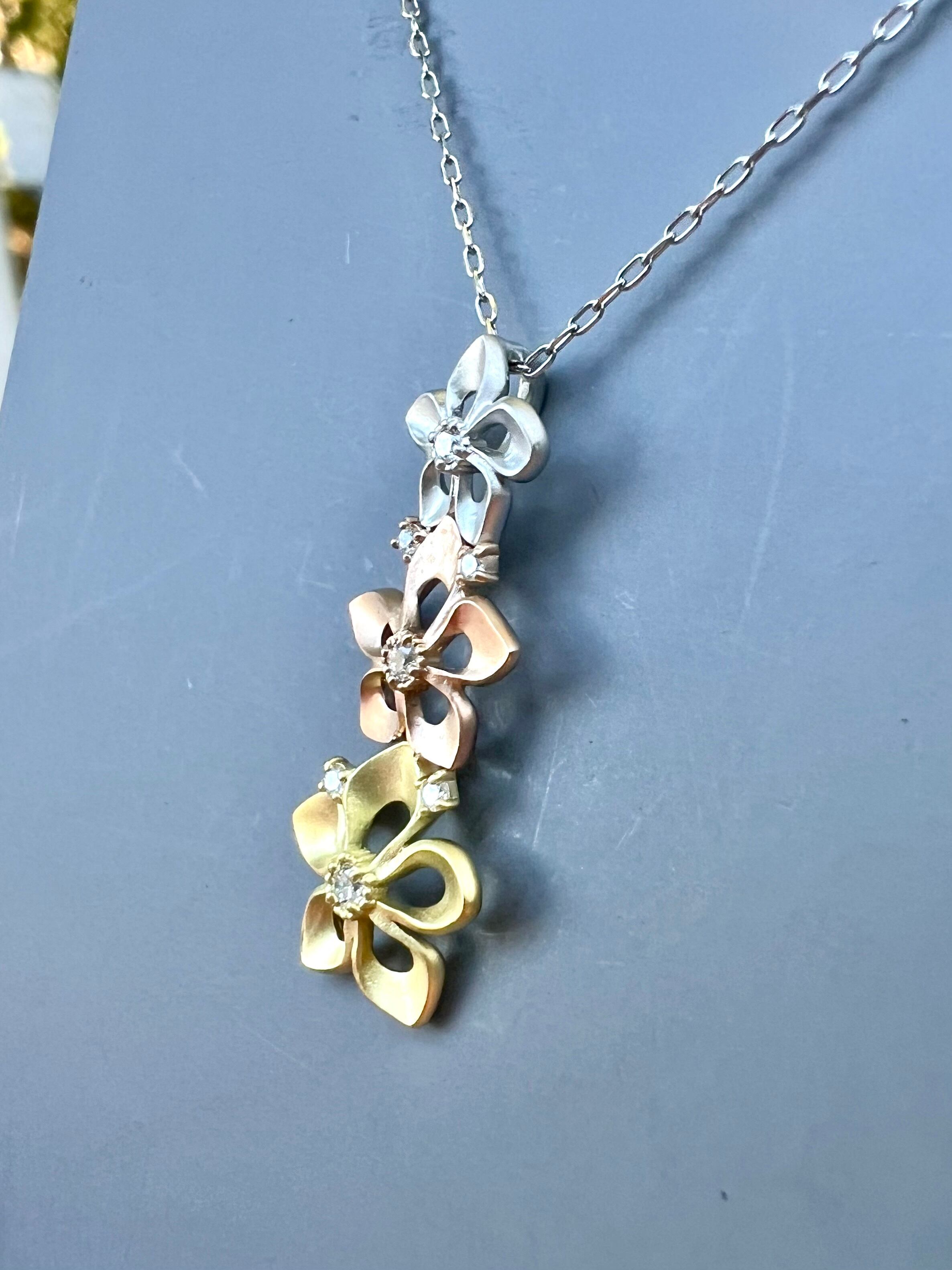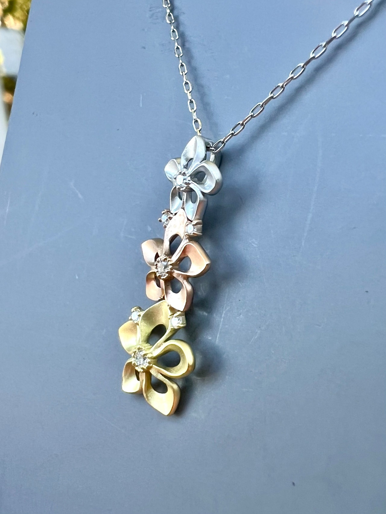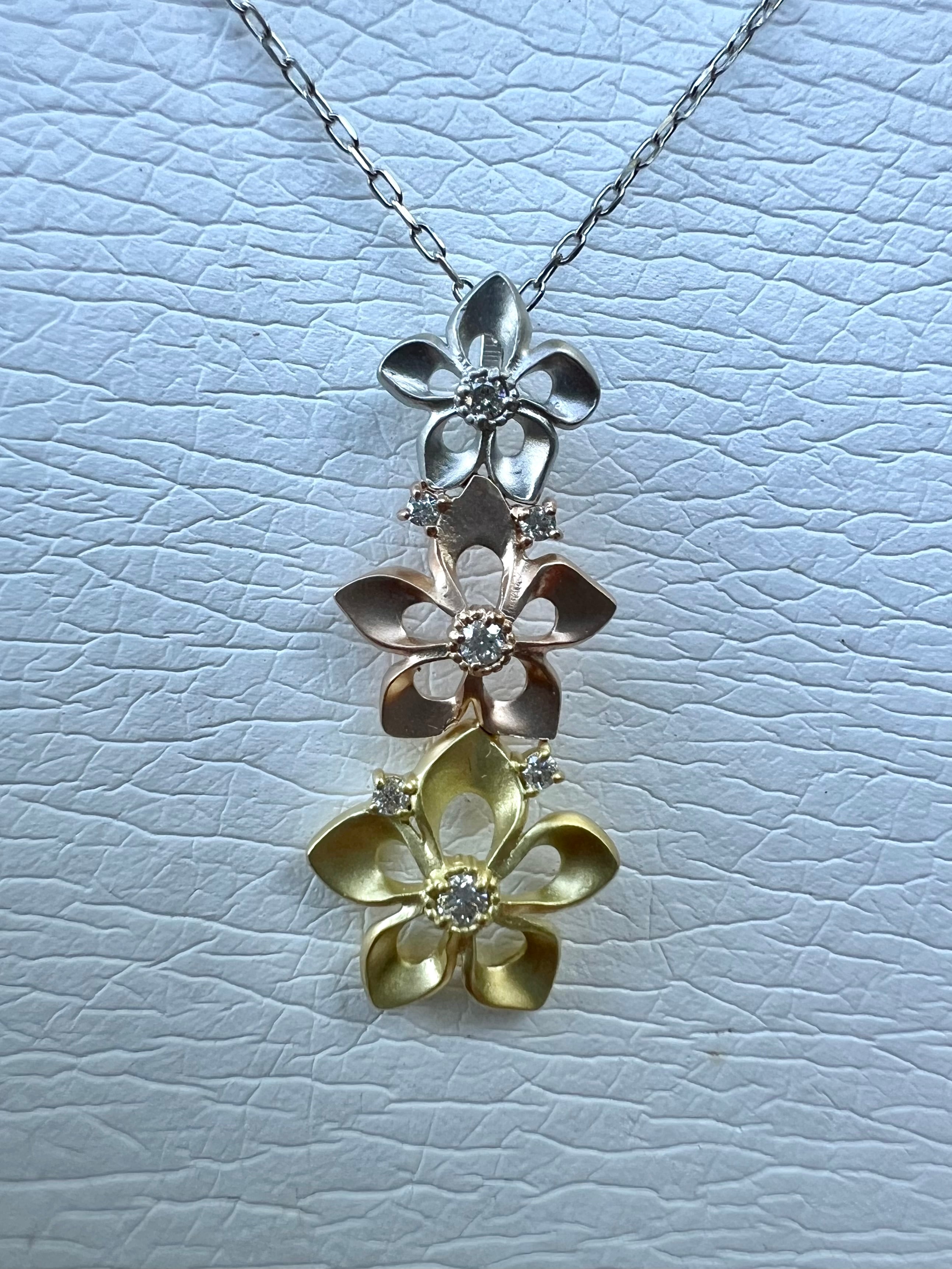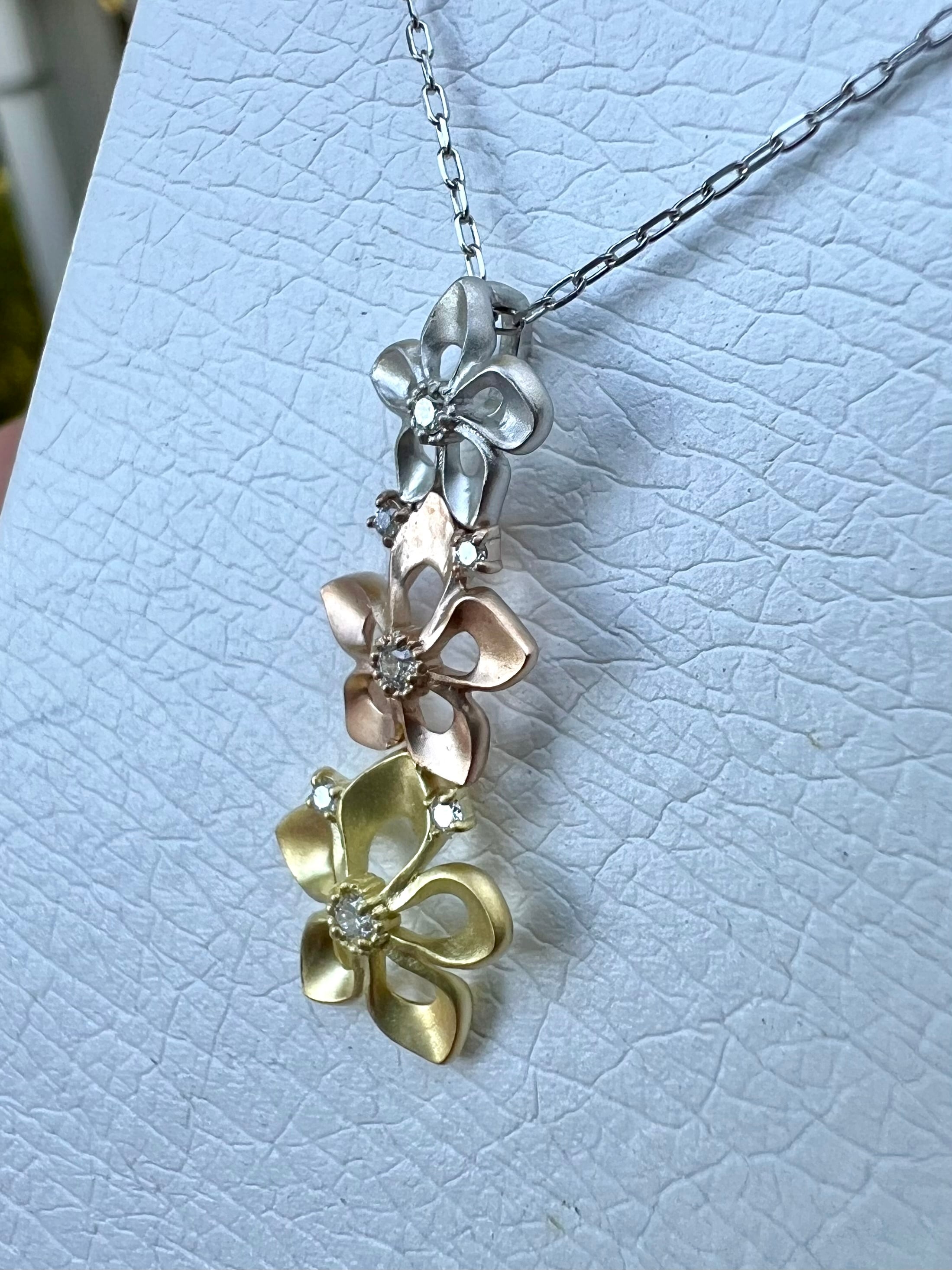 プラチナのお花、18金のお花K18PGのお花と3色のお花が一つのアクセサリーにデザインされたとても可愛いアクセサリーです。