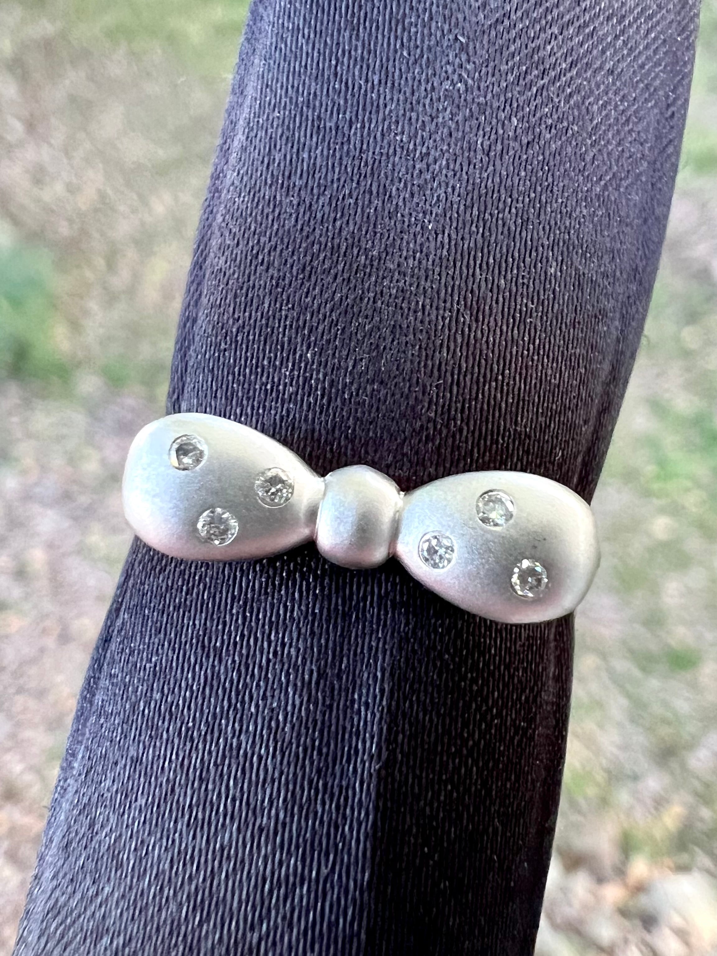 ダイヤモンドが水玉の様な配置のとても可愛いリボンモチーフリングです。