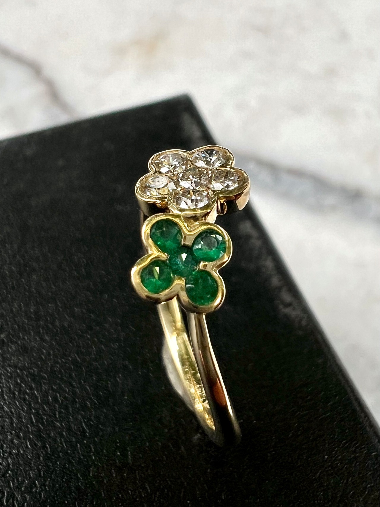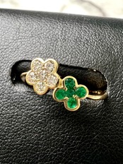 ダイヤで作られた桜のような5枚の花びらのお花のお隣にに5粒のエメラルドで作られた四つ葉のクローバーを添えられた超絶可愛いリングですっ!
