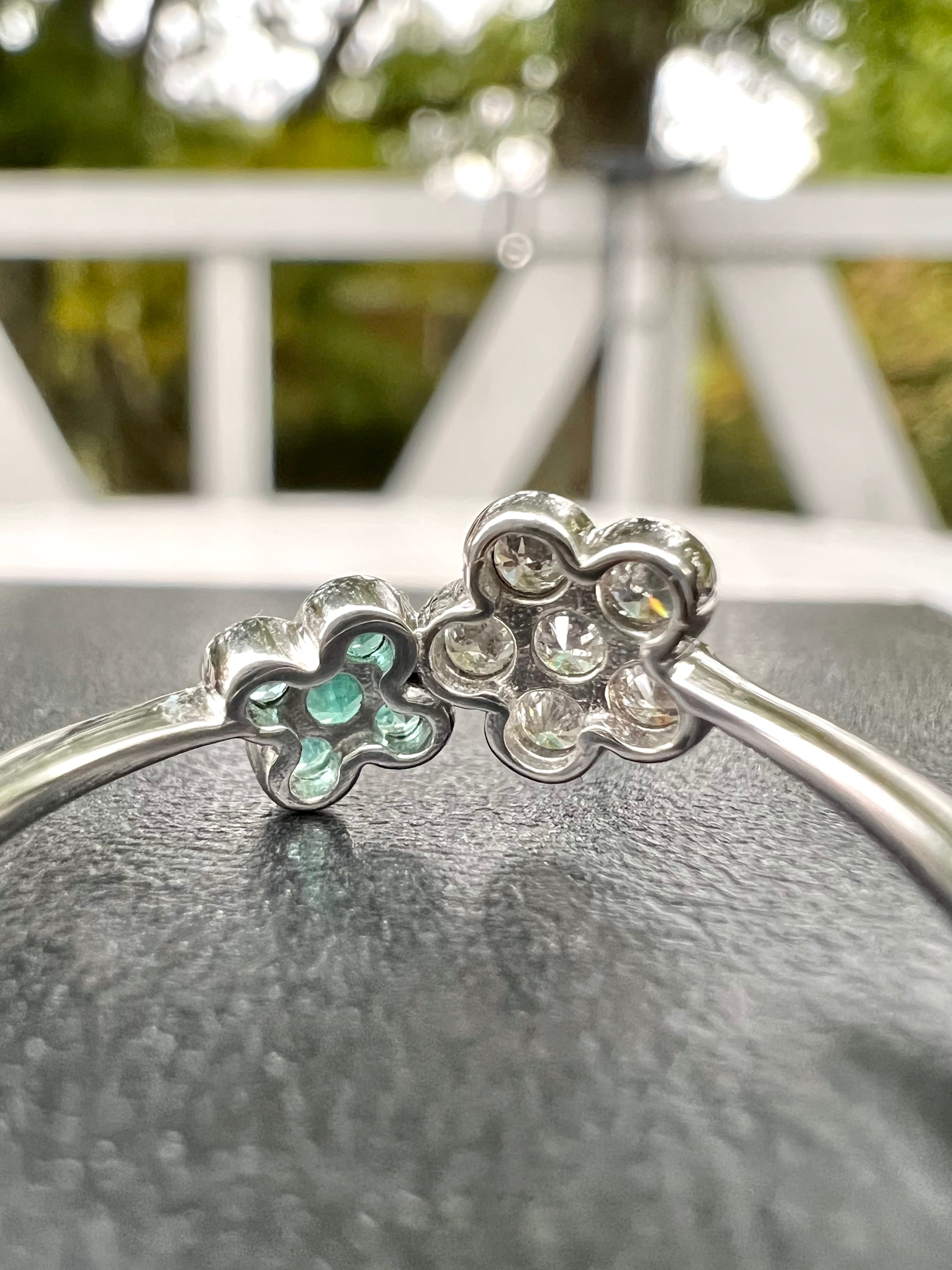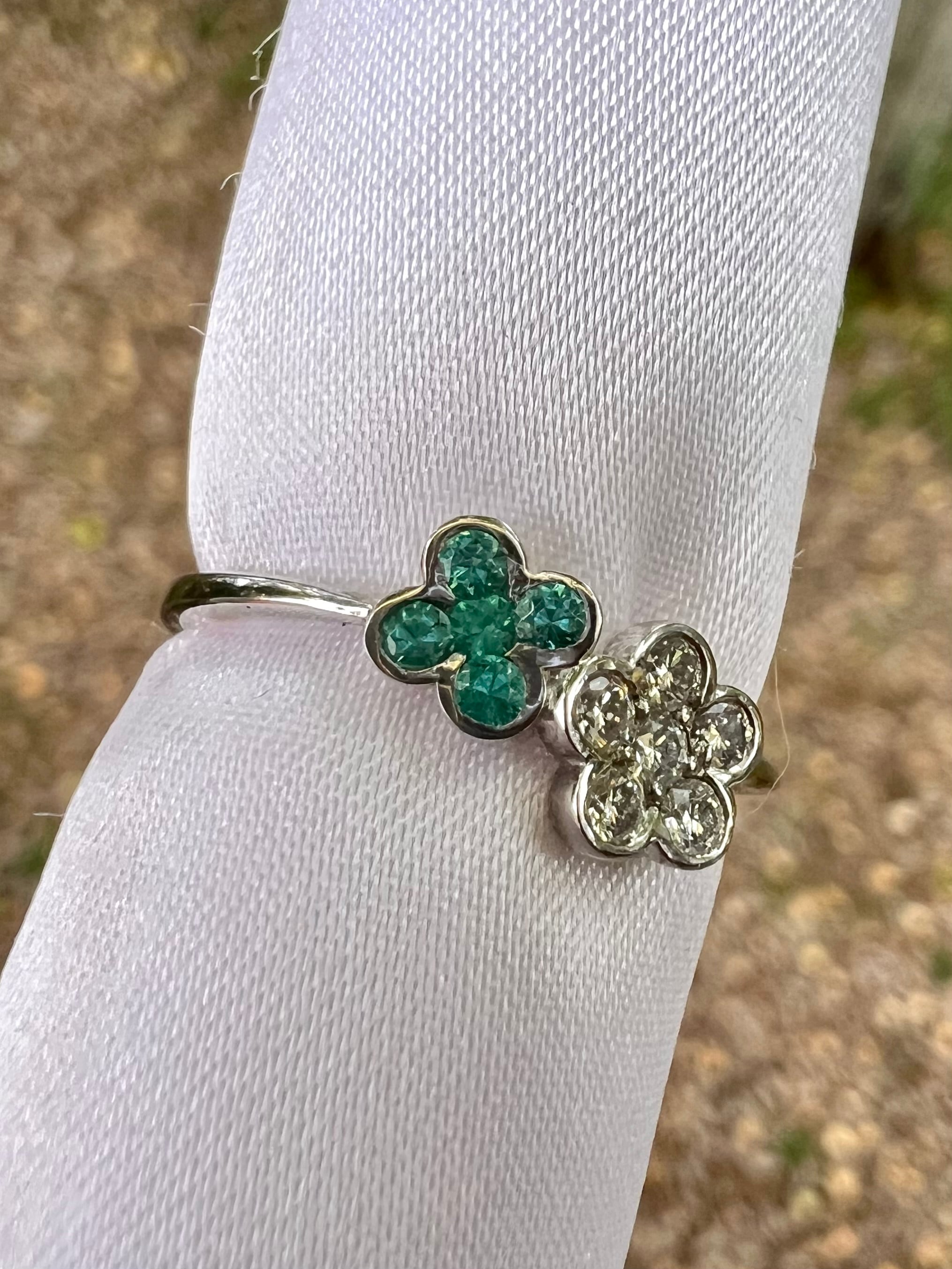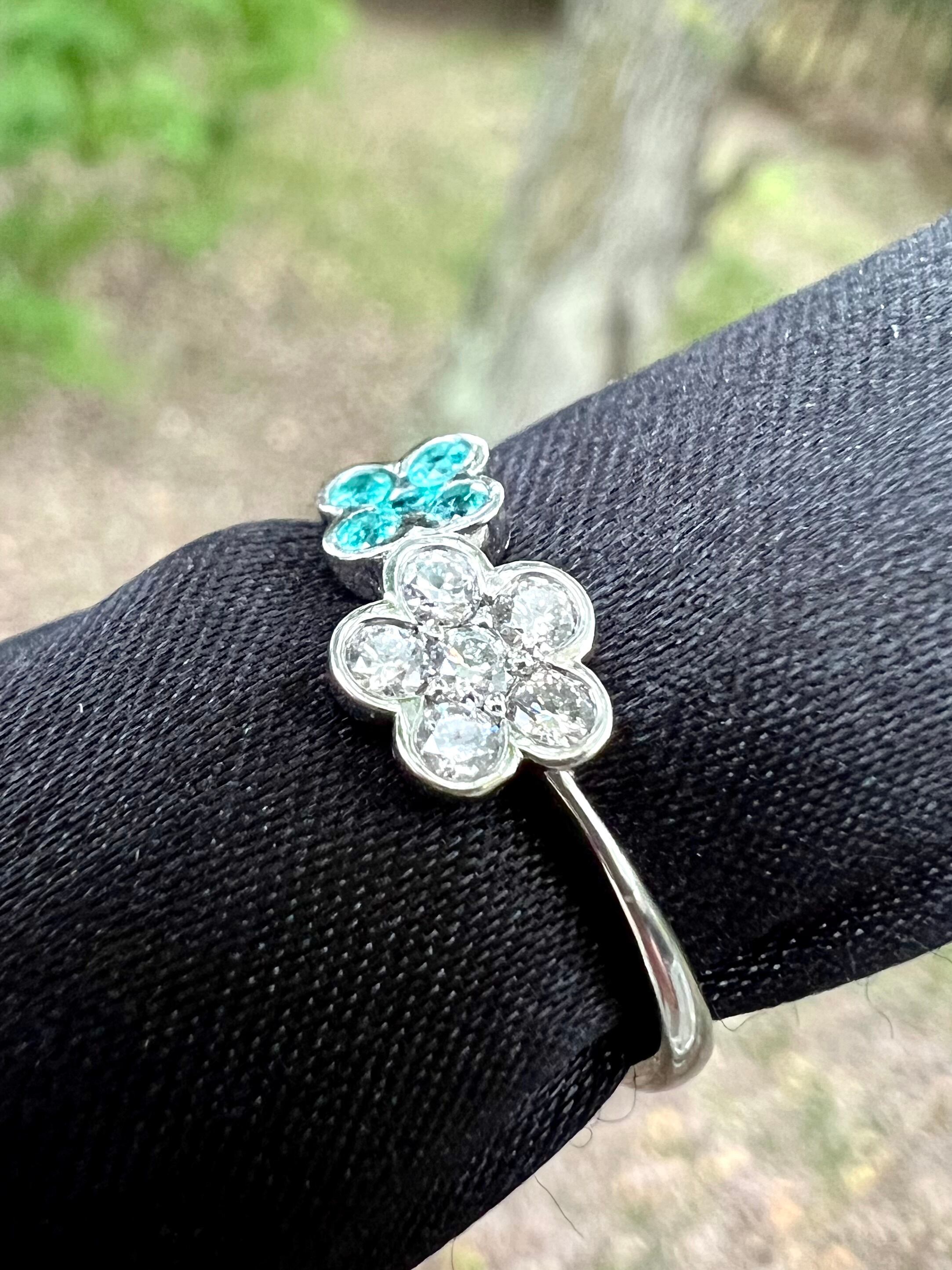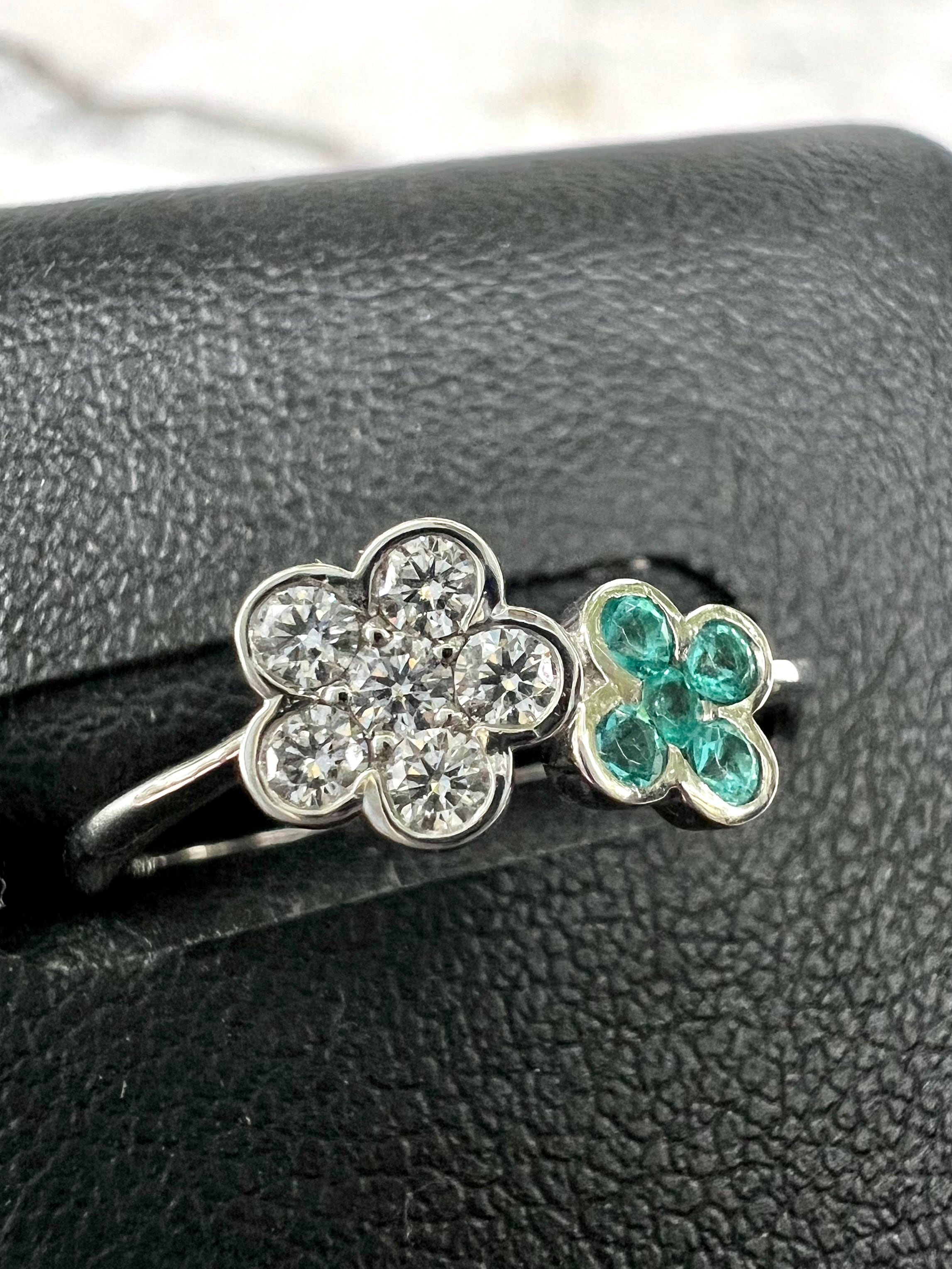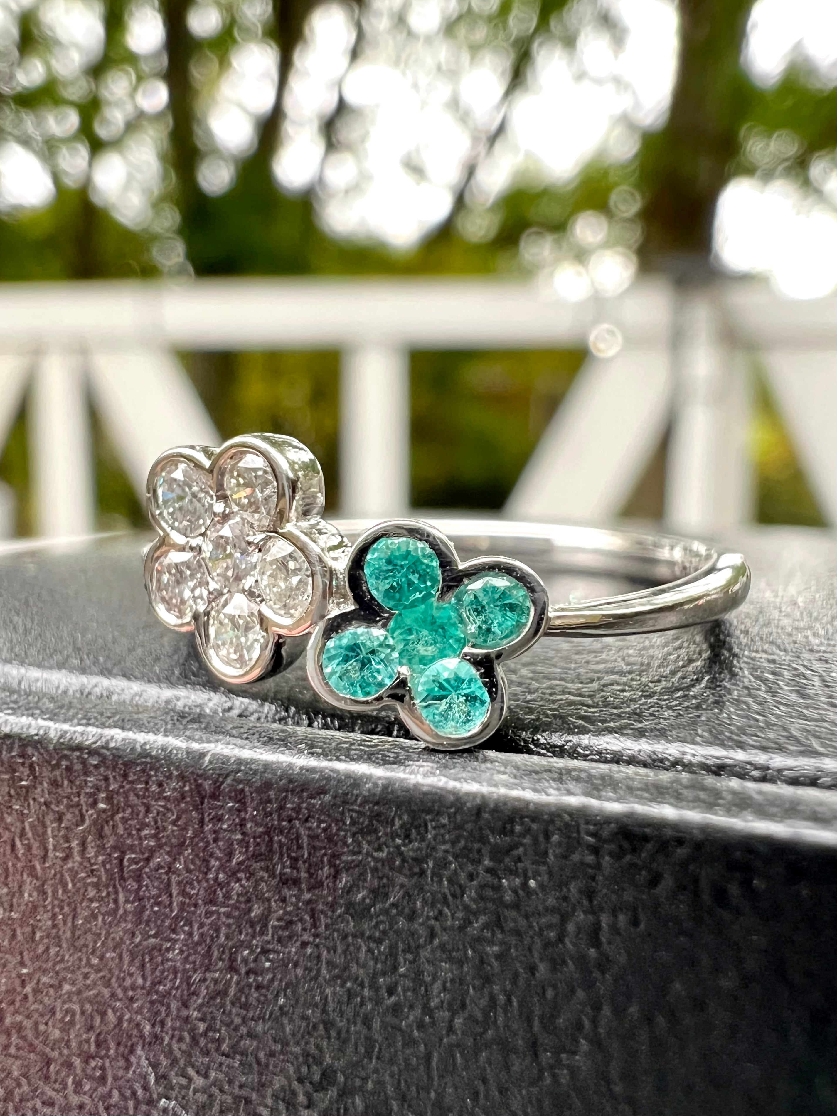 H&Cダイヤで作られた桜のような5枚の花びらのお花のお隣にに5粒のパライバで作られた四つ葉のクローバーを添えられた超絶可愛いリングですっ!