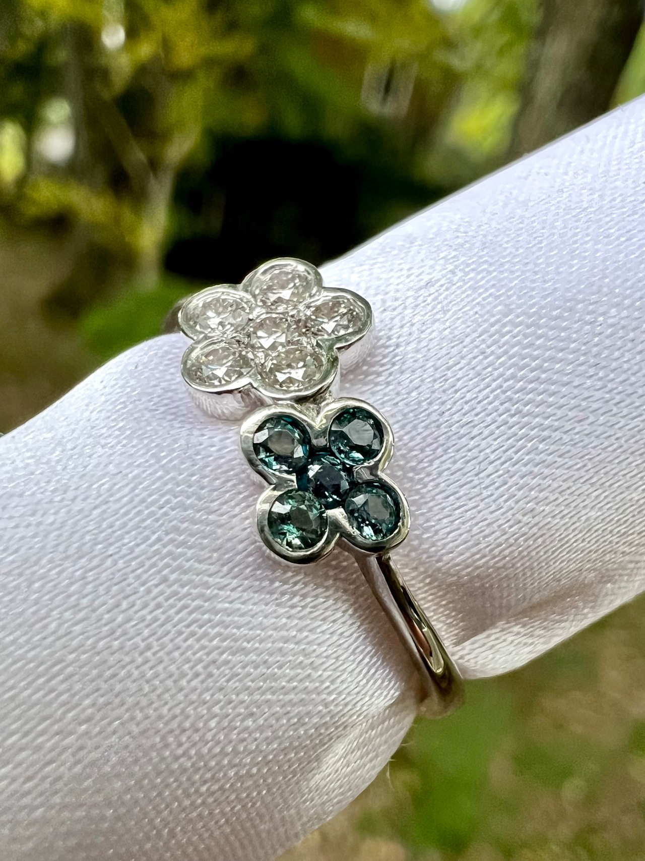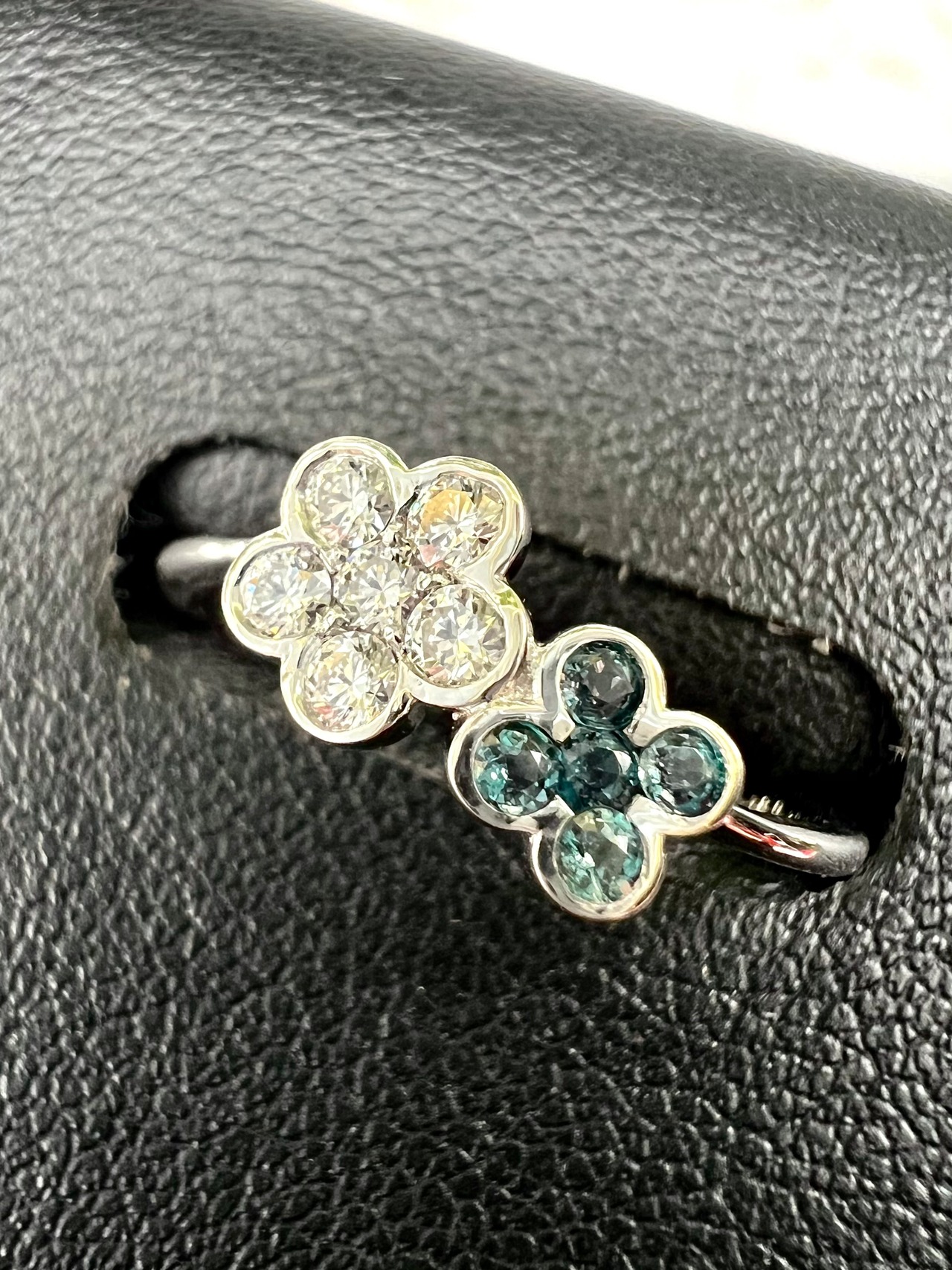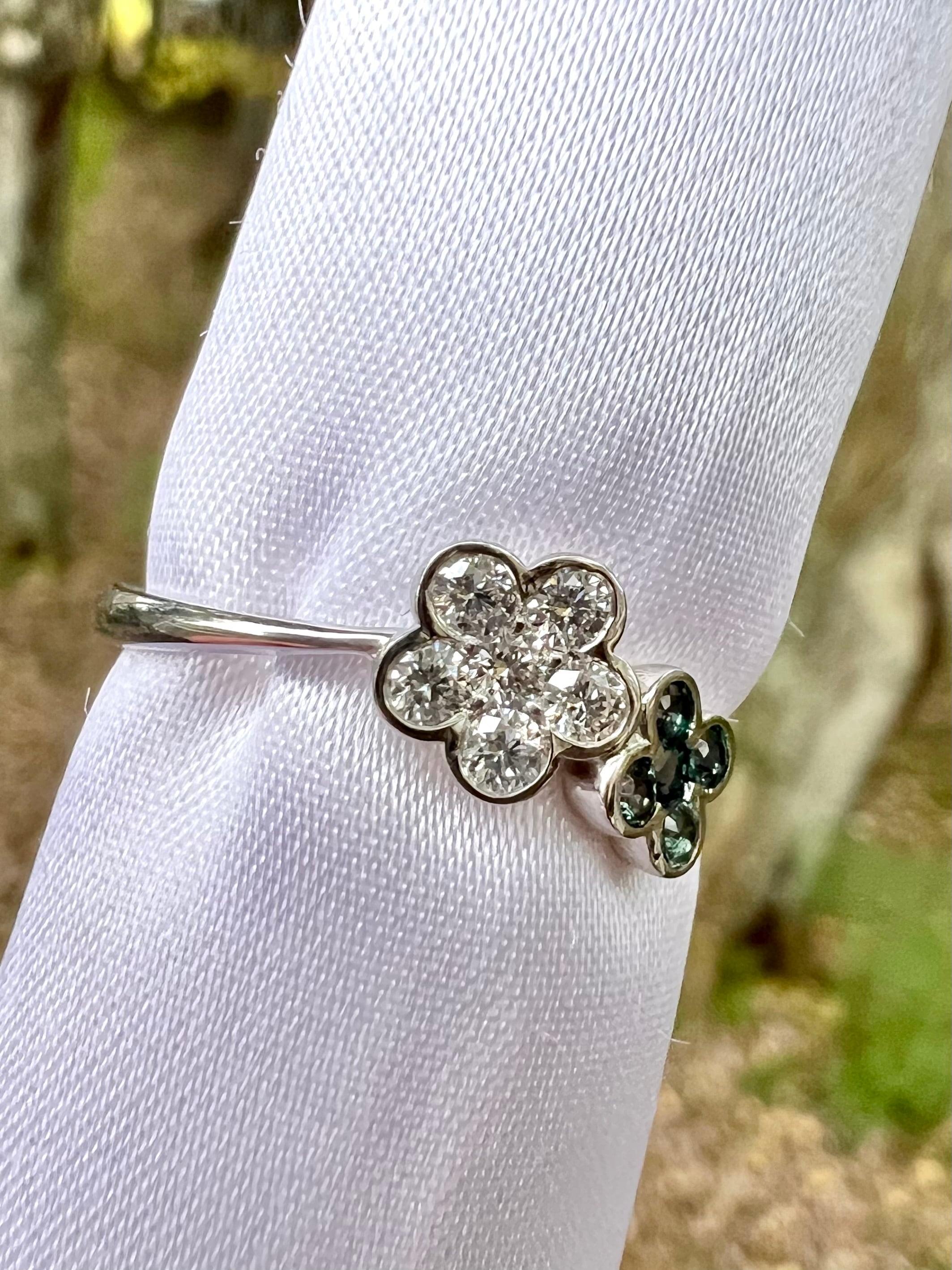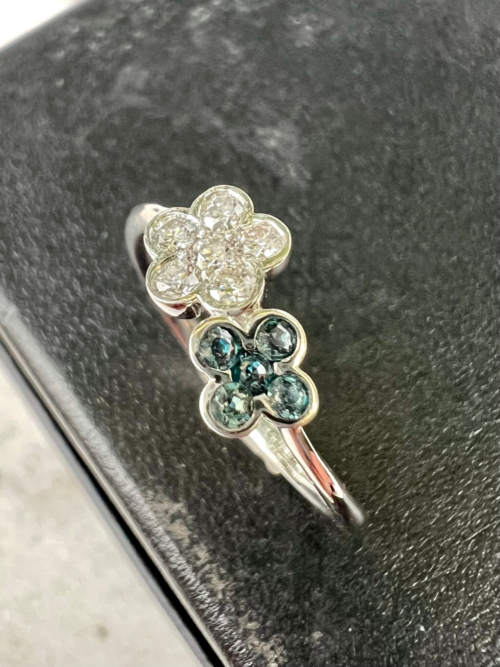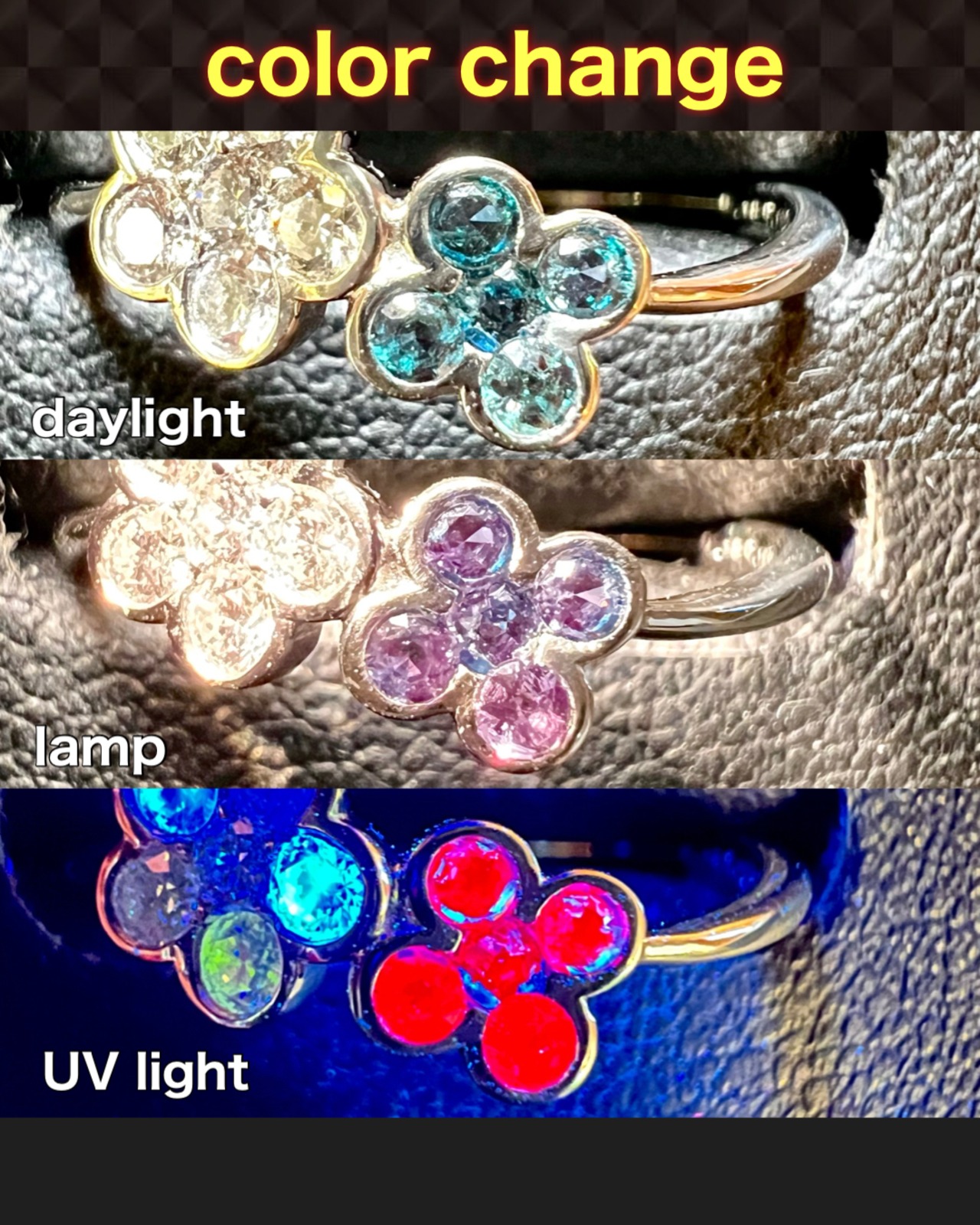 H&Cダイヤで作られた桜のような5枚の花びらのお花のお隣にに5粒のアレキサンドライトで作られた四つ葉のクローバーを添えられた超絶可愛いリングですっ!