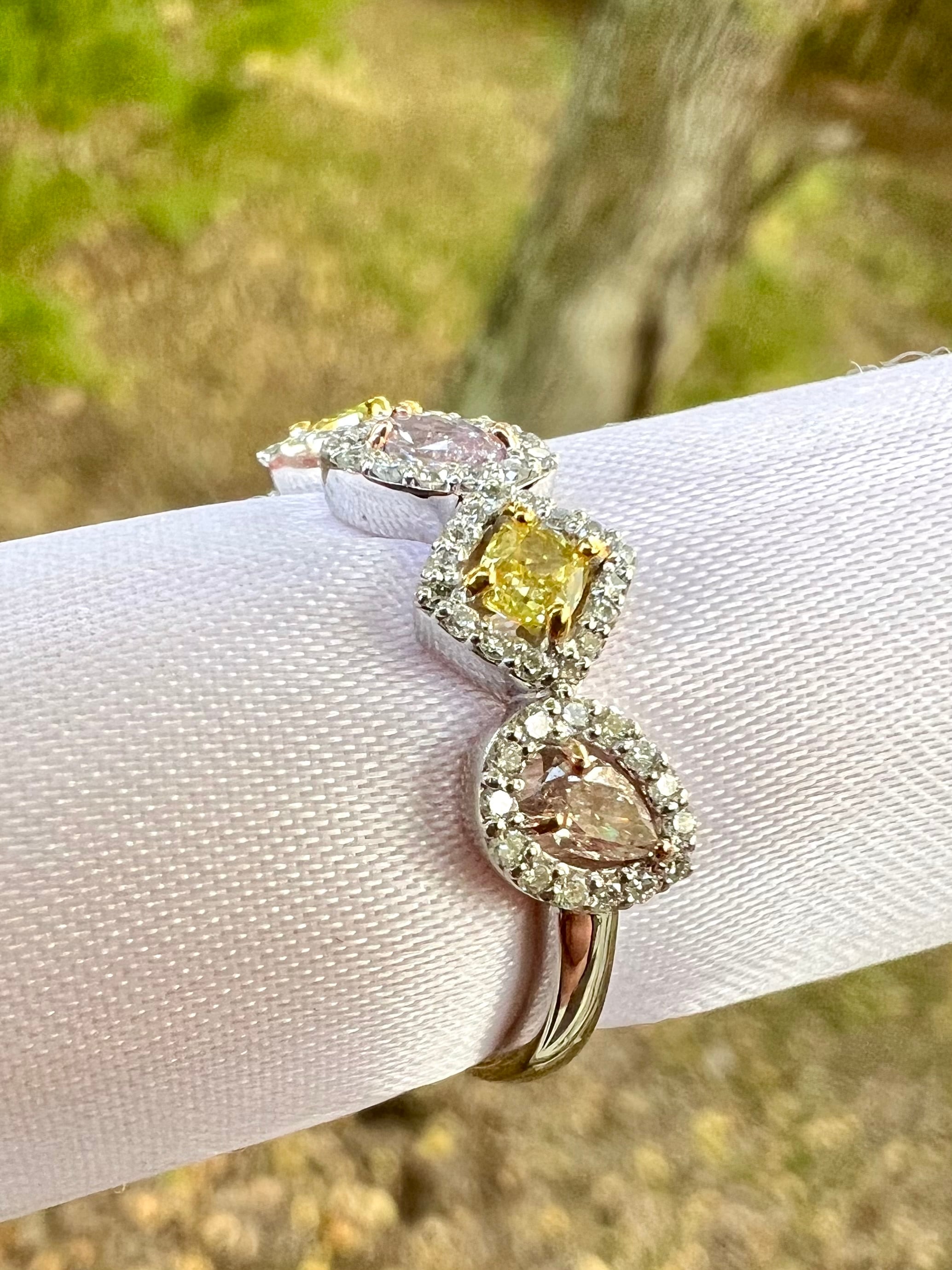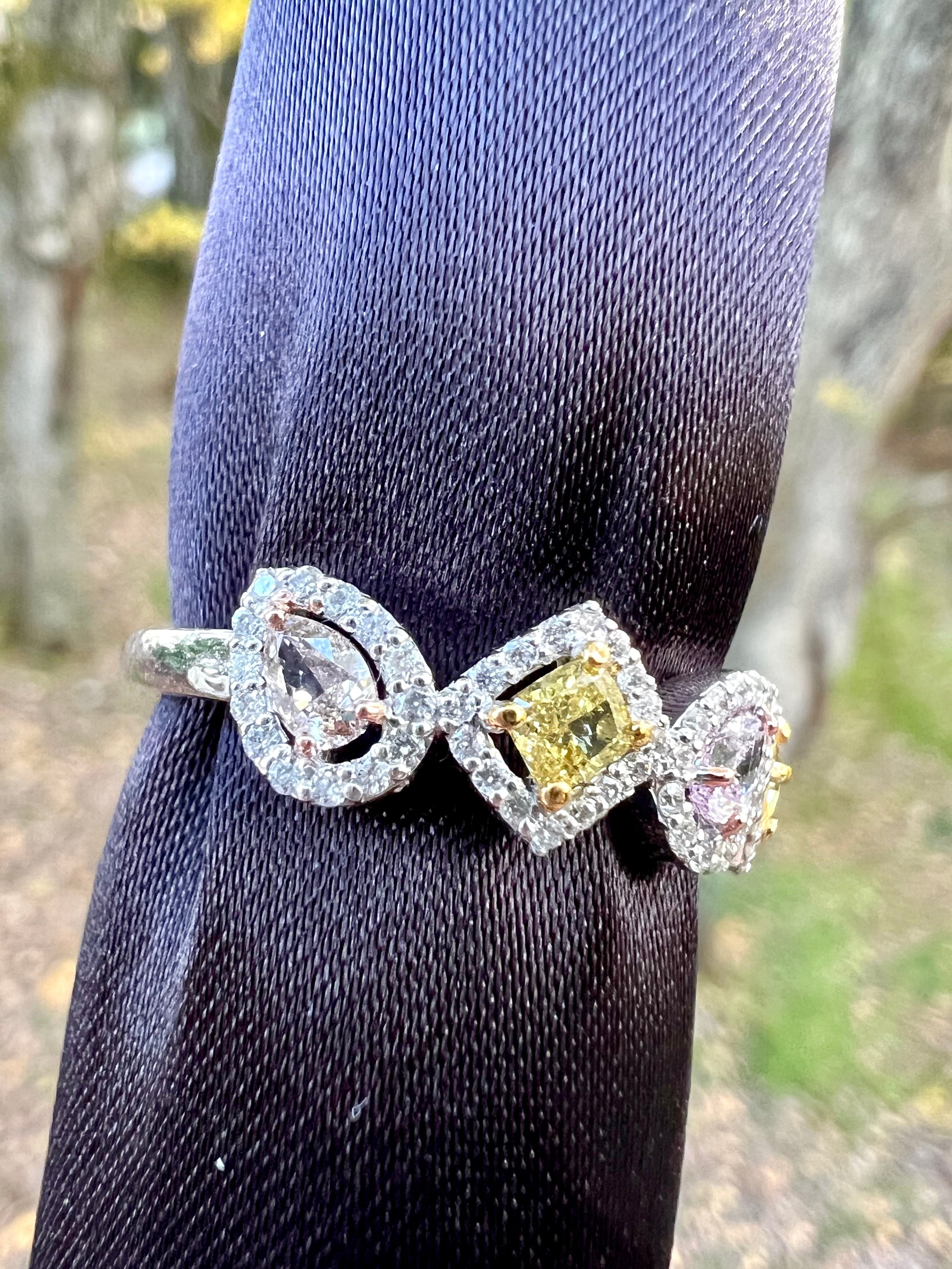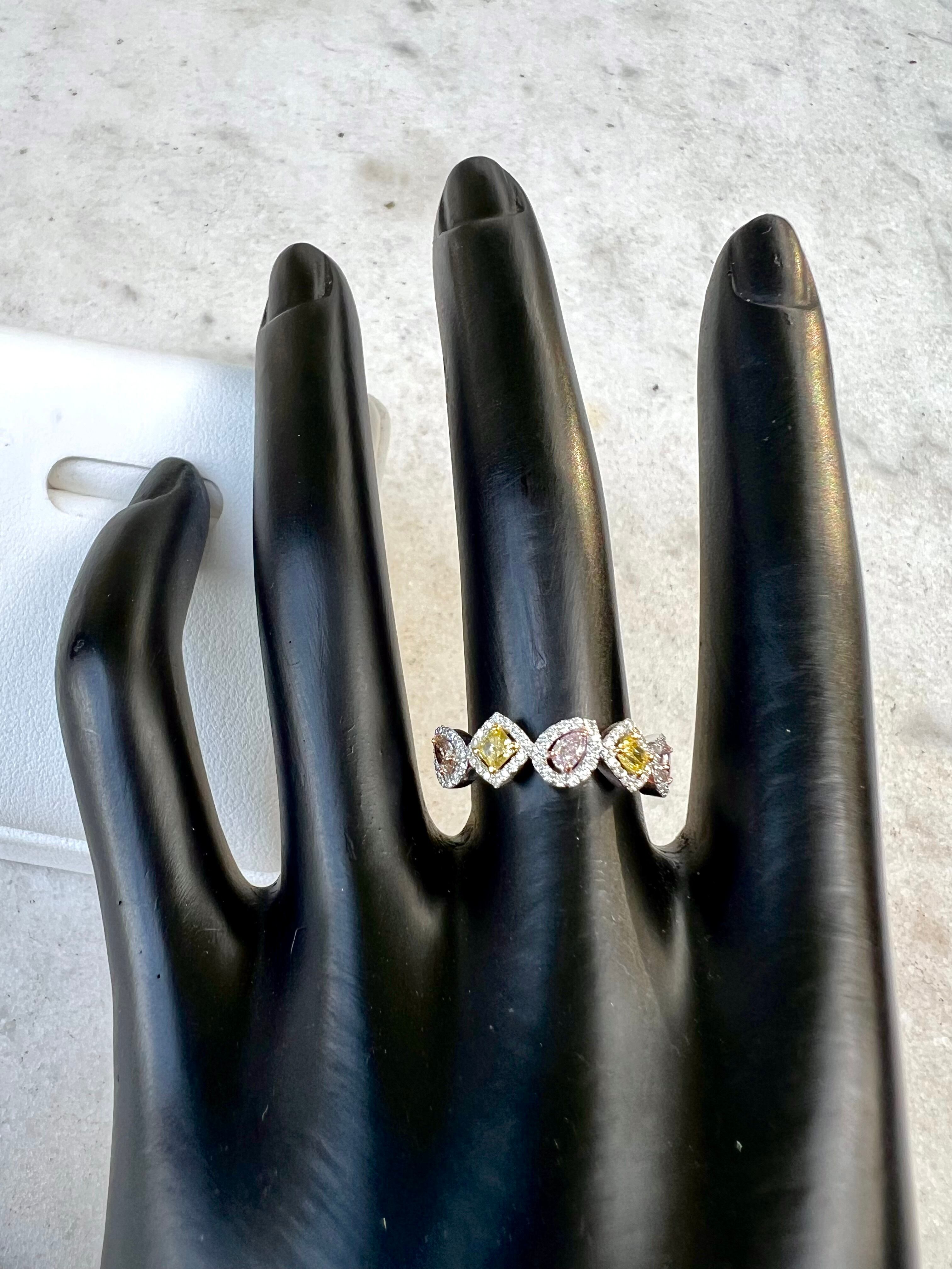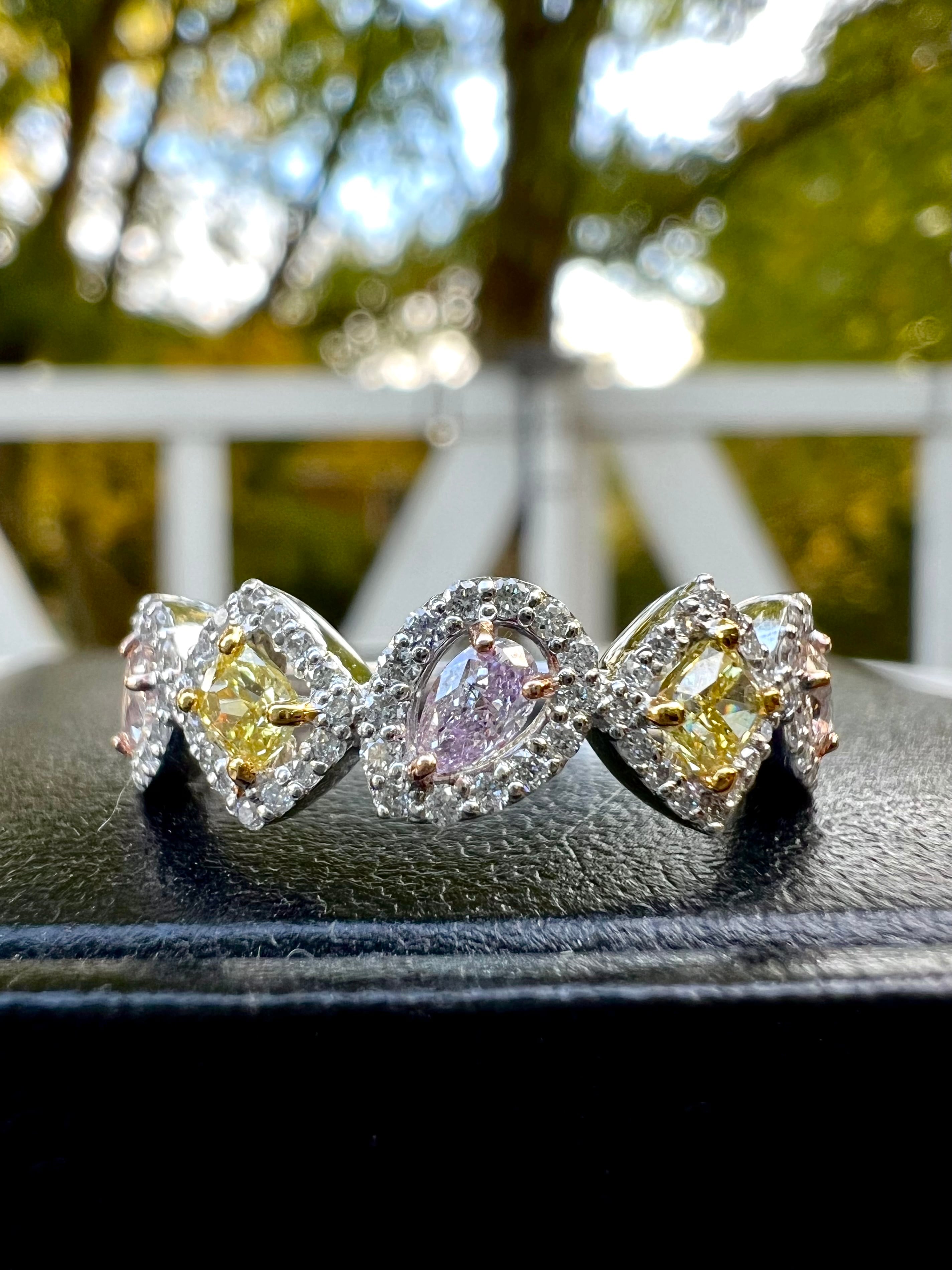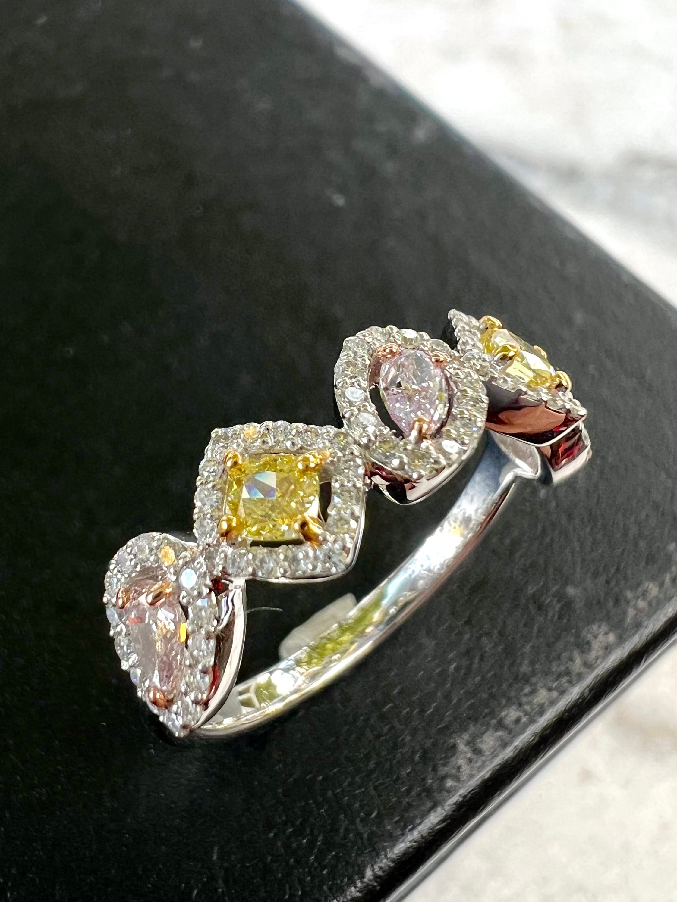 ピンク・イエローダイヤをダイヤモンドで取巻き5石並べた超可愛いゴージャスリングです!