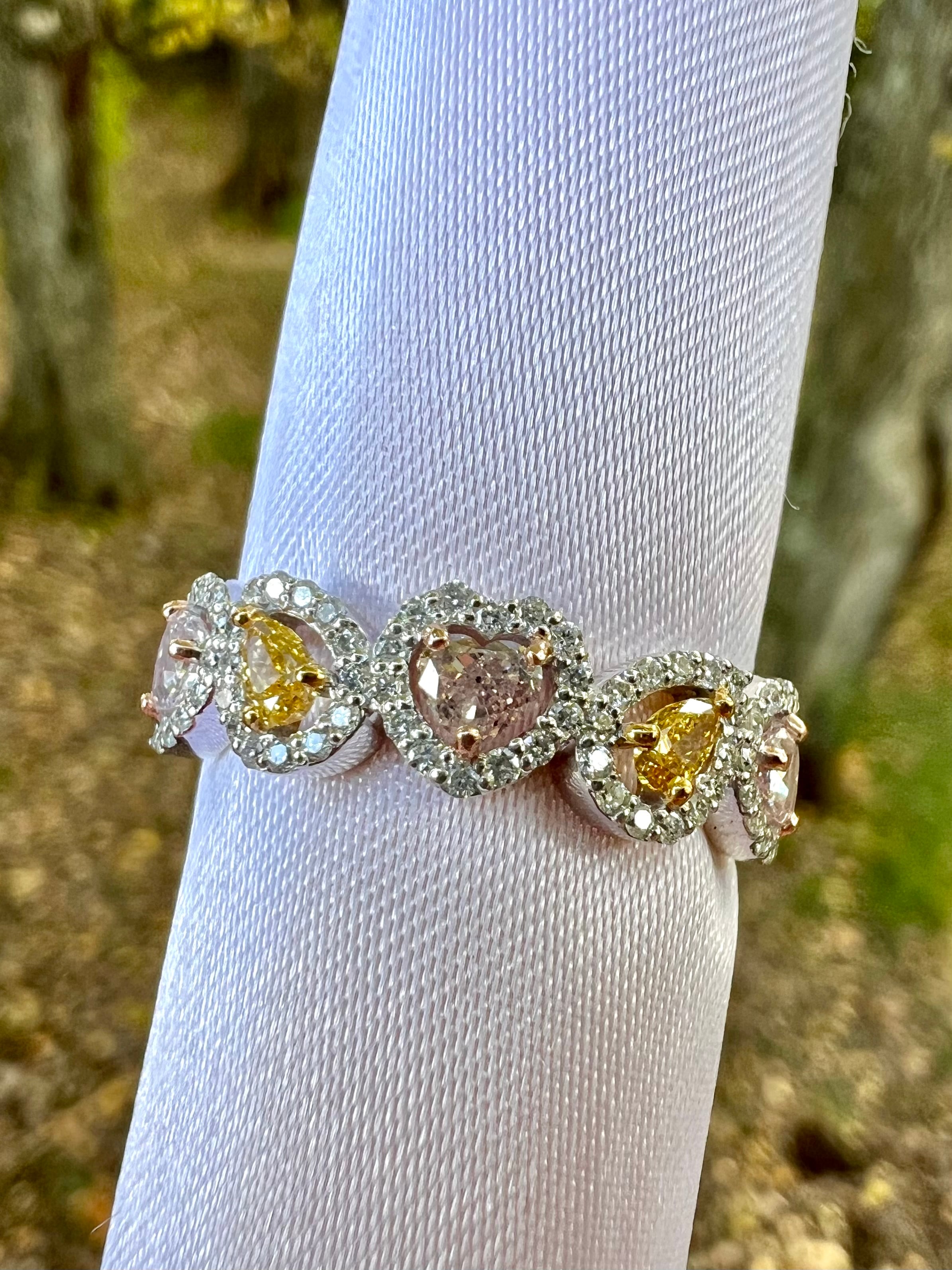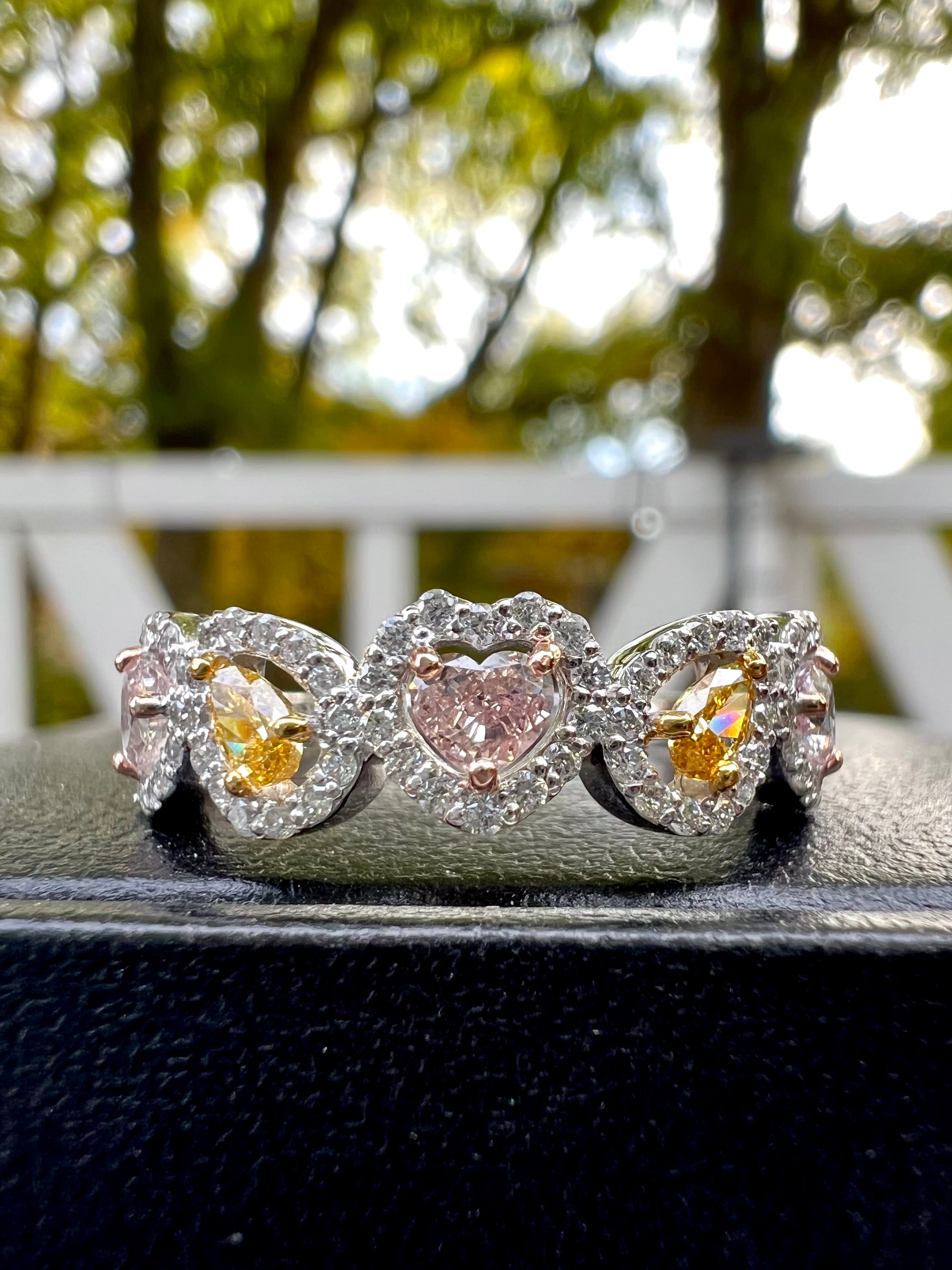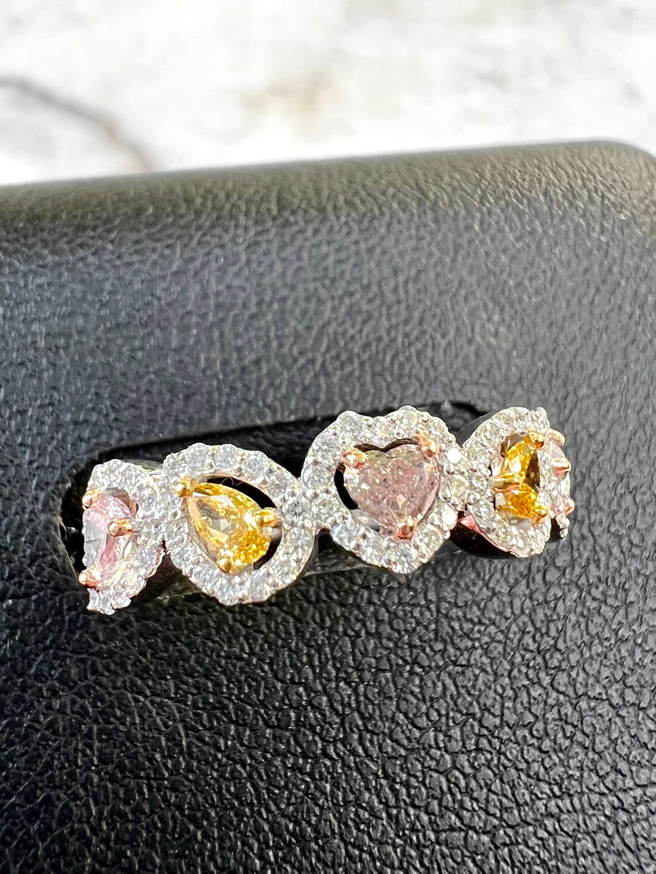 ピンク・イエローダイヤをダイヤモンドで取巻き5石並べた超可愛いゴージャスリングです!
