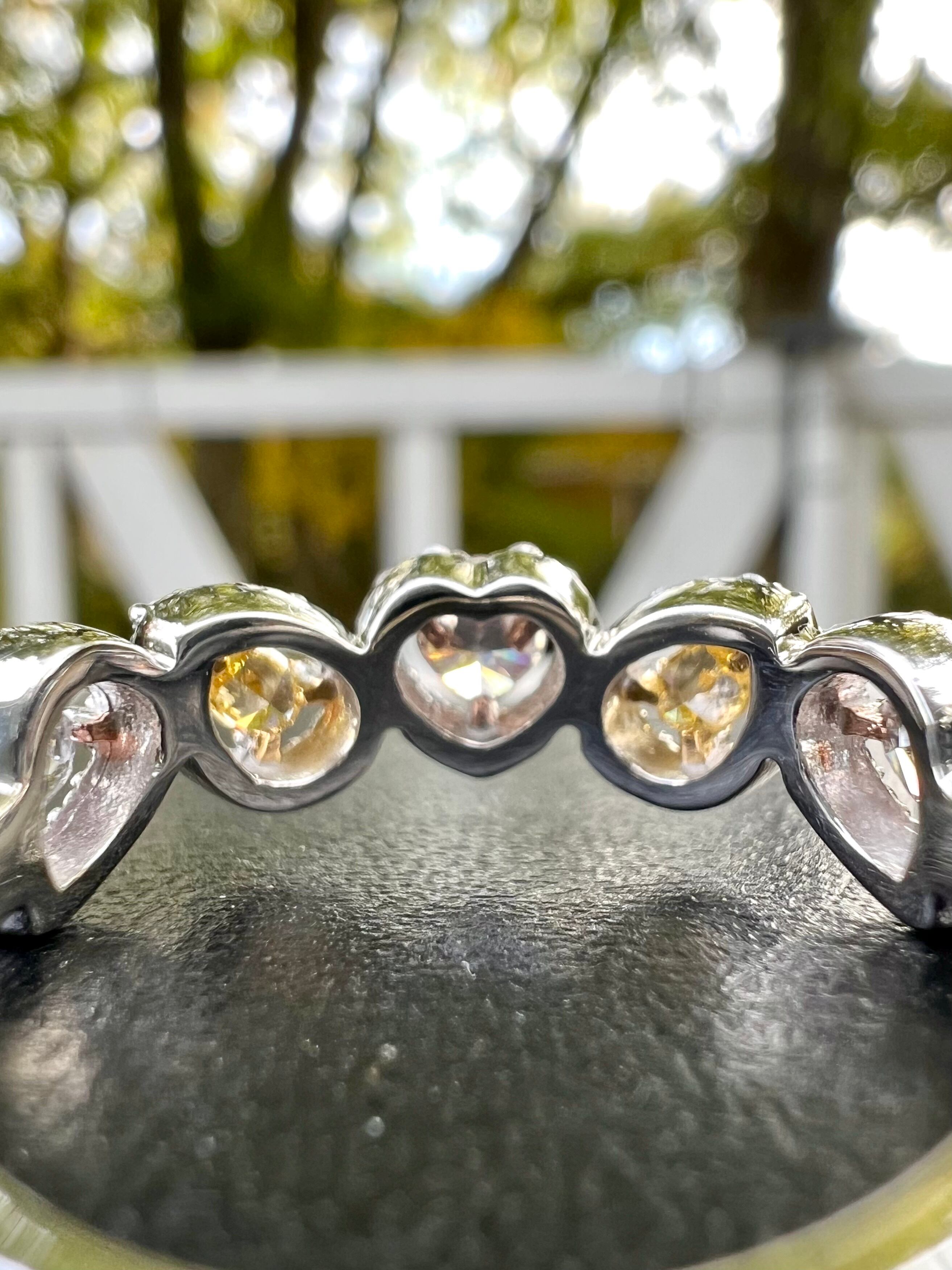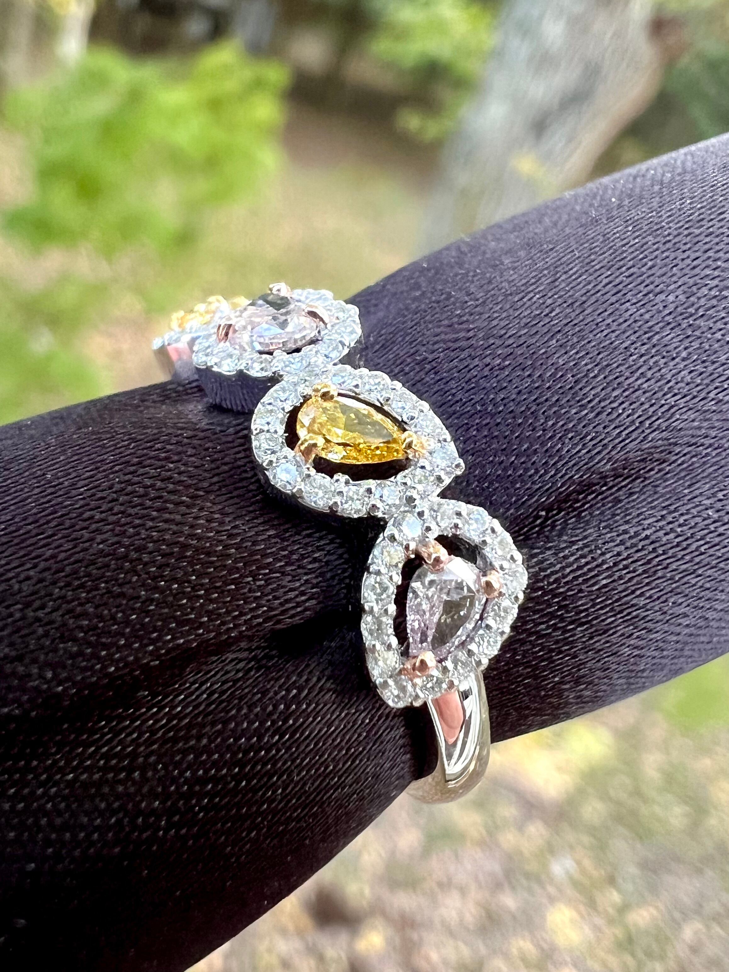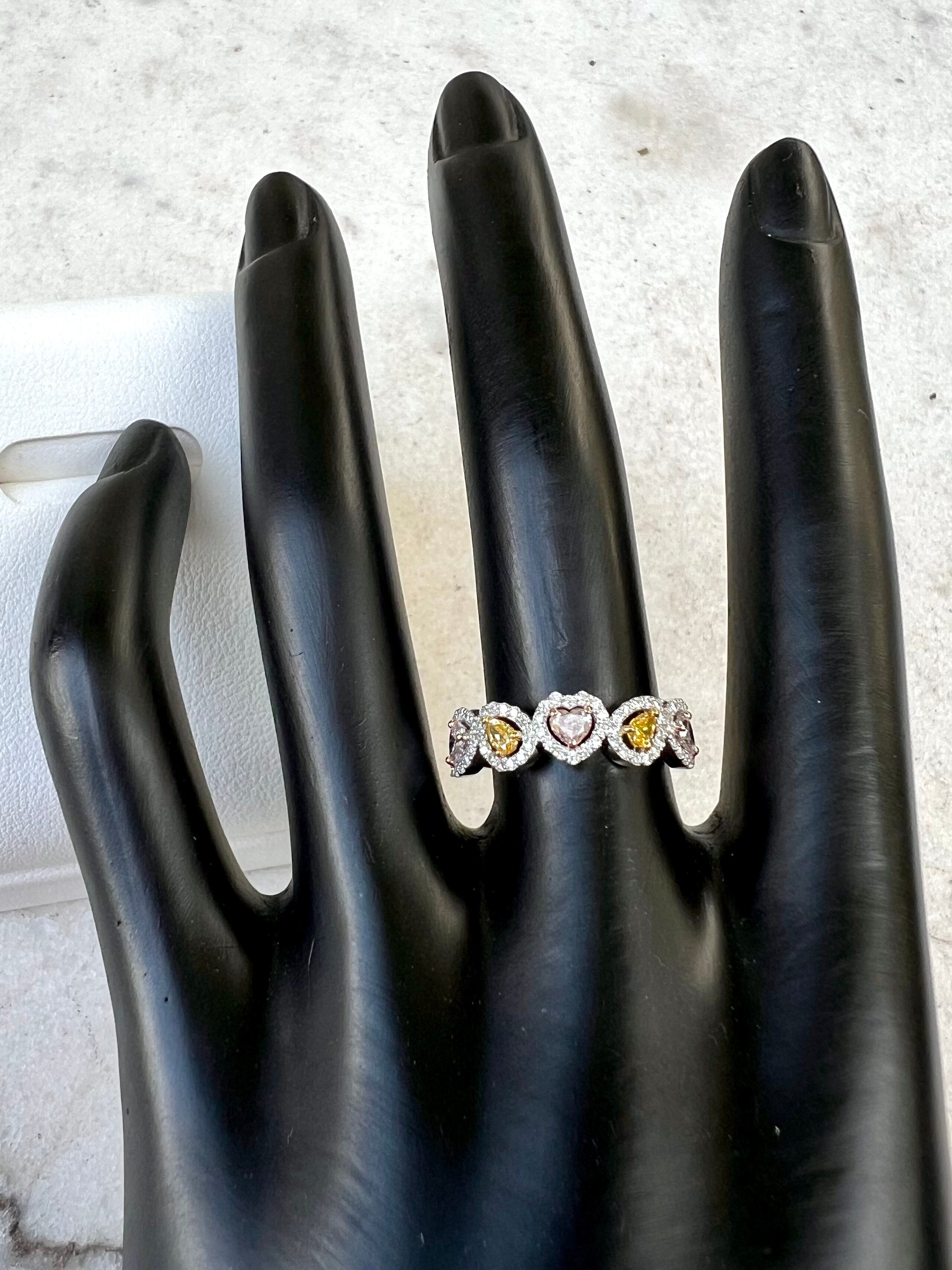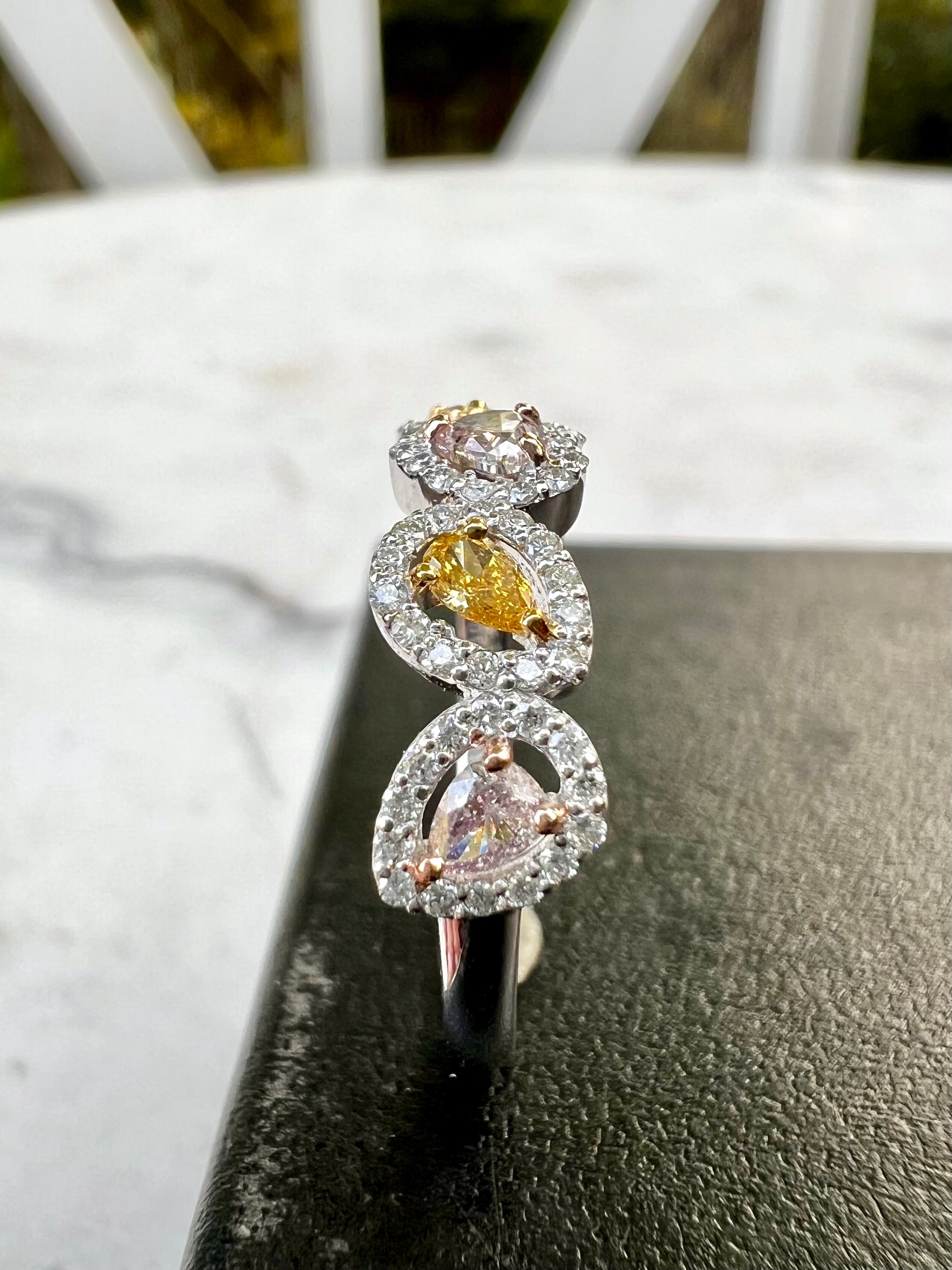 ピンク・イエローダイヤをダイヤモンドで取巻き5石並べた超可愛いゴージャスリングです!