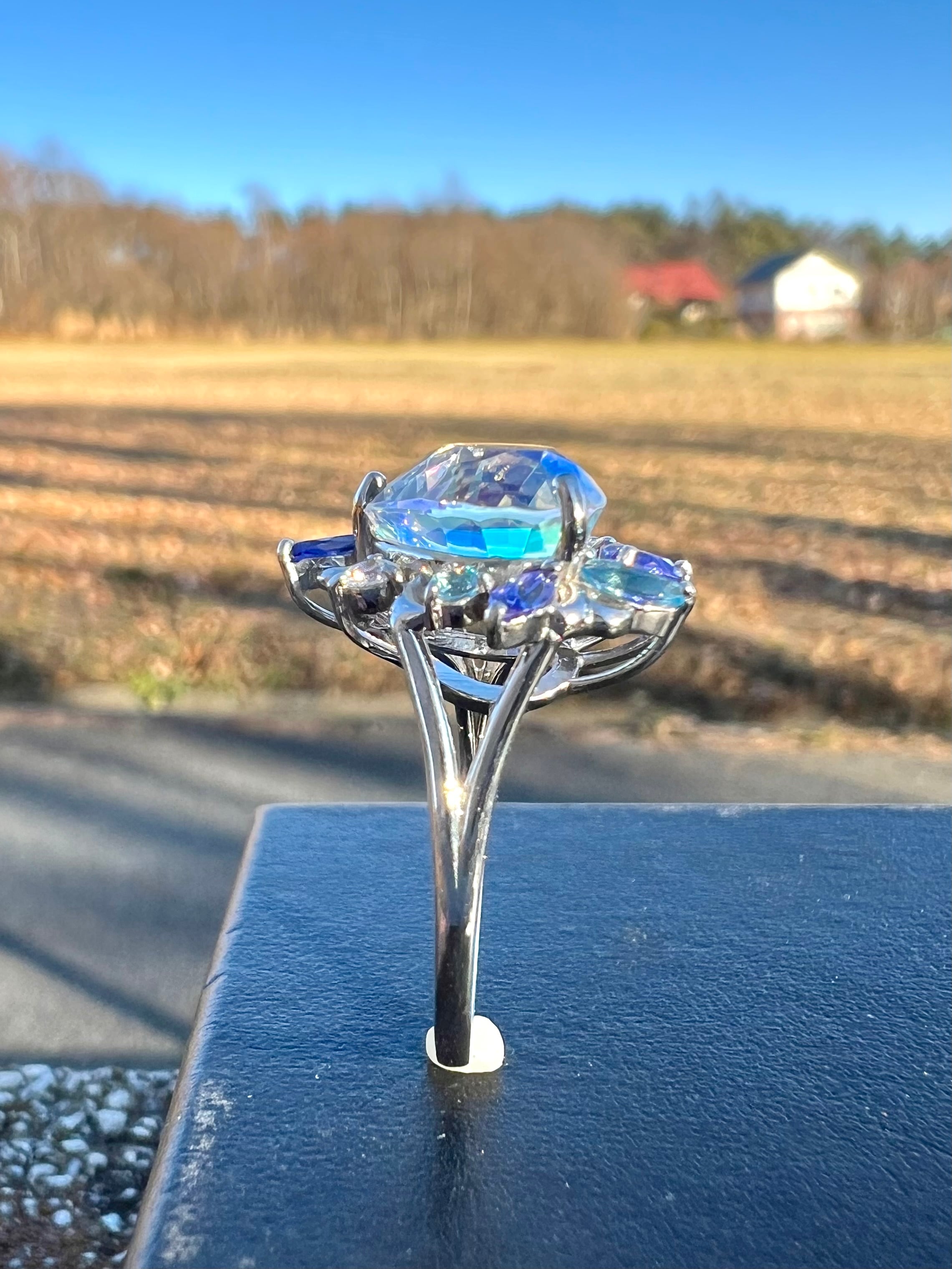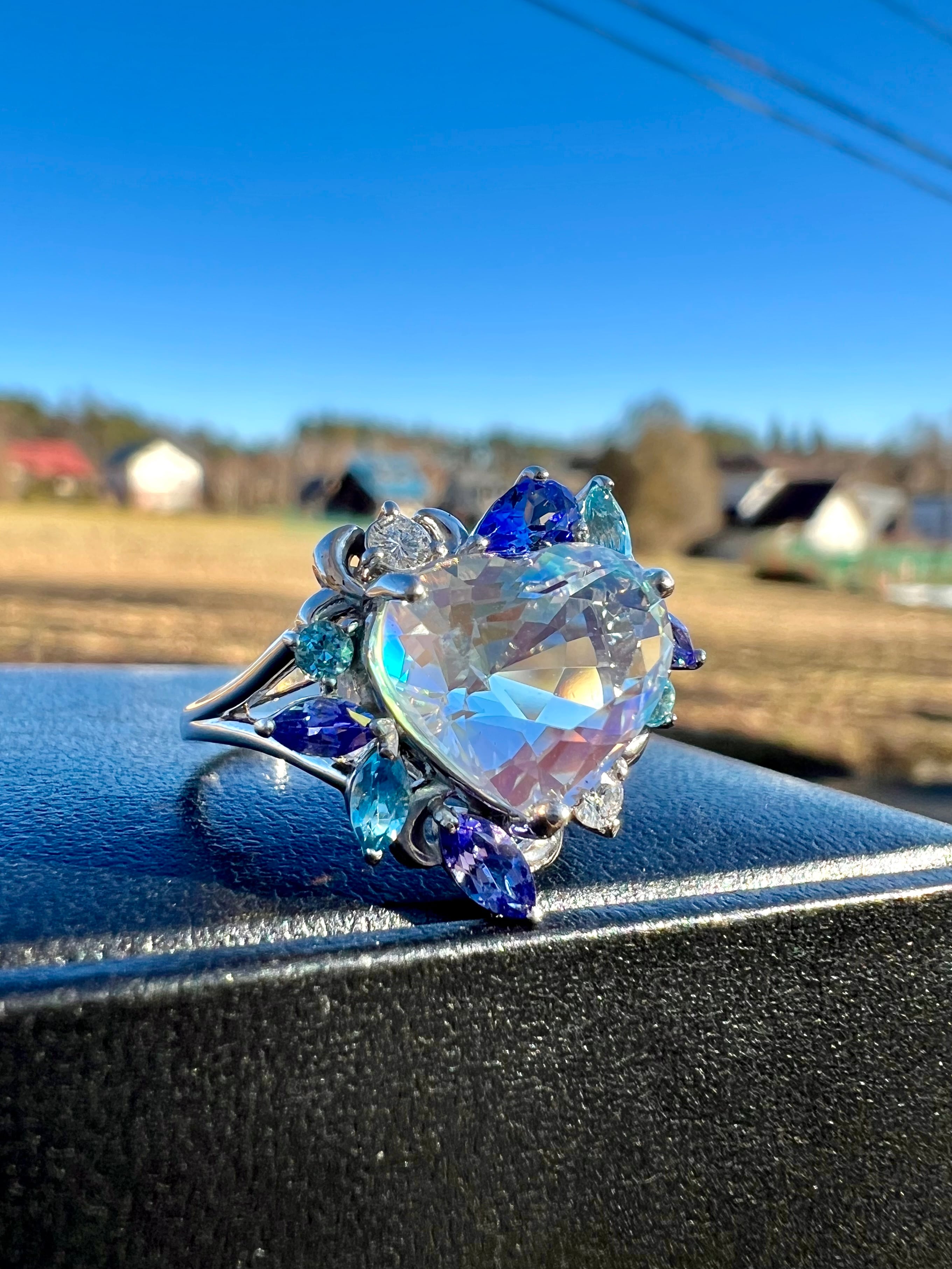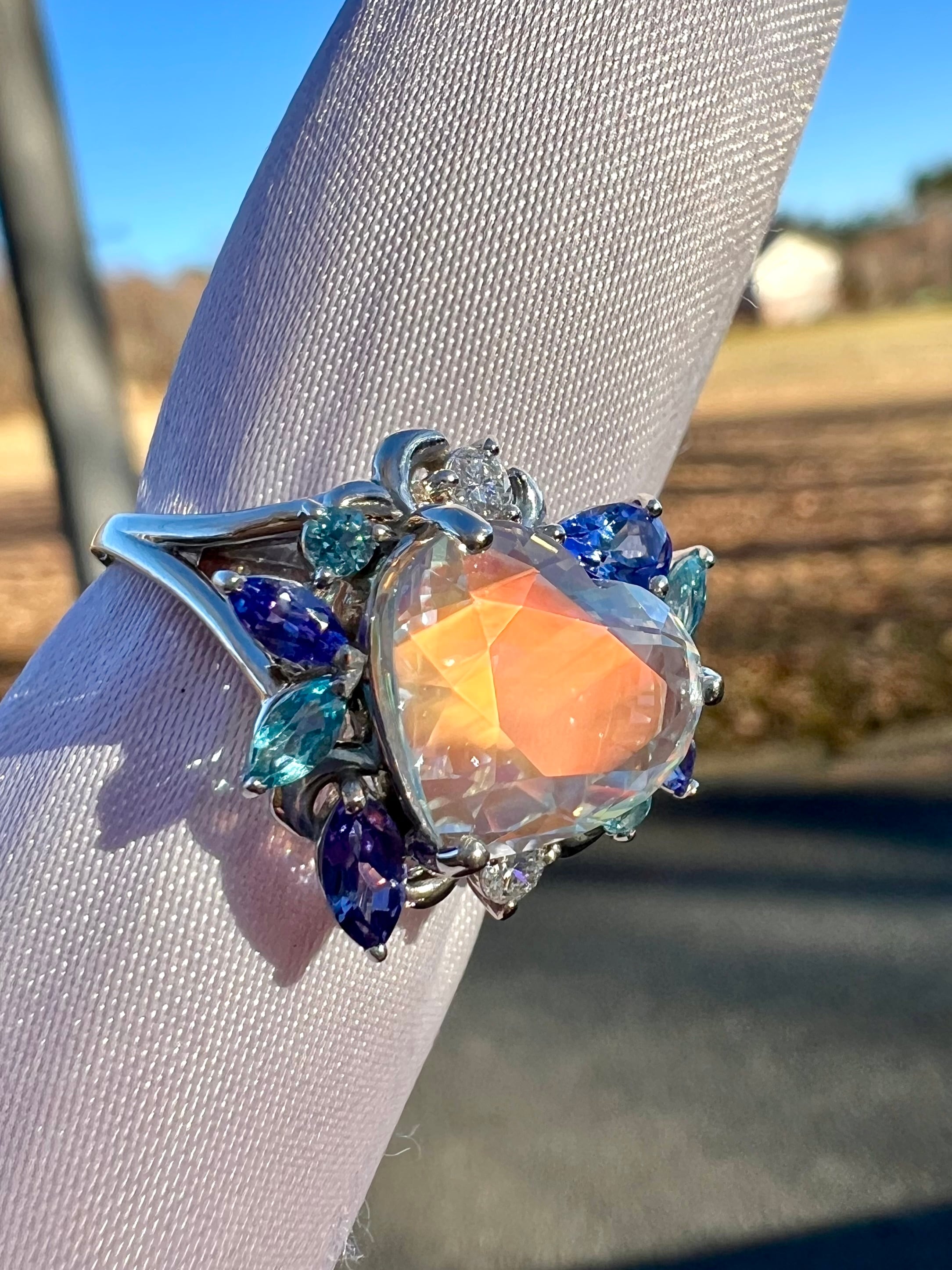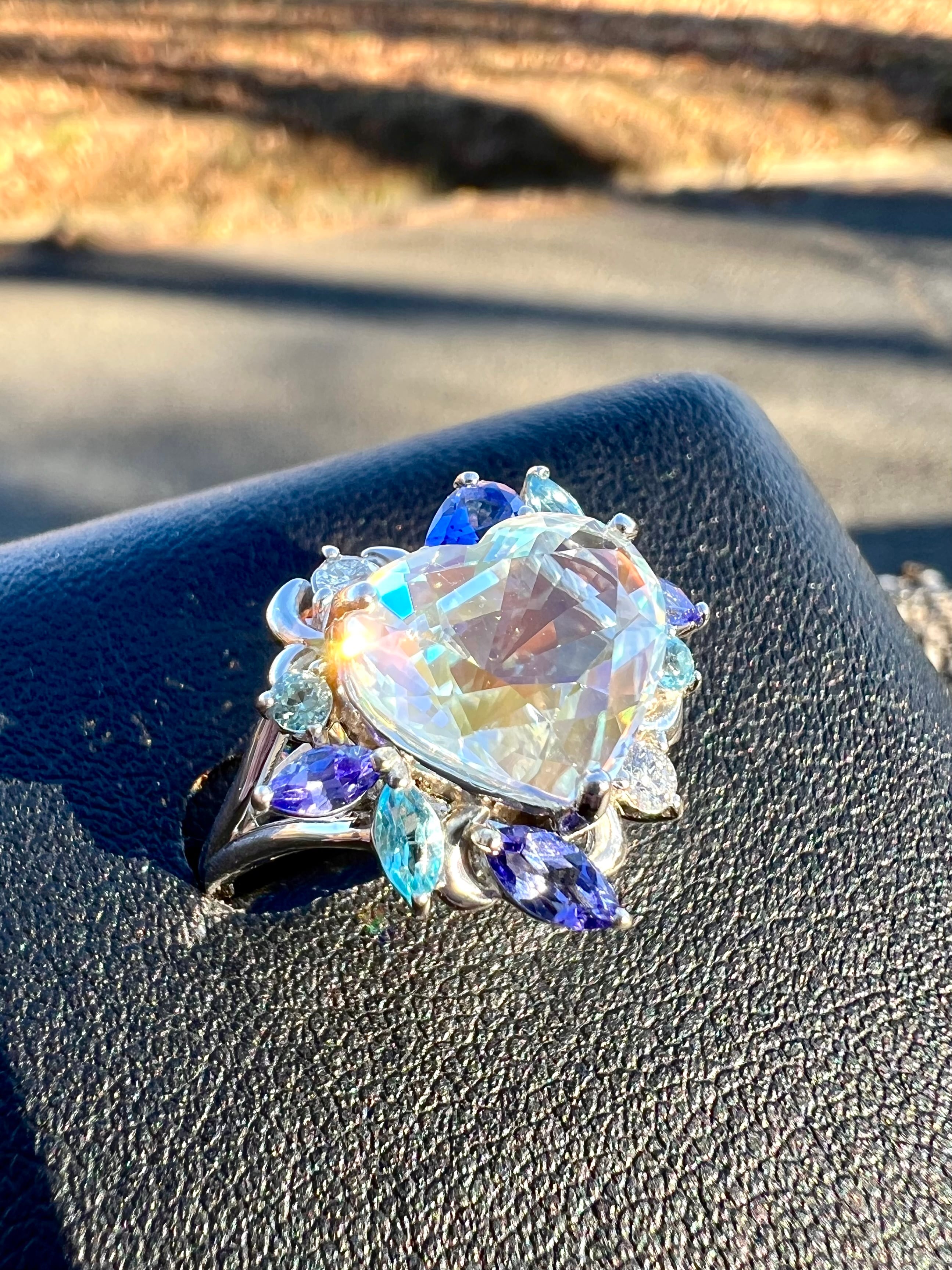 今回のデザインは様々な色の光を放つレインボームーンストーンの周りに色石を配置したとても可愛いリング!