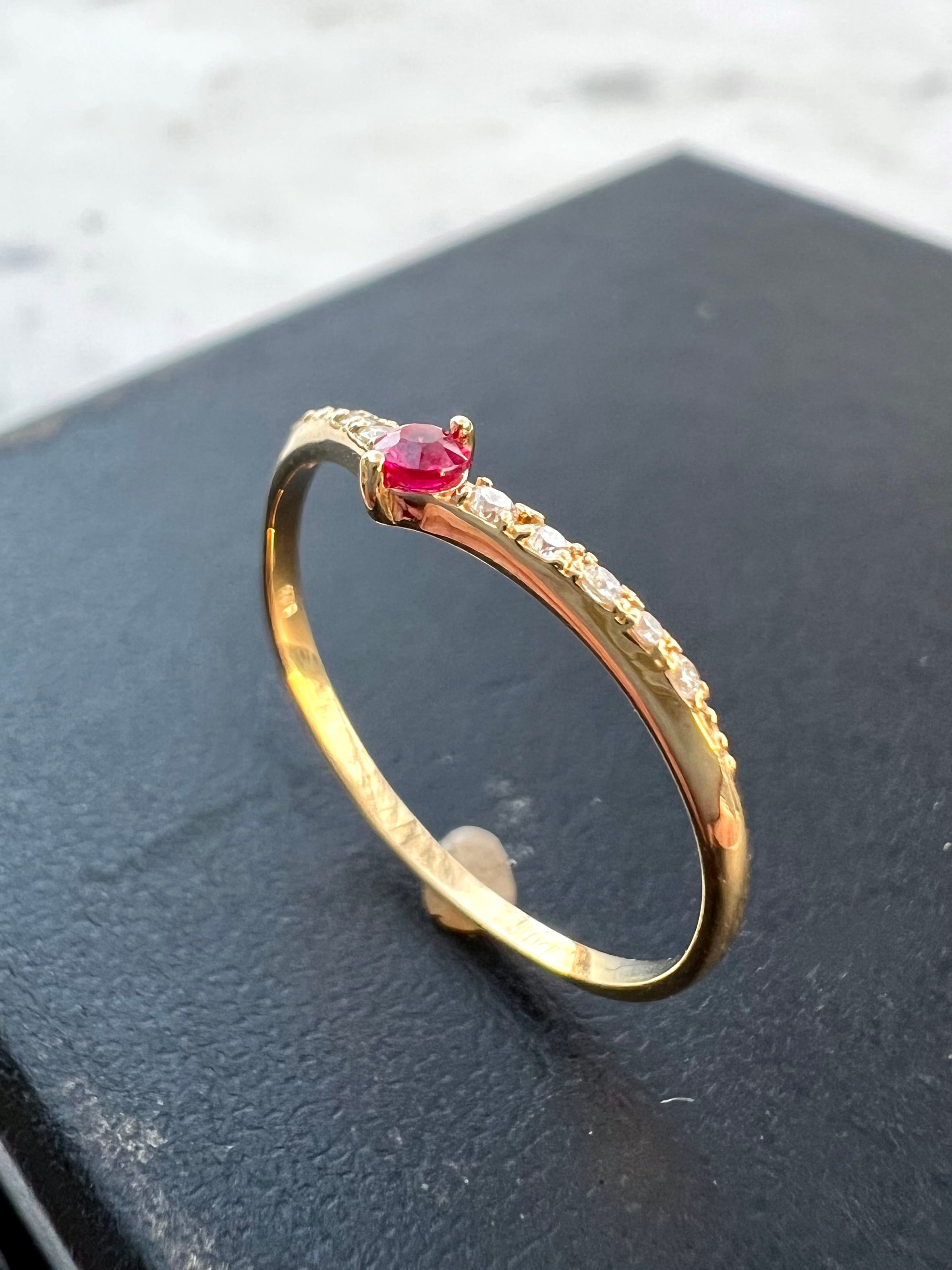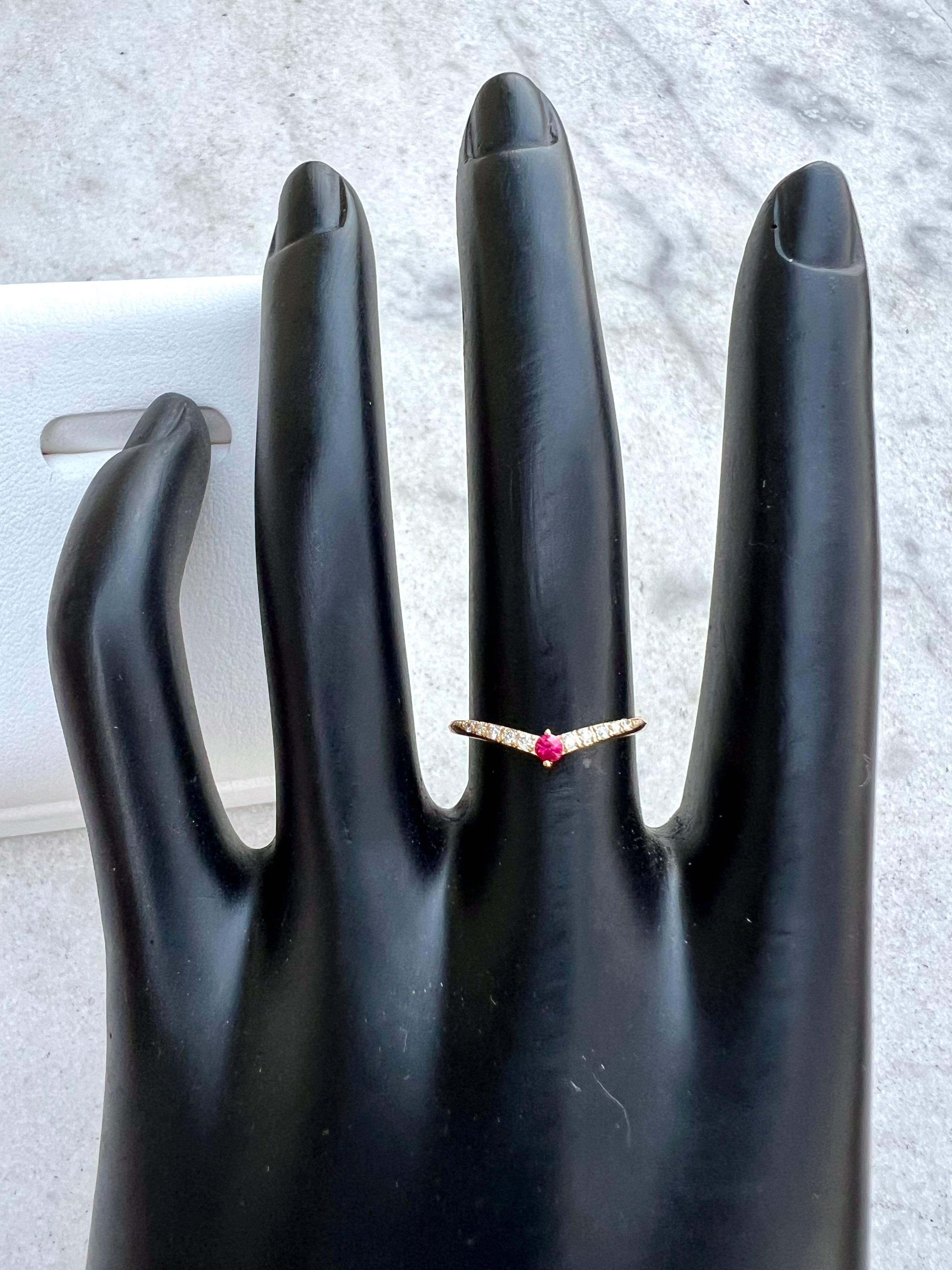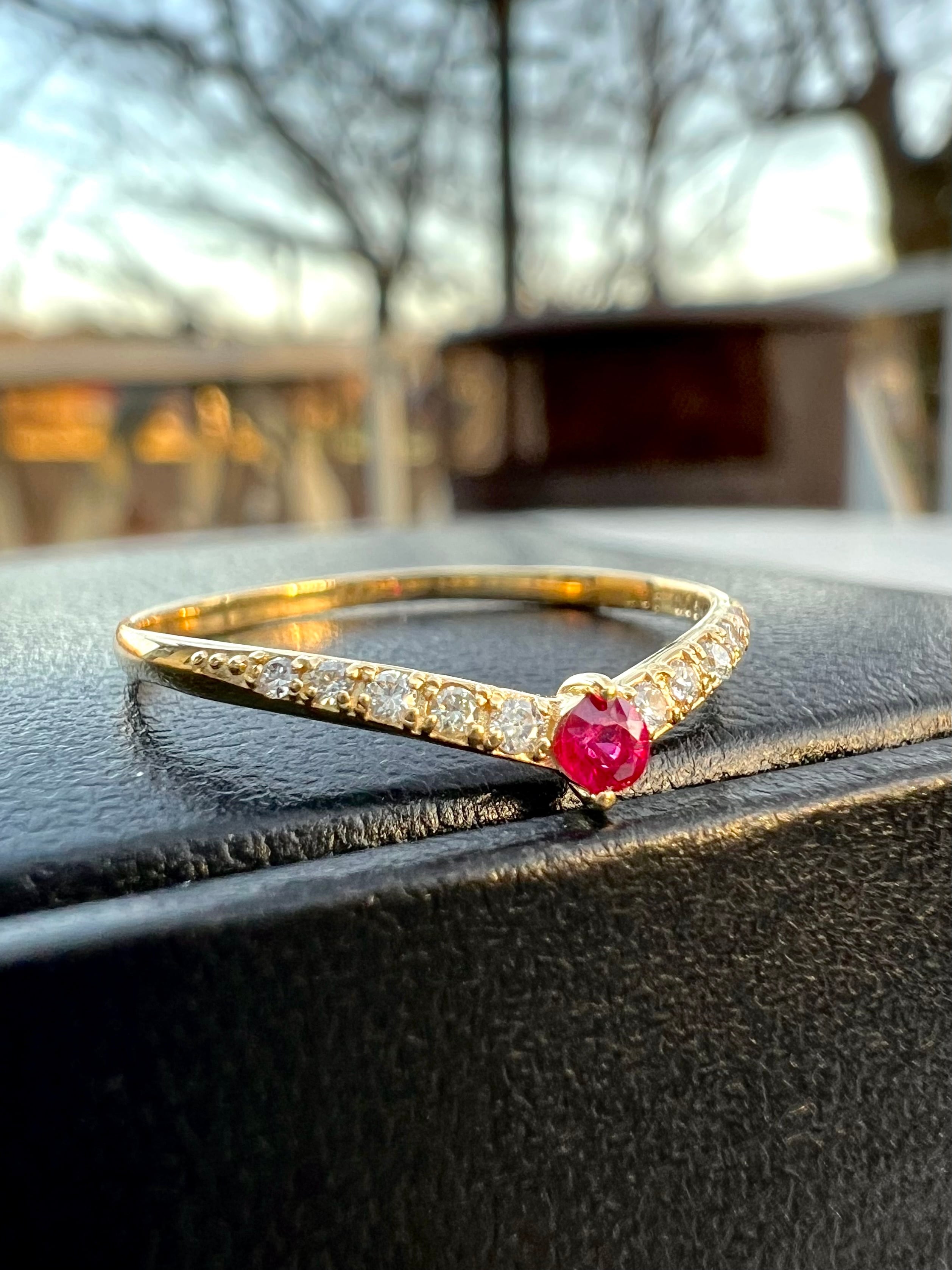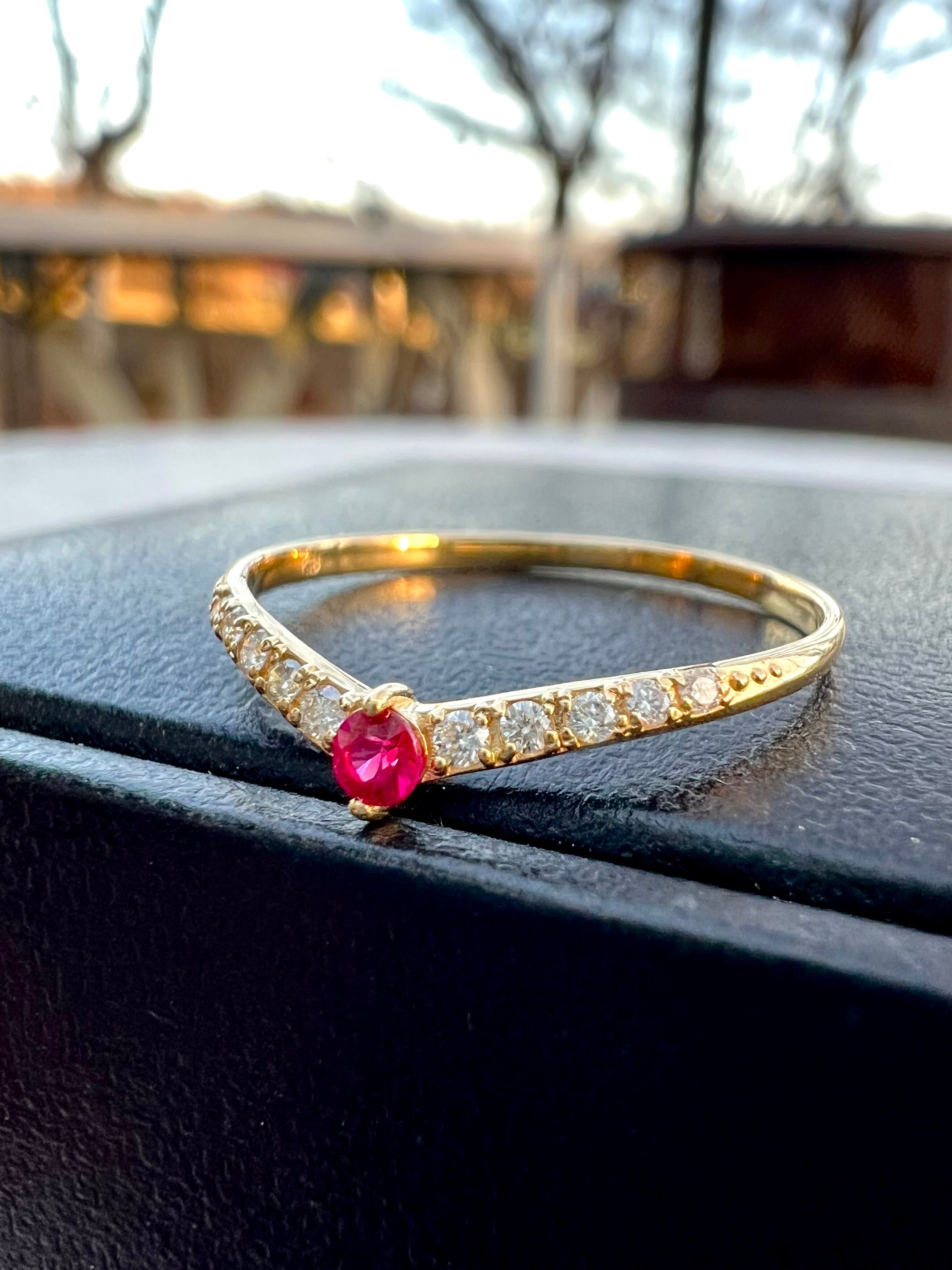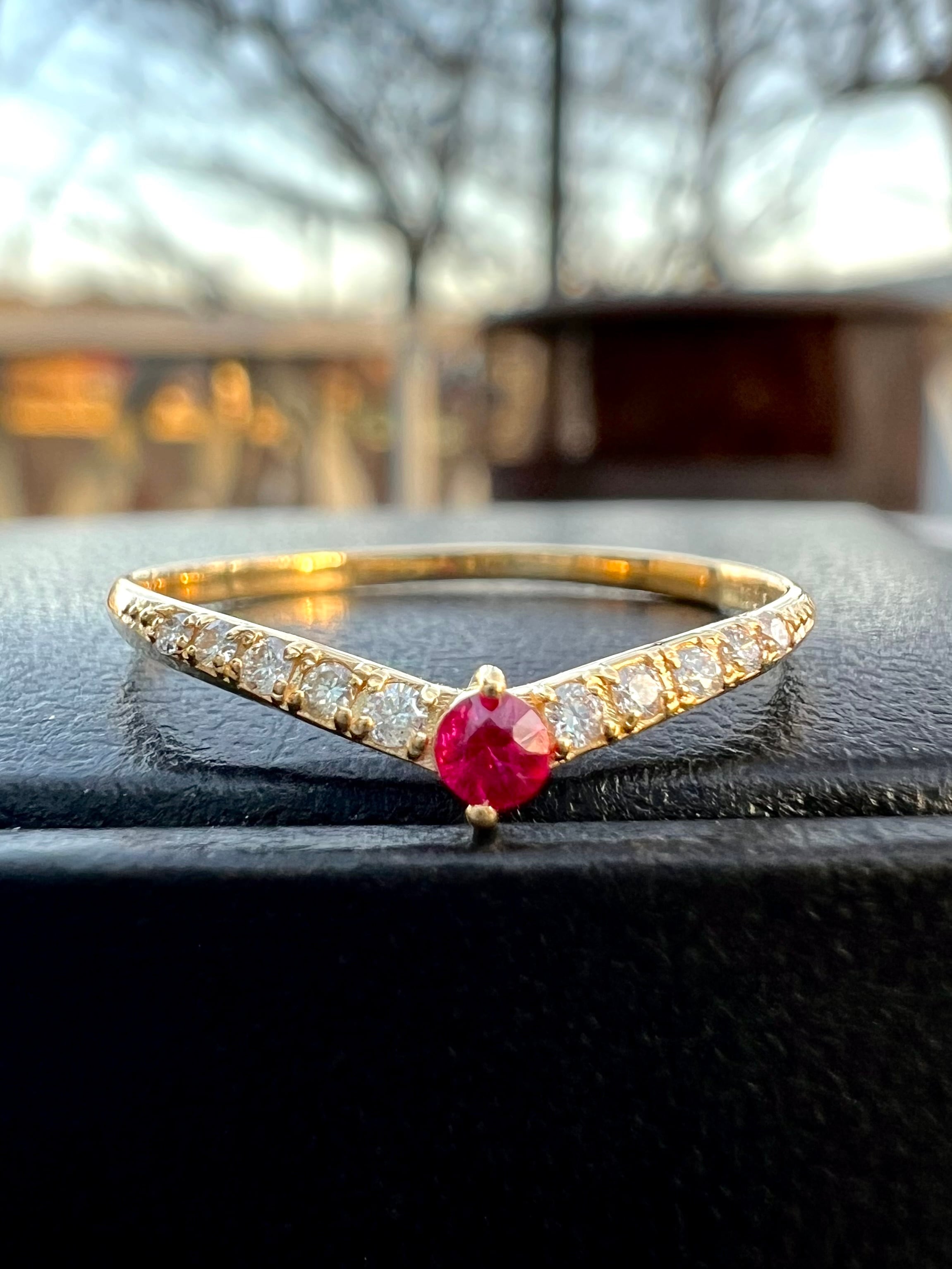 ルビーを1石センターにいれたV字のハーフエタニティリングです。