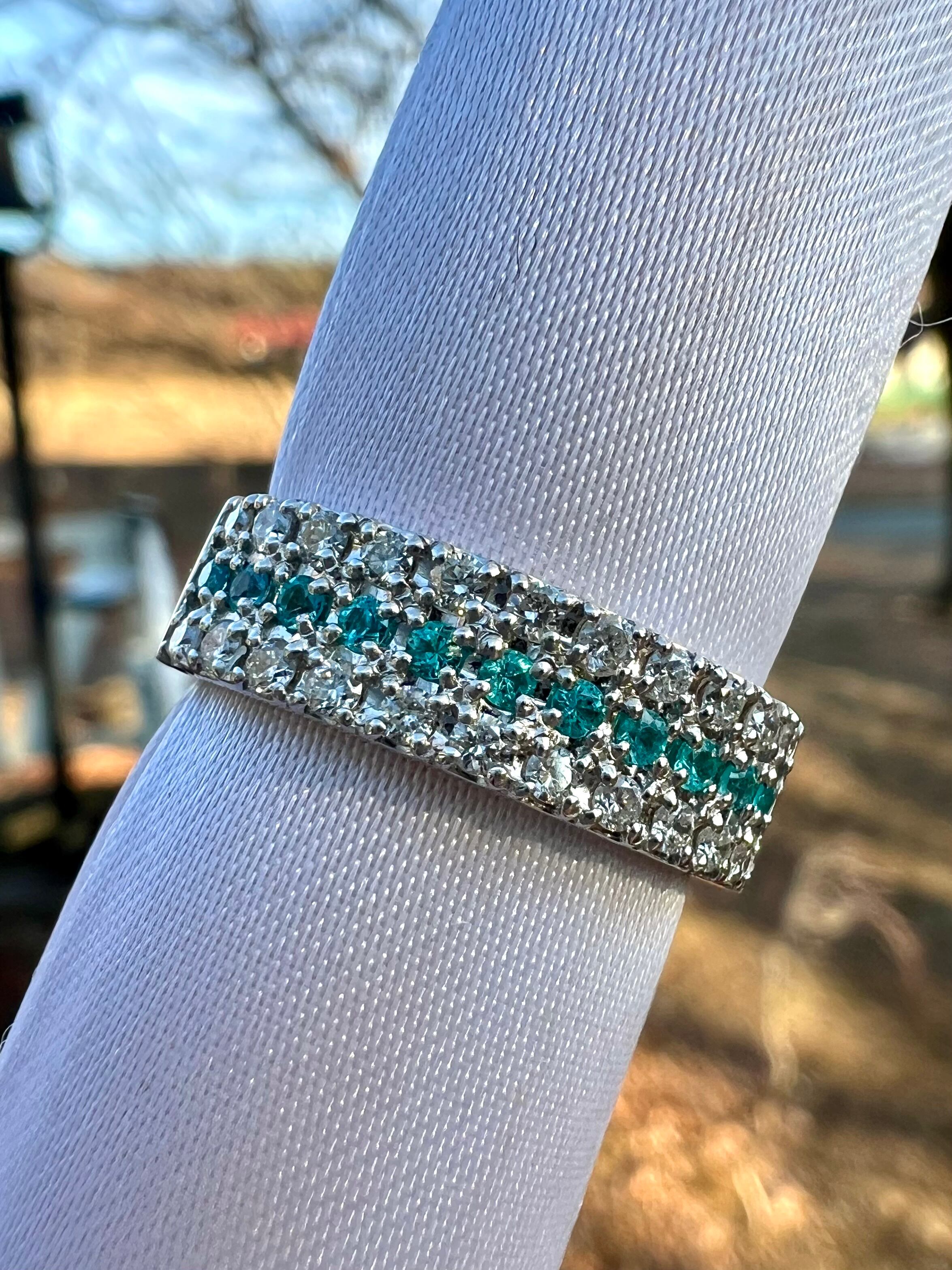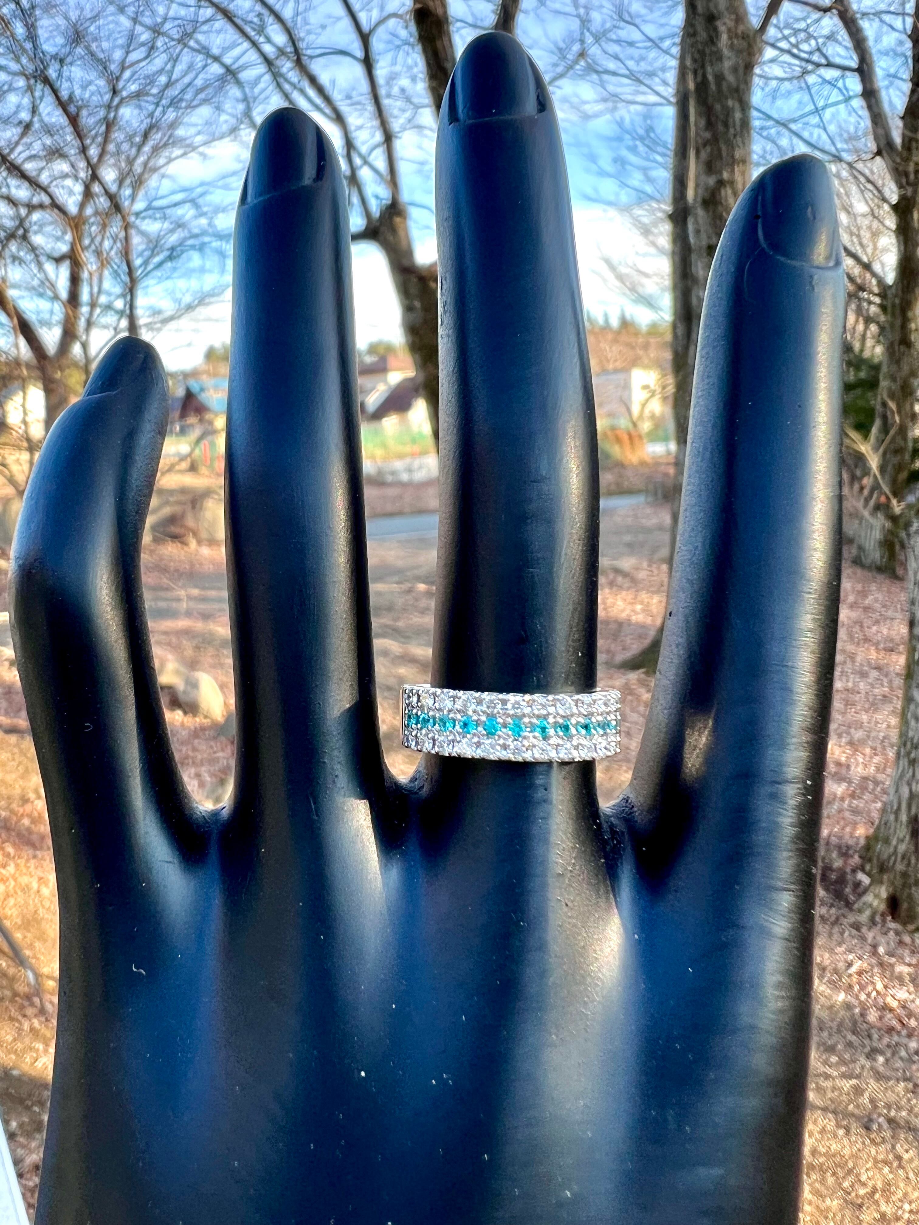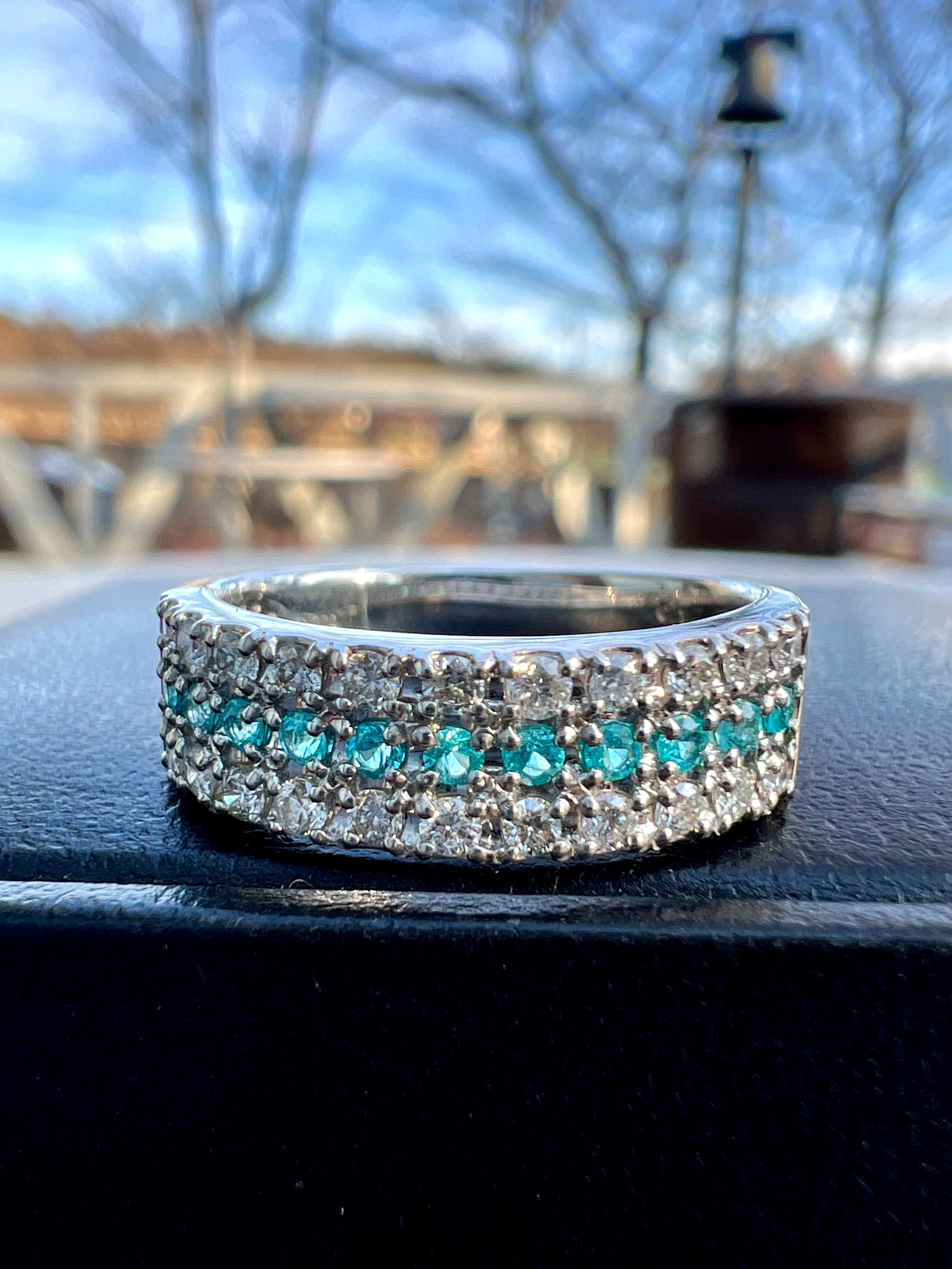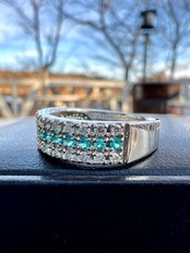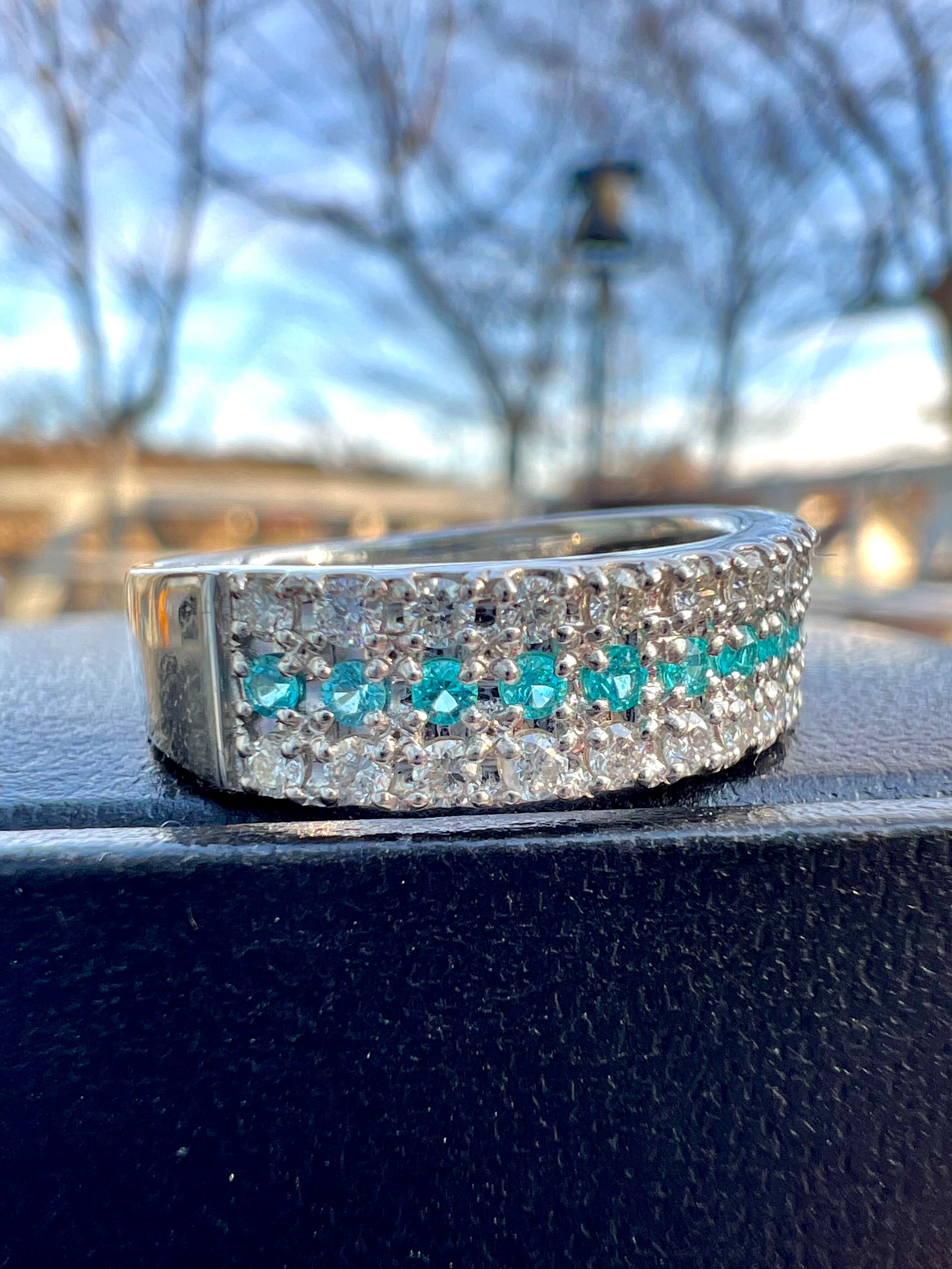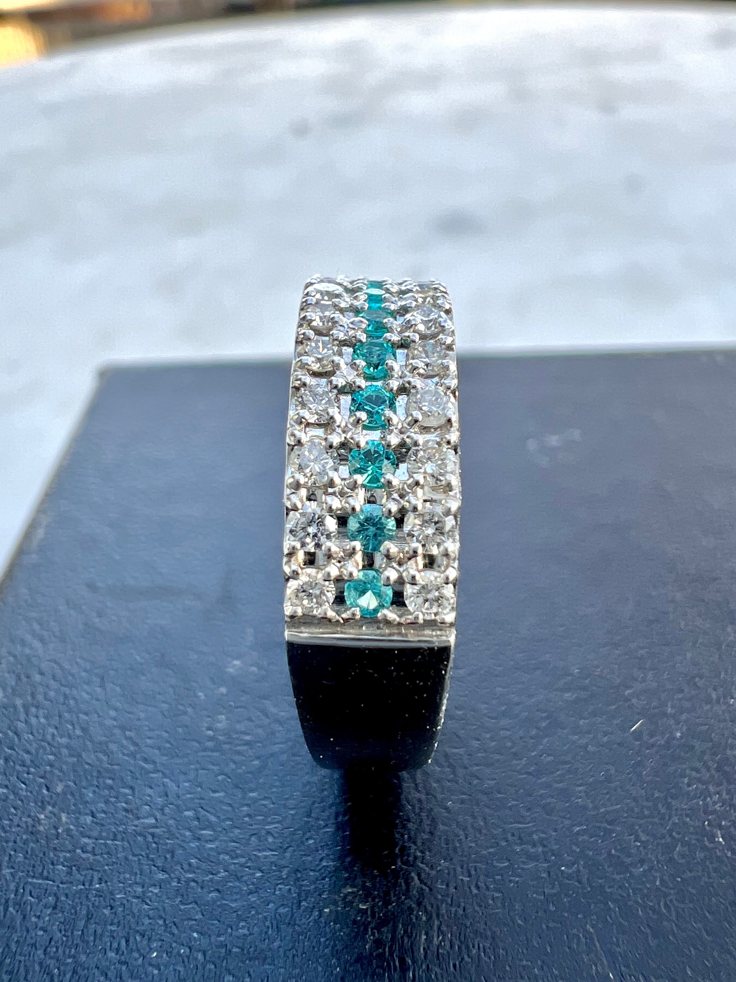 小さいながらもとても綺麗なブラジル産パライバトルマリンをダイヤモンドで挟んださらにオシャレなデザインリング!