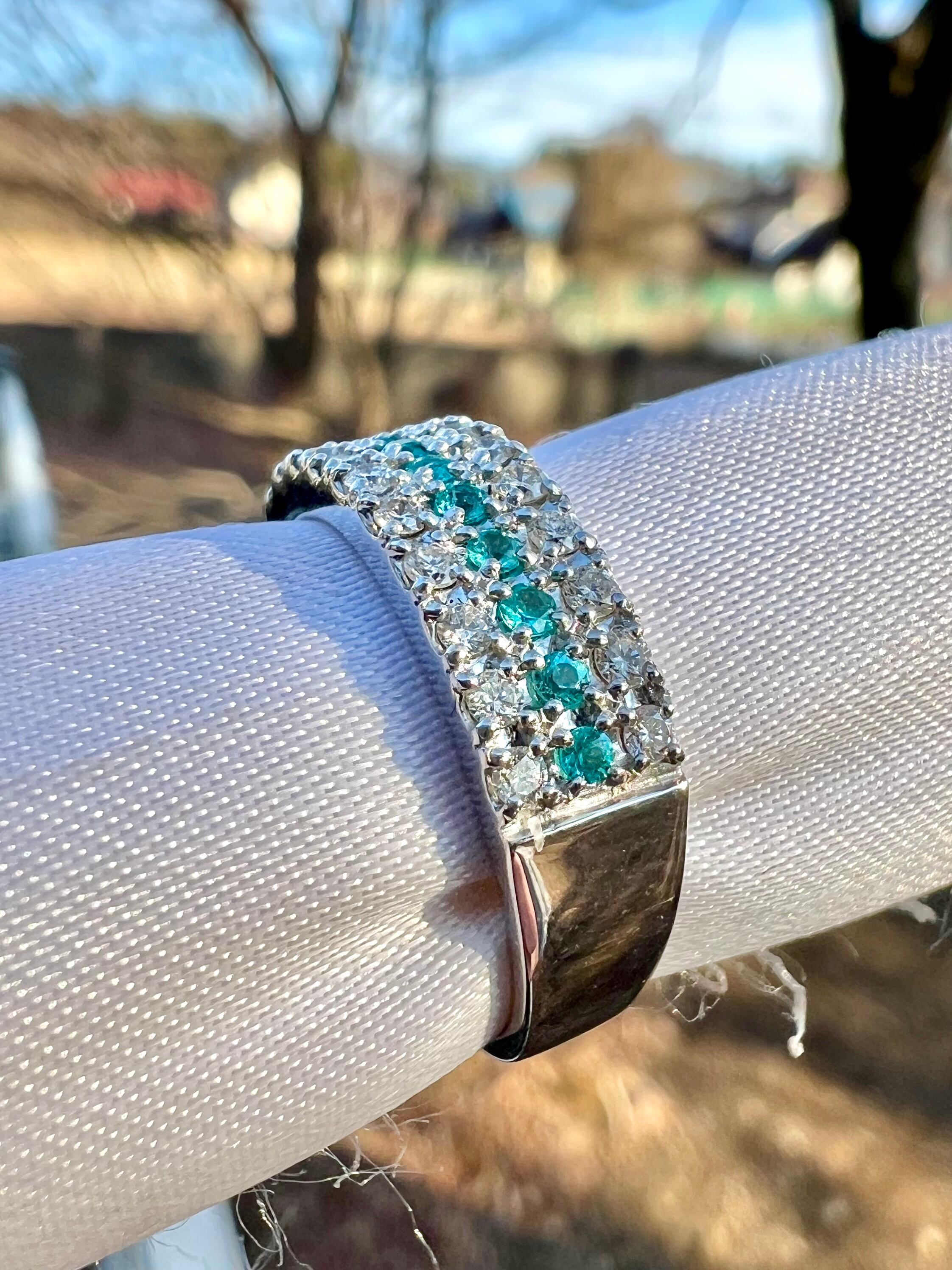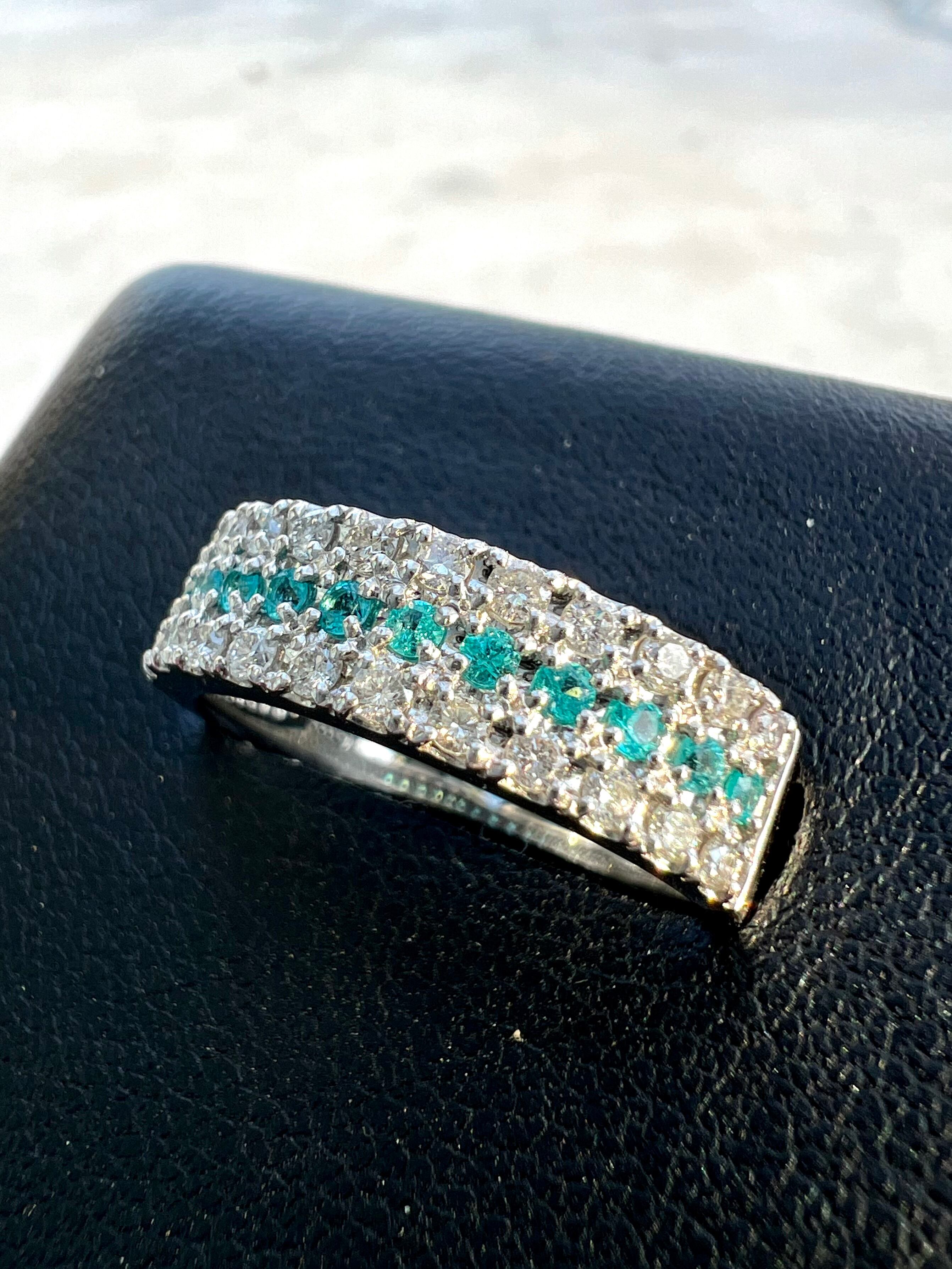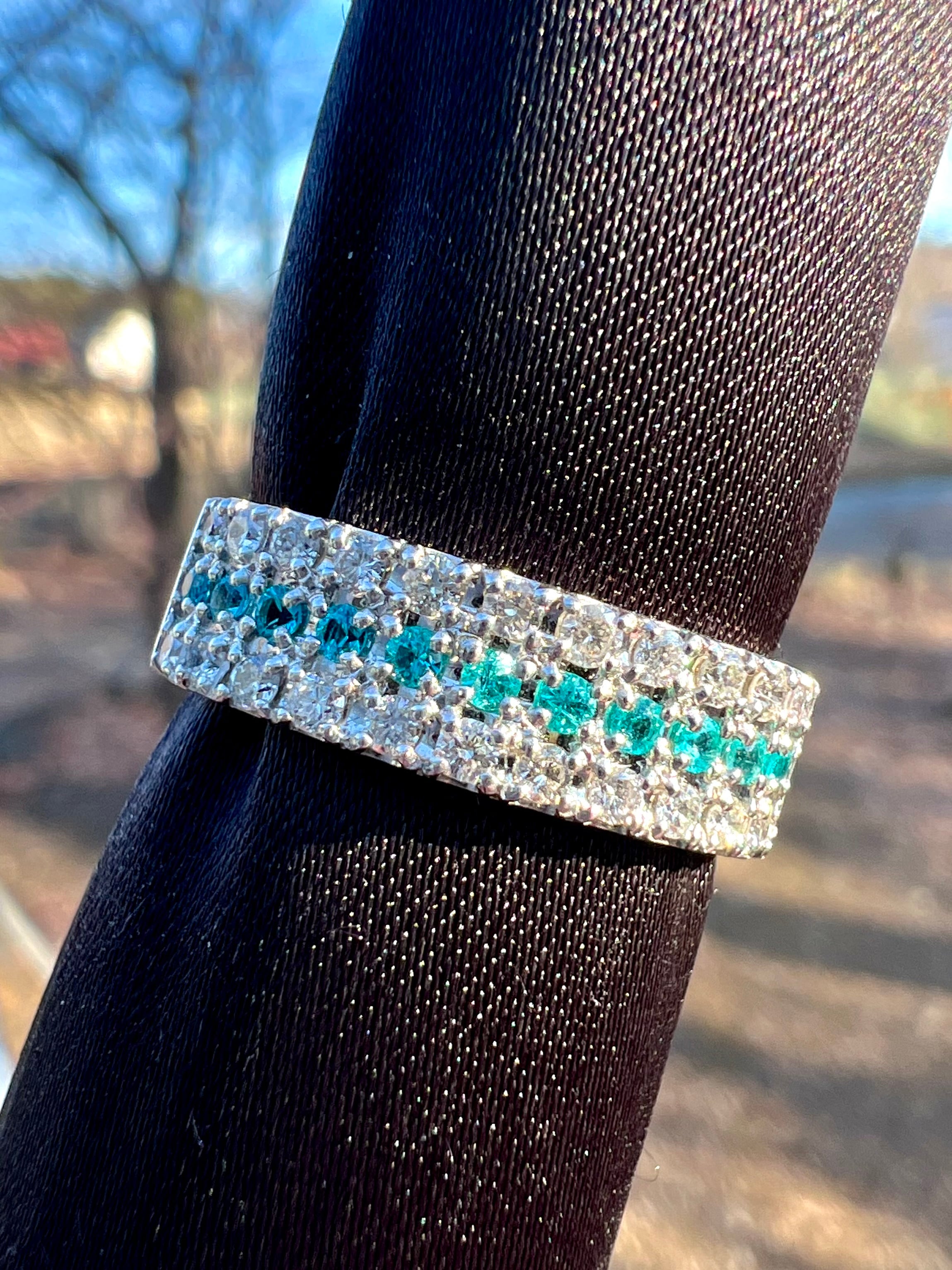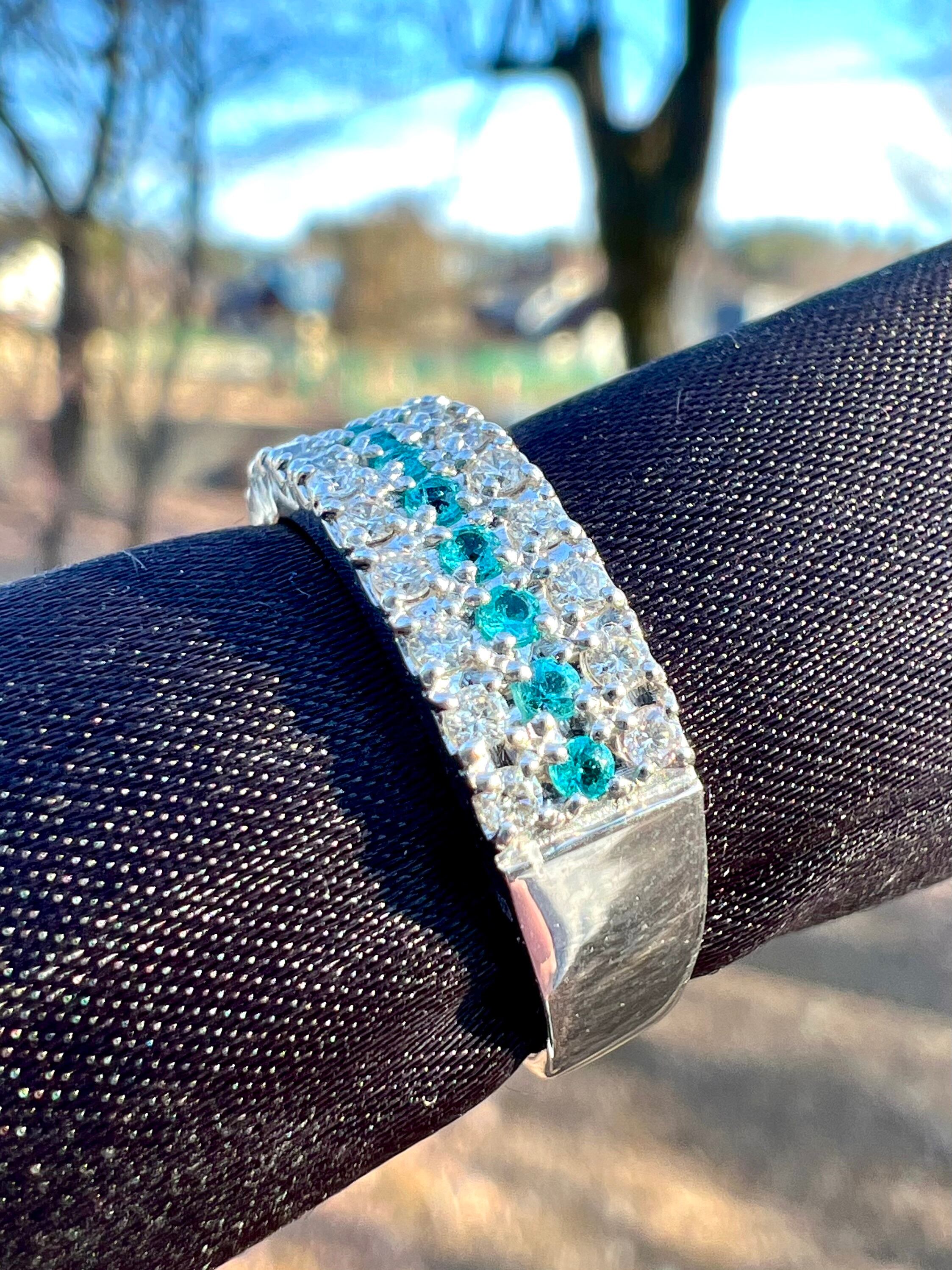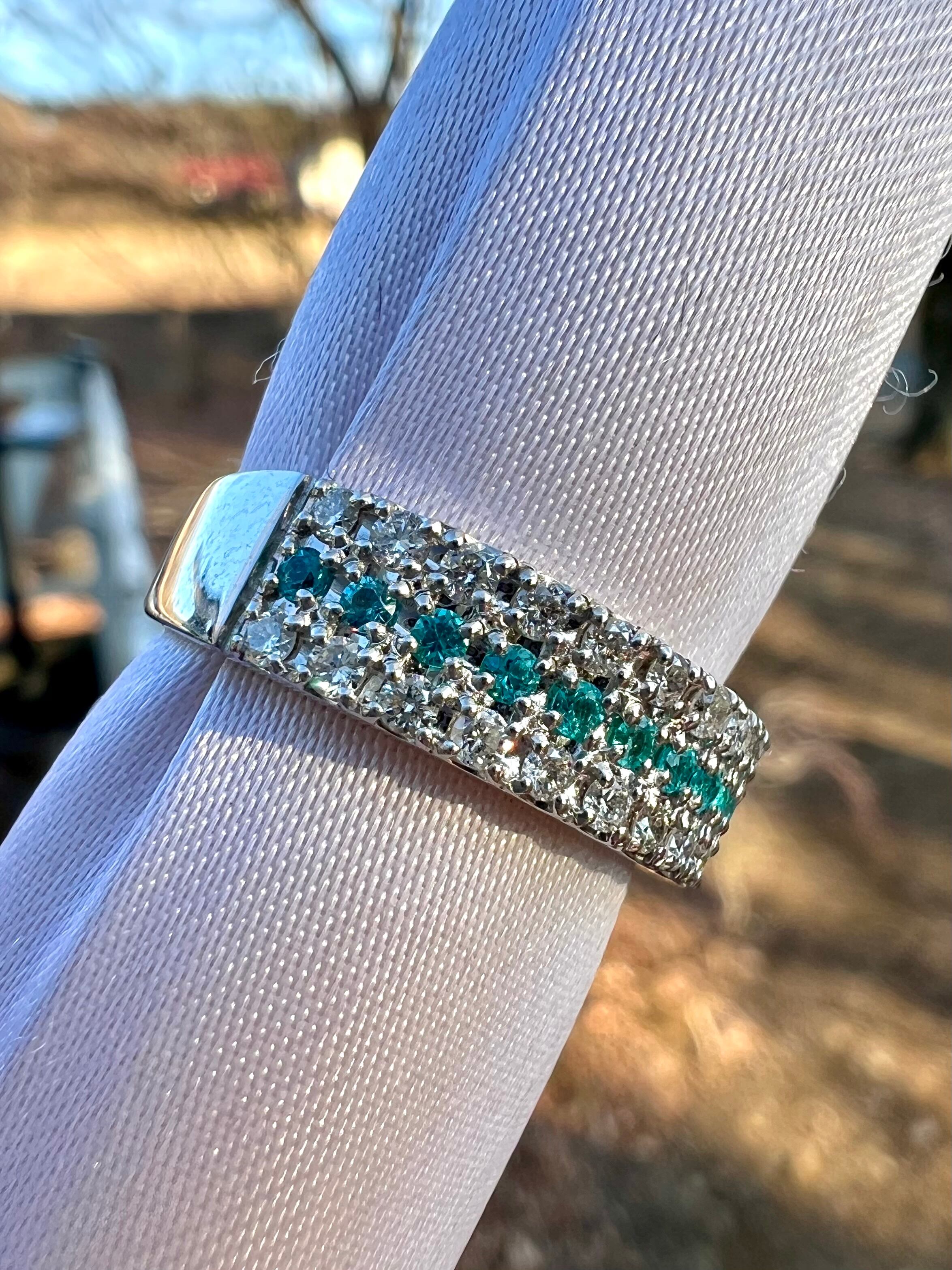 小さいながらもとても綺麗なブラジル産パライバトルマリンをダイヤモンドで挟んださらにオシャレなデザインリング!