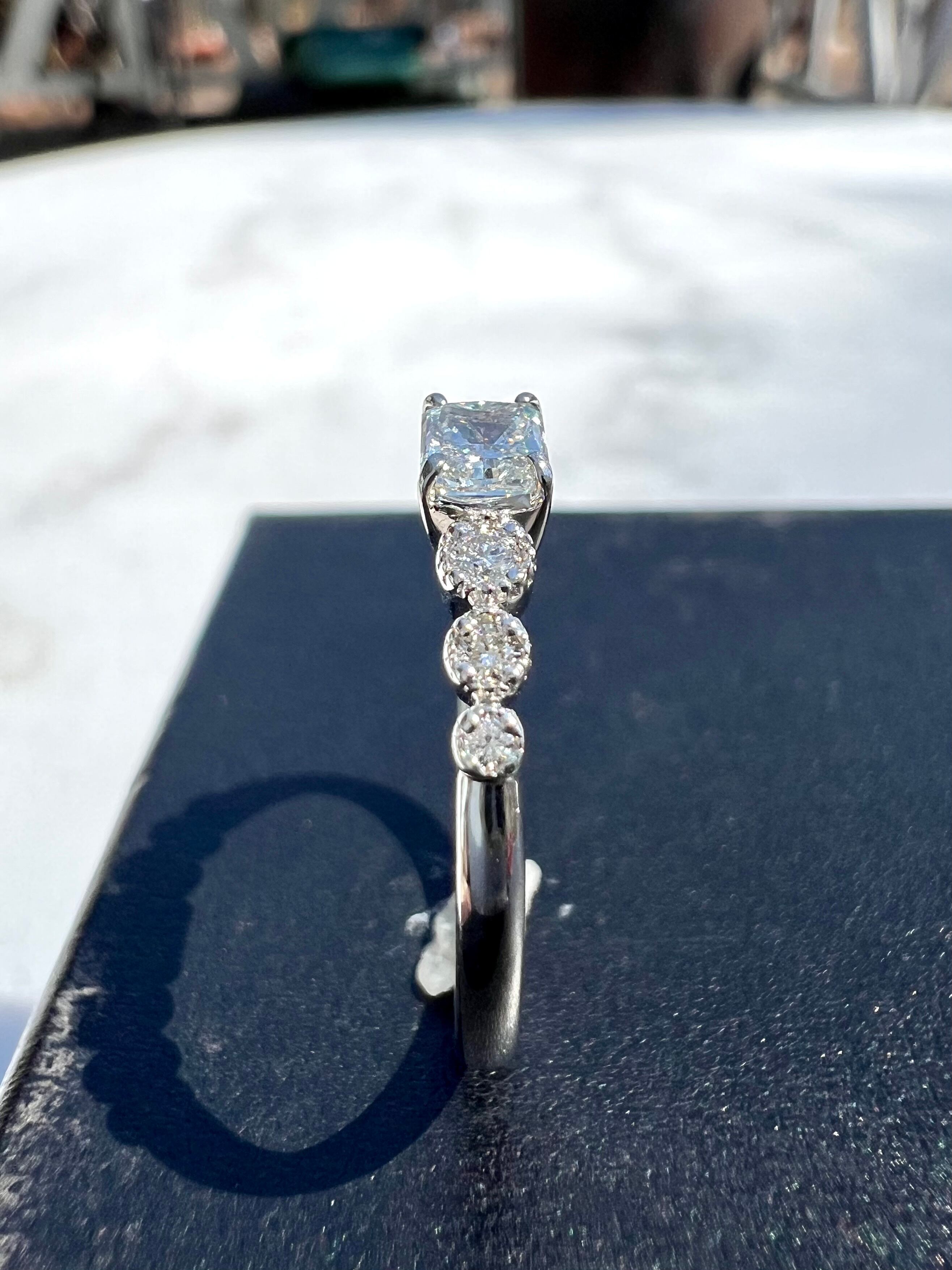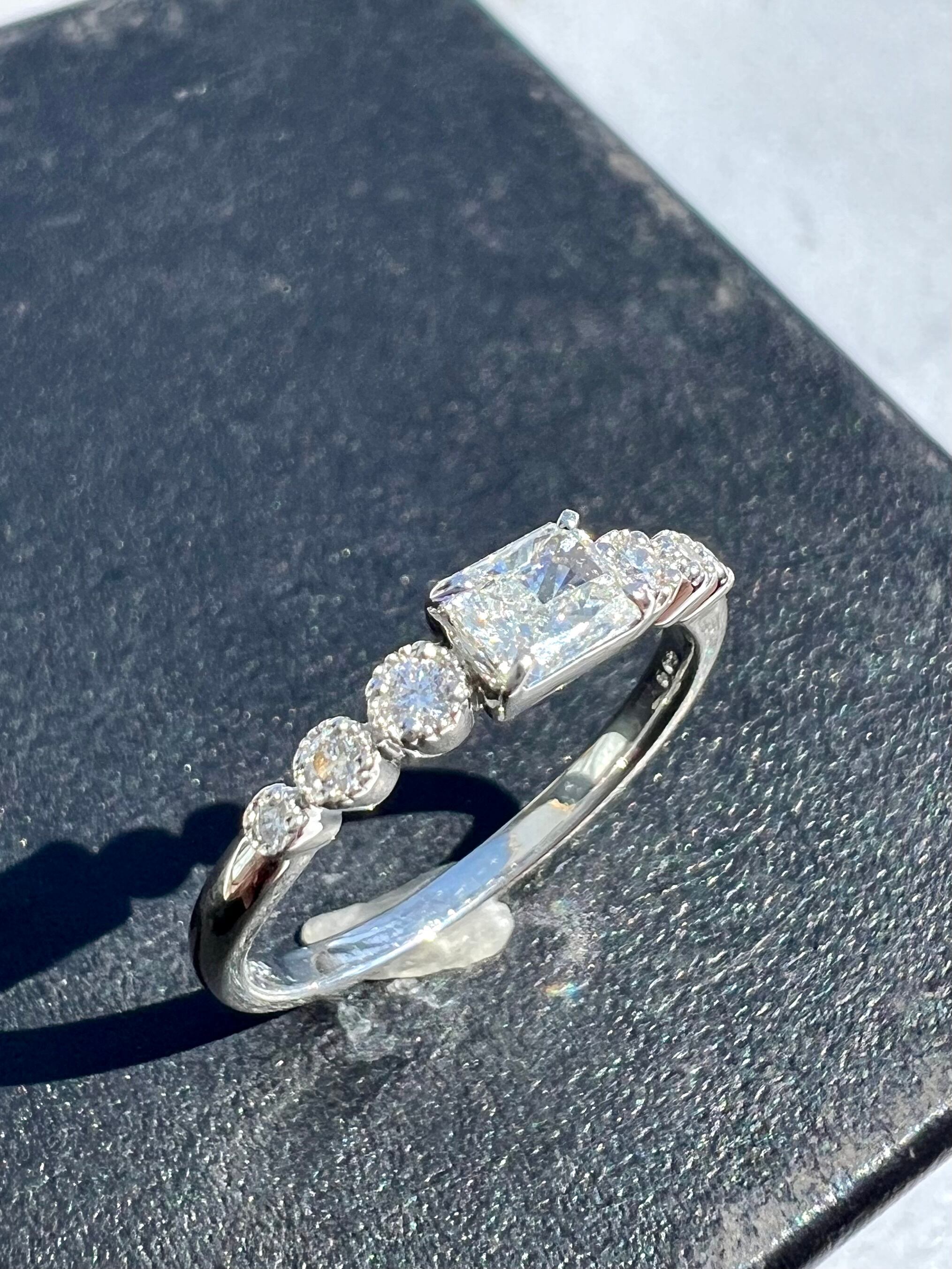 折角のギラッギラのレクタングルカットのダイヤなのであえてダイヤで取り巻かずにシンプルに致しました。