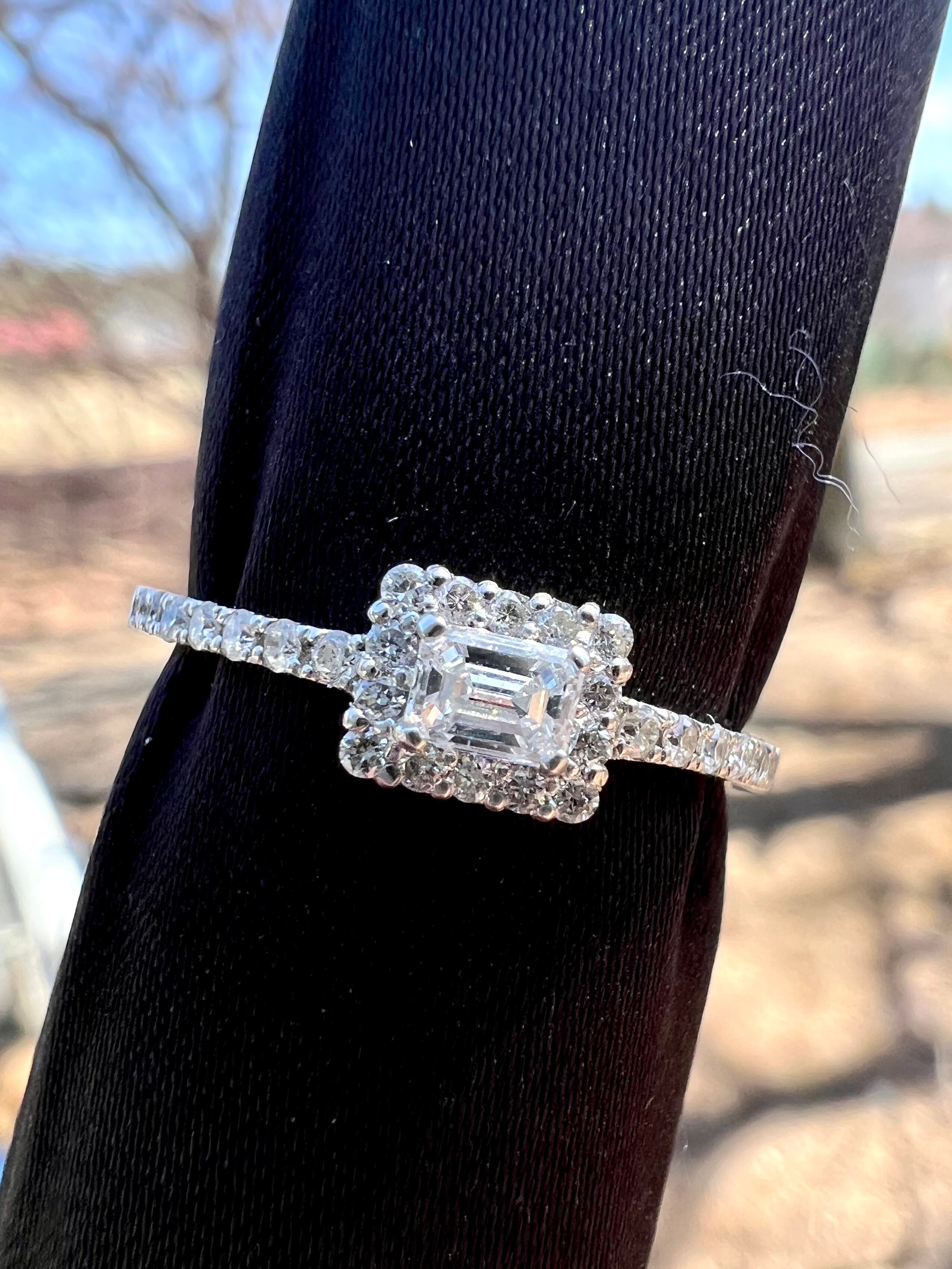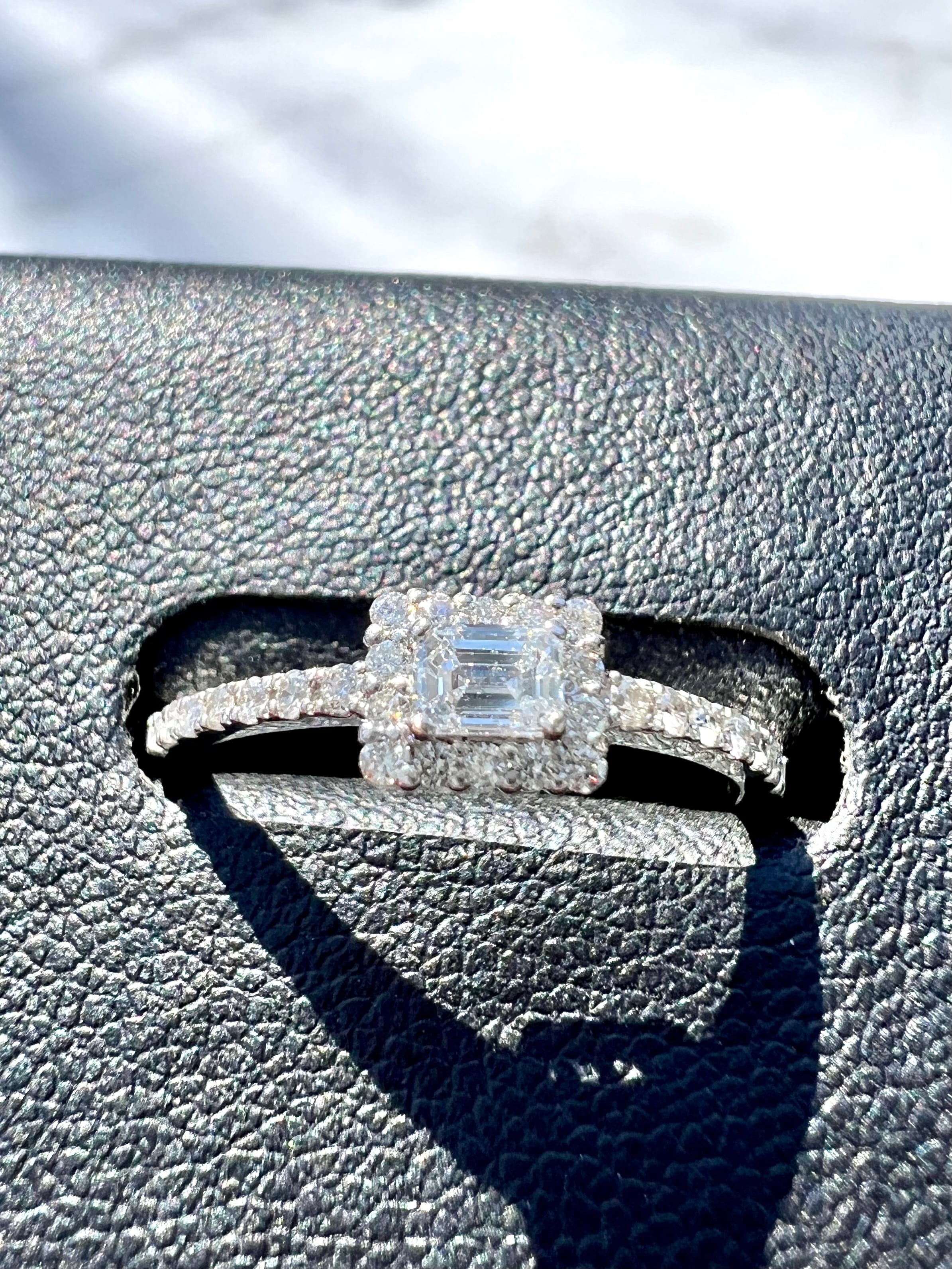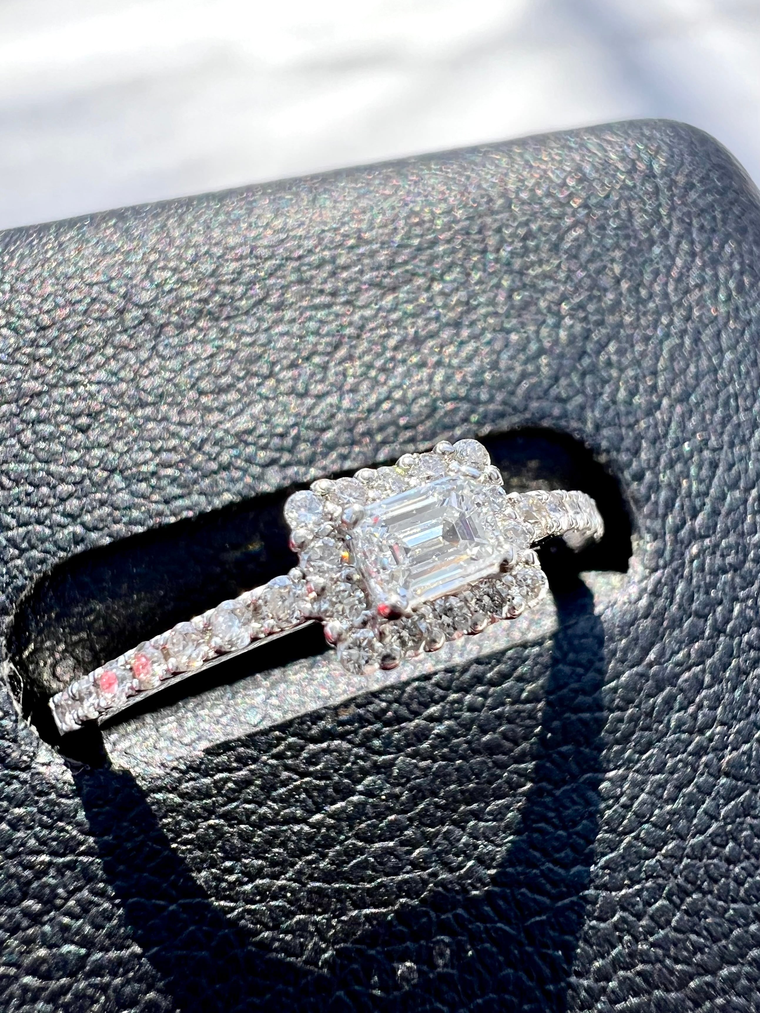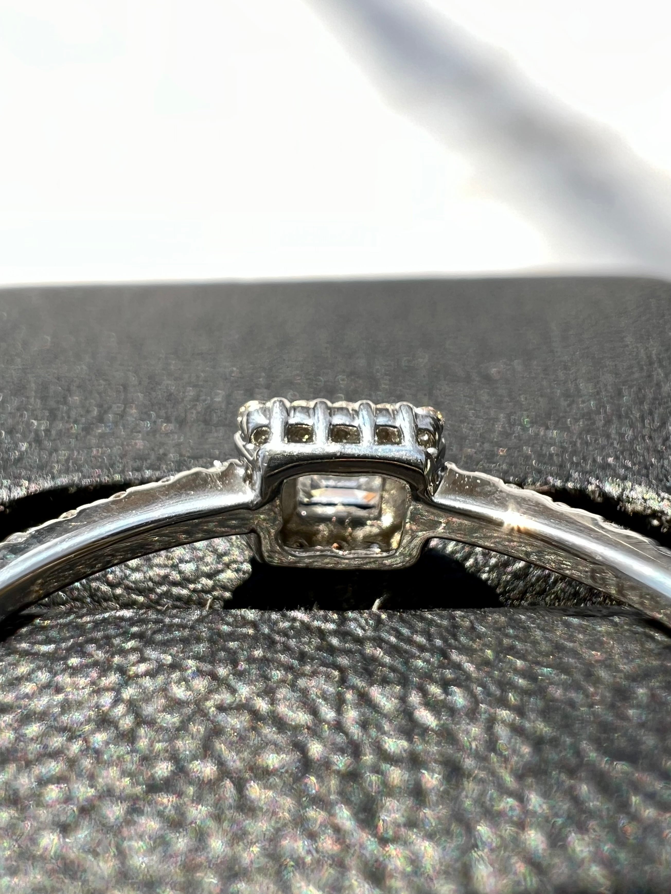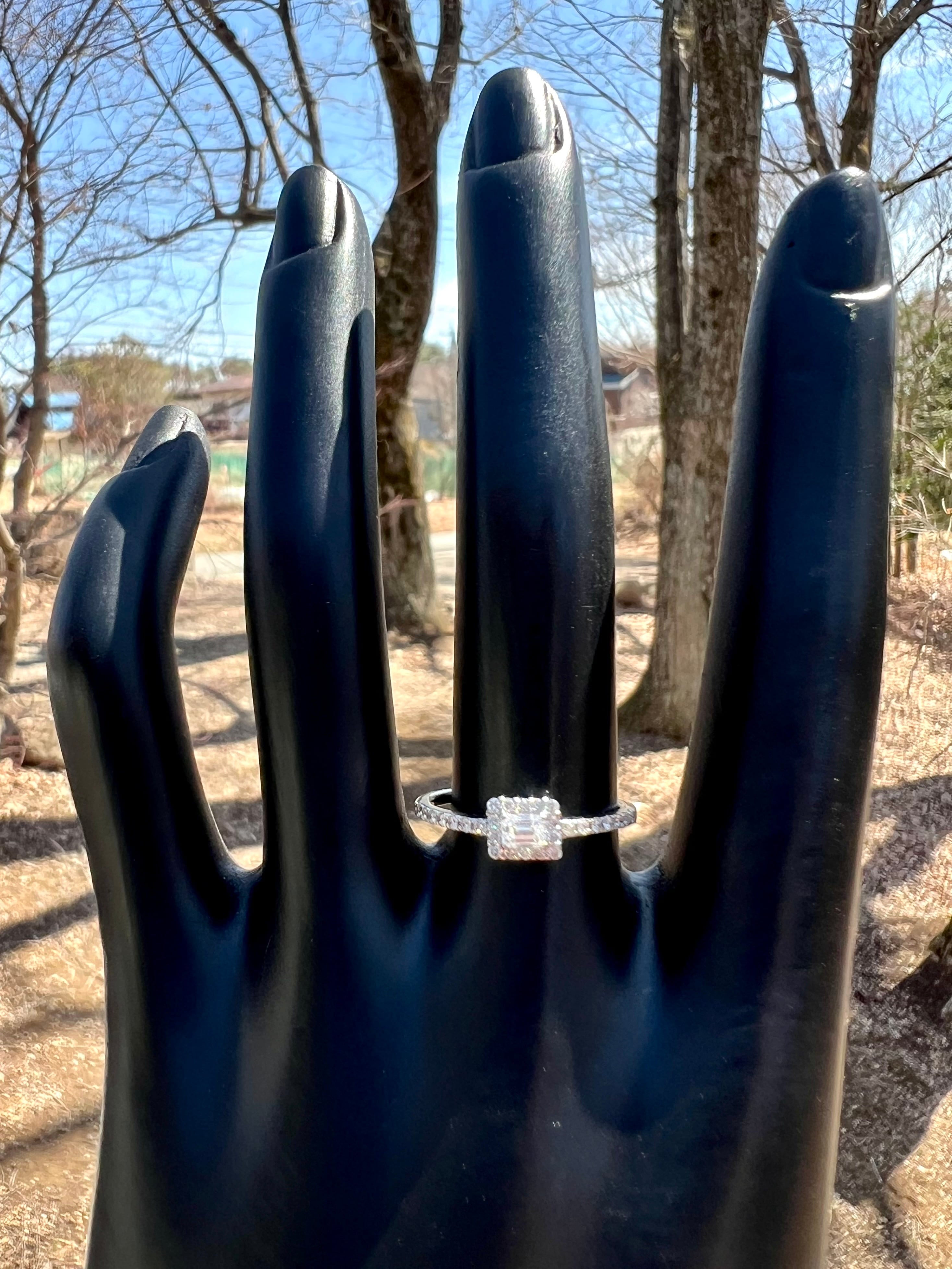 Eカラーの人気のエメラルドカットのダイヤを綺麗なダイヤで取巻きエレガントなデザインに致しました。