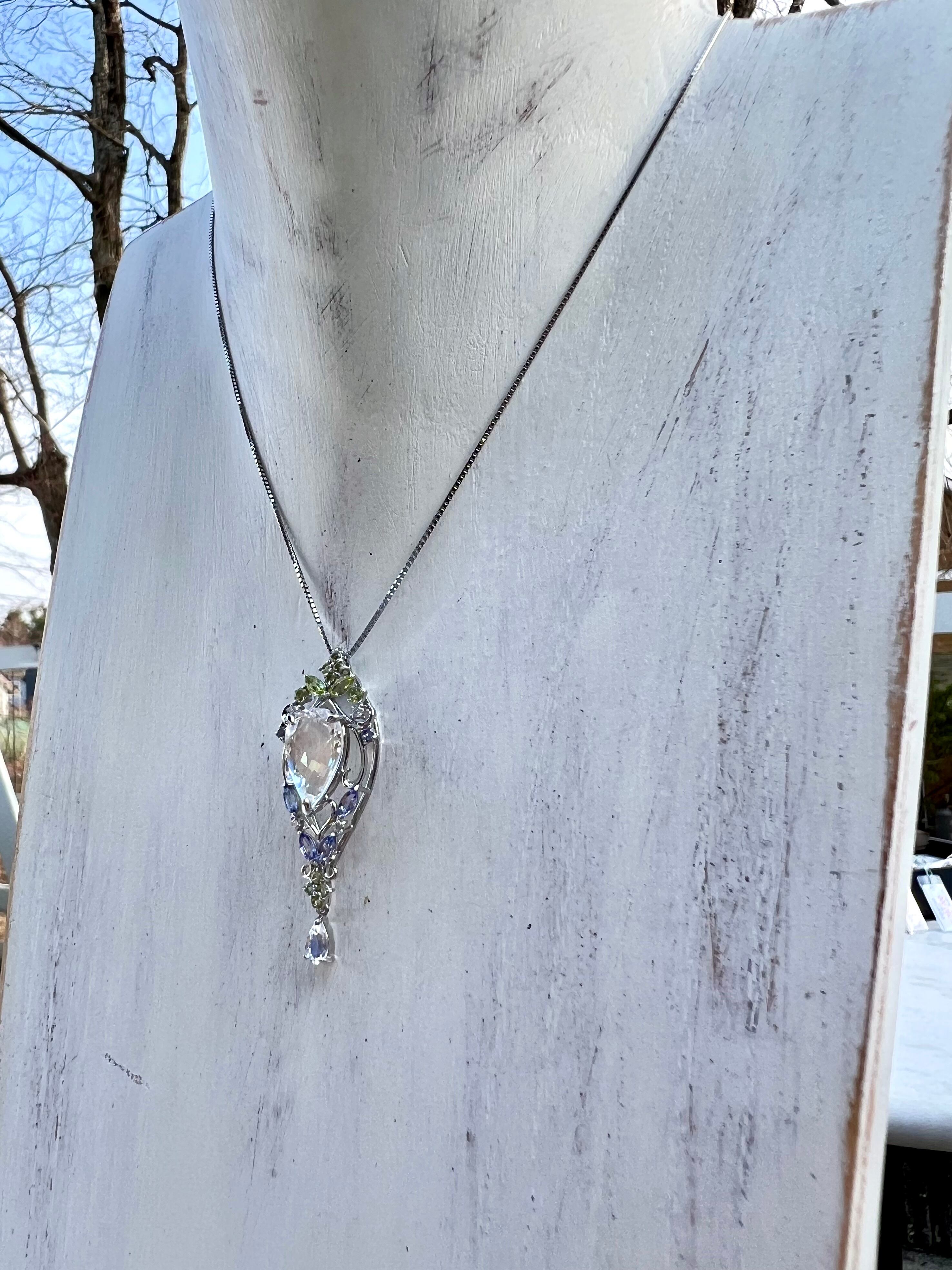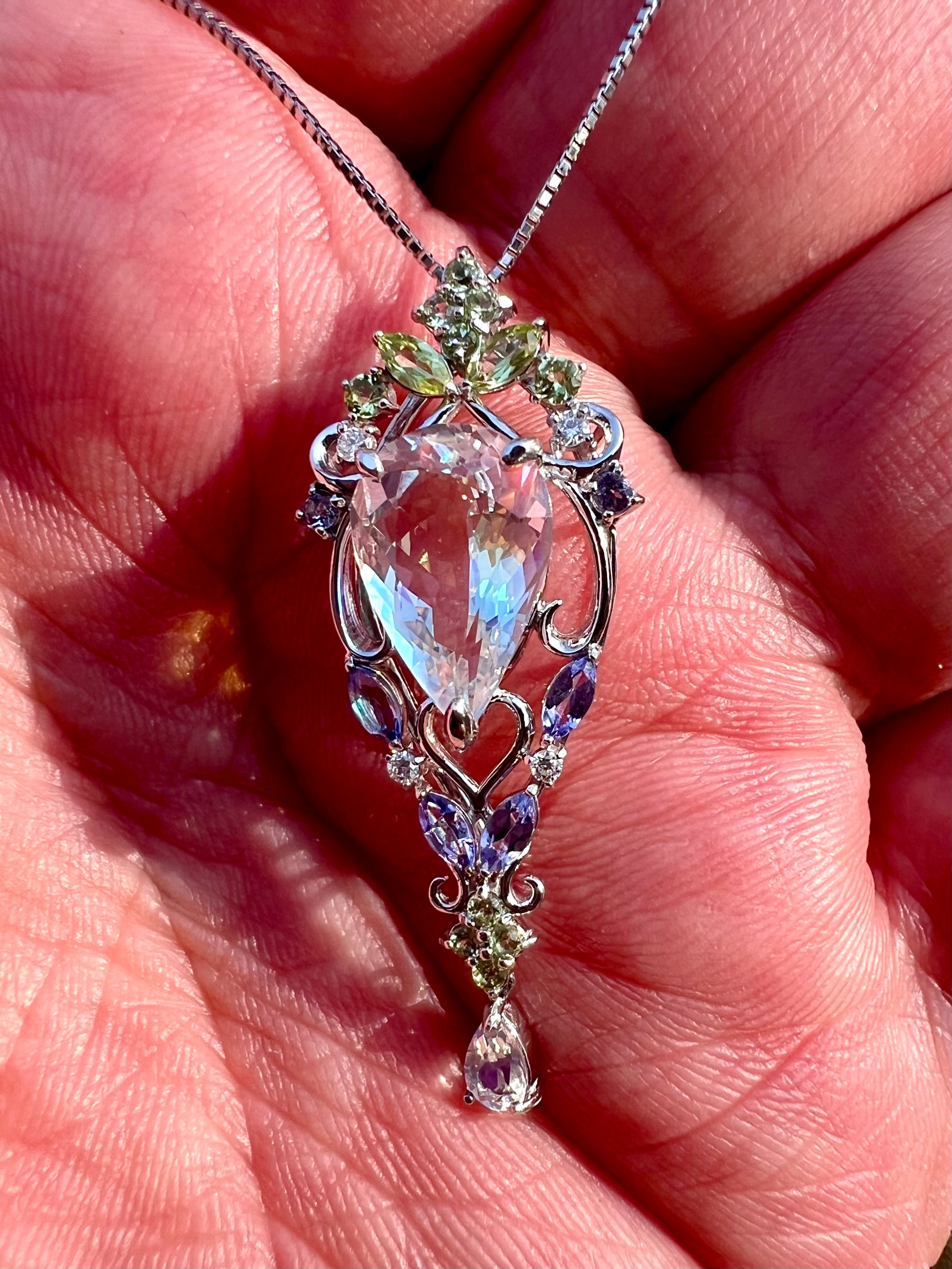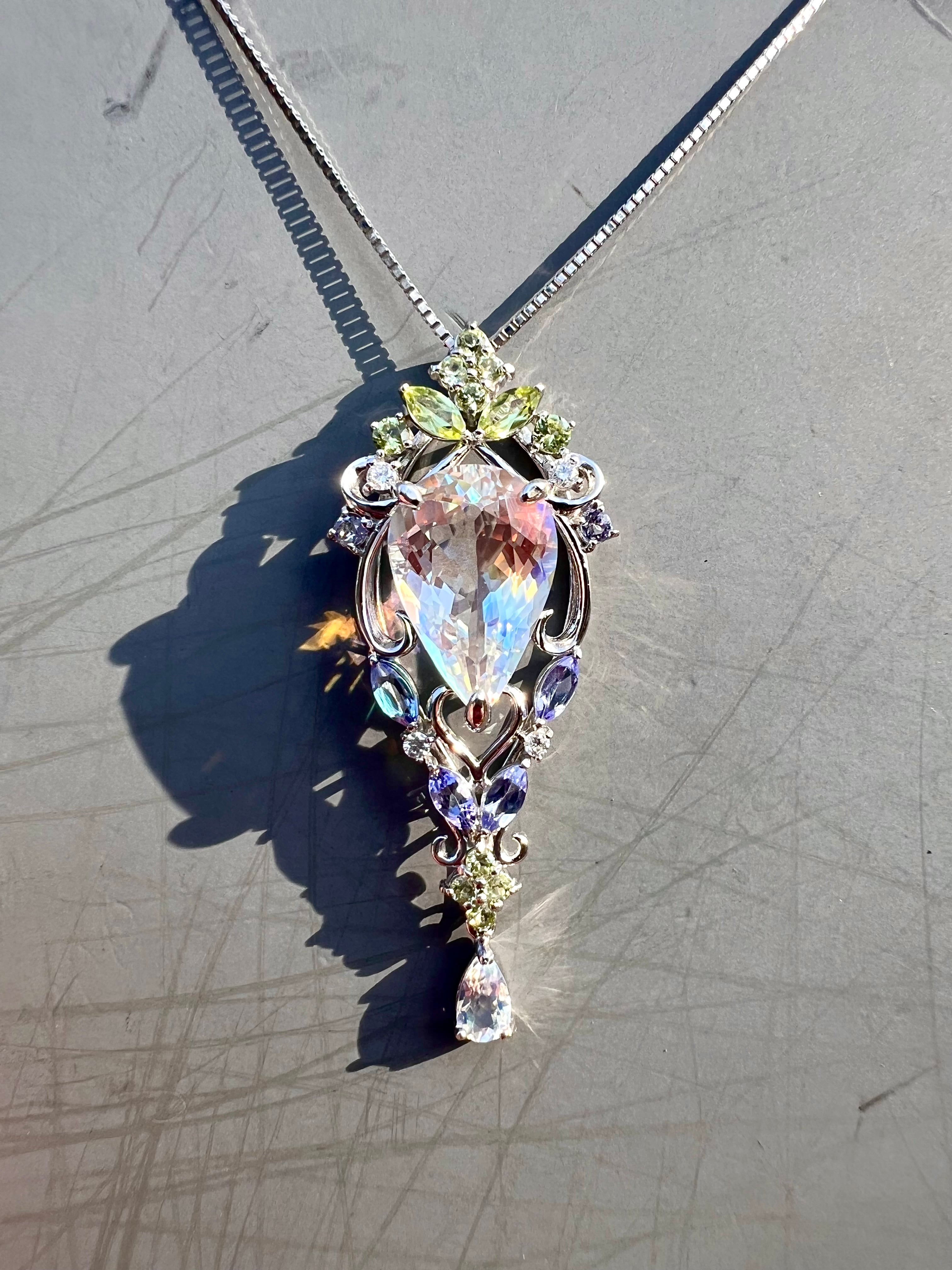 今回のデザインは様々な色の光を放つレインボームーンストーンの周りに色石を配置したとても可愛いネックレス!