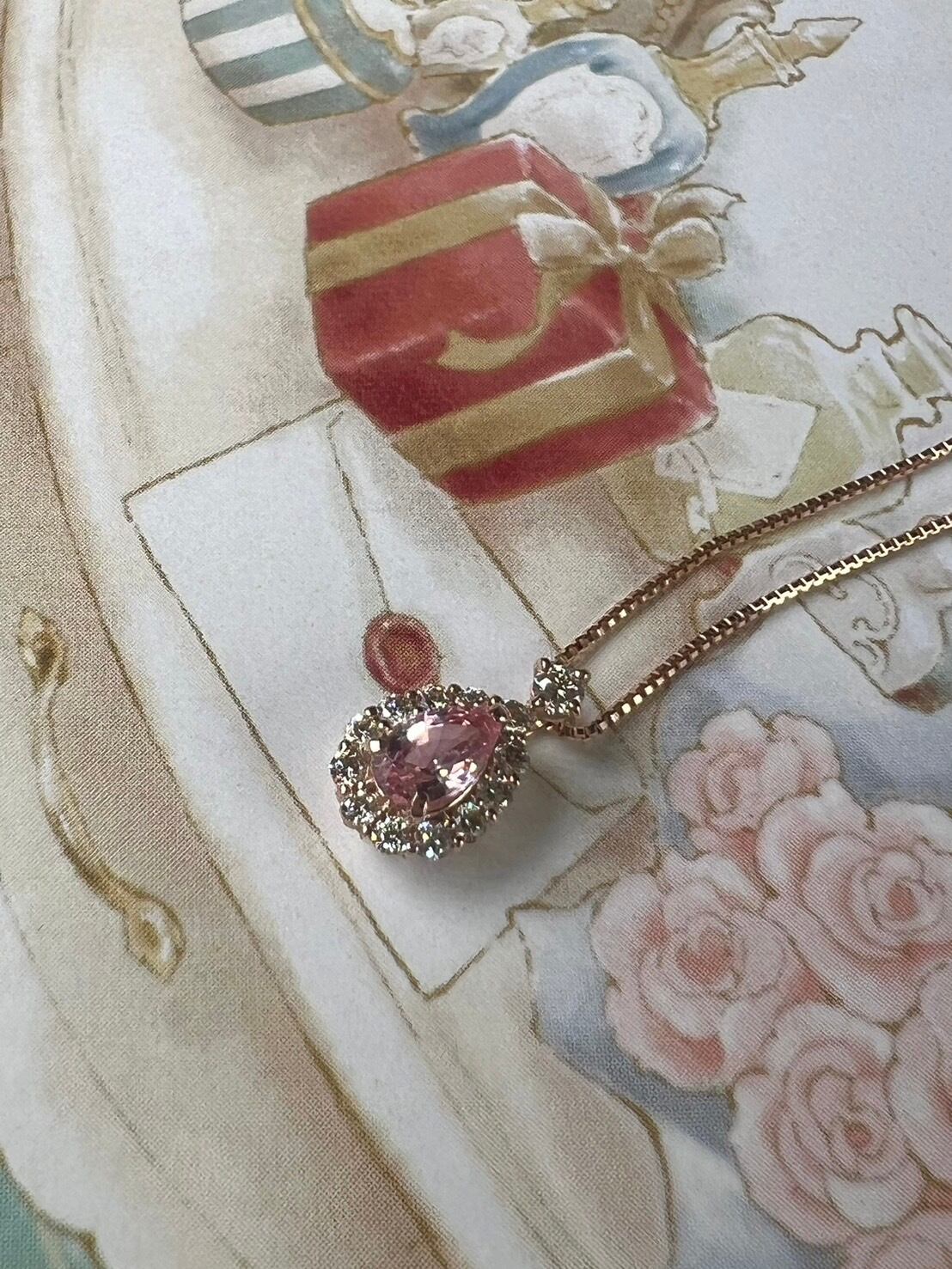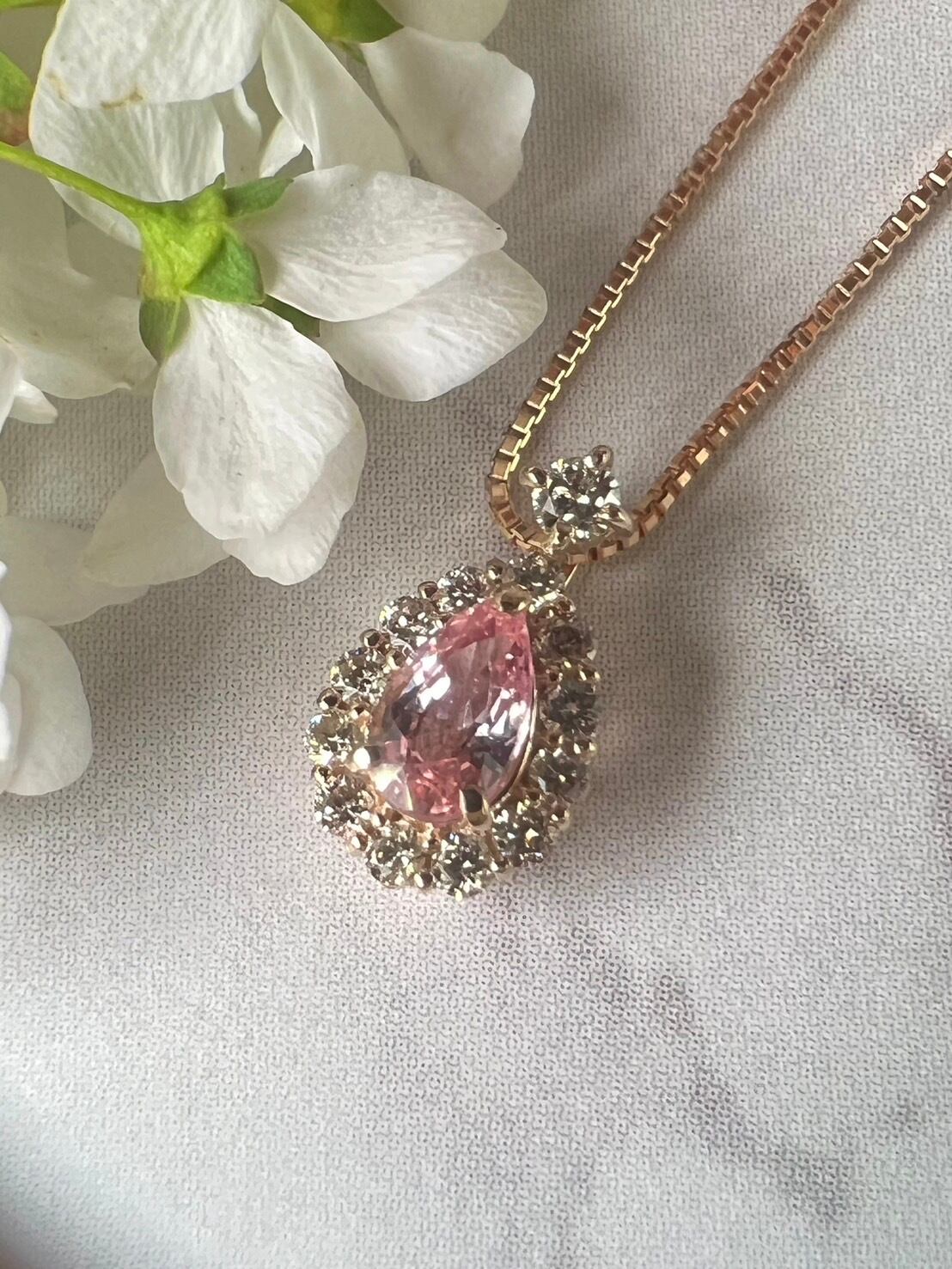 上質なパパラチアサファイヤと美しいダイヤモンドが贅沢に輝く、ペンダントです。このペンダントは非加熱のパパラチアサファイヤを使用しており、まるで蓮の花の蕾を思わせるような優しいオレンジピンク色が特徴です。バチカン部分にはダイヤモンドをセットし、中石もダイヤで取巻き輝きを一層引き立てています。繊細なデザインでありながらも存在感があり、華やかな印象を与えます。また、このパパラチアサファイヤにはAIGSの鑑別書も付属しており、品質や価値を確認することができます。特別な日の装いや大切な人への贈り物にぴったりのアイテムです。