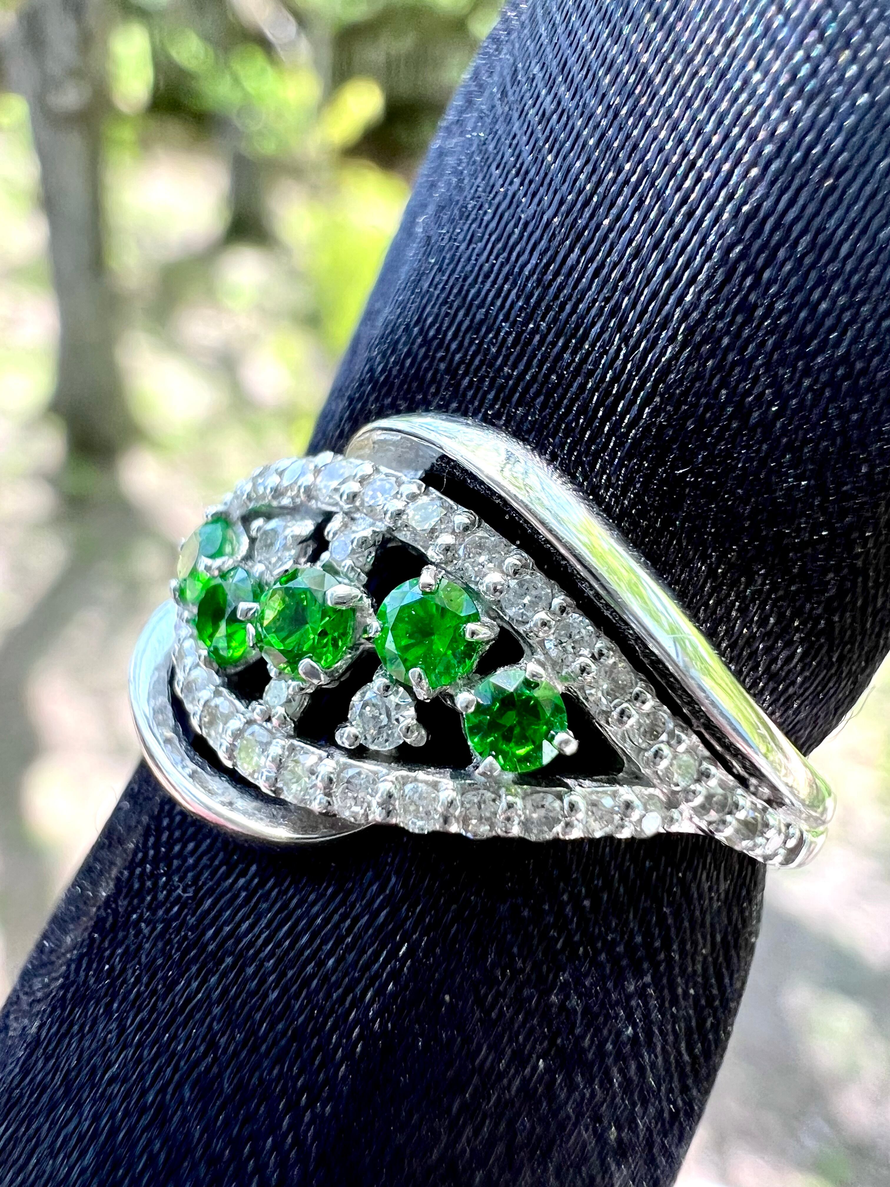 デマントイドの神秘的な輝きと、ダイヤモンドデザインが融合した、上品で洗練された逸品です。