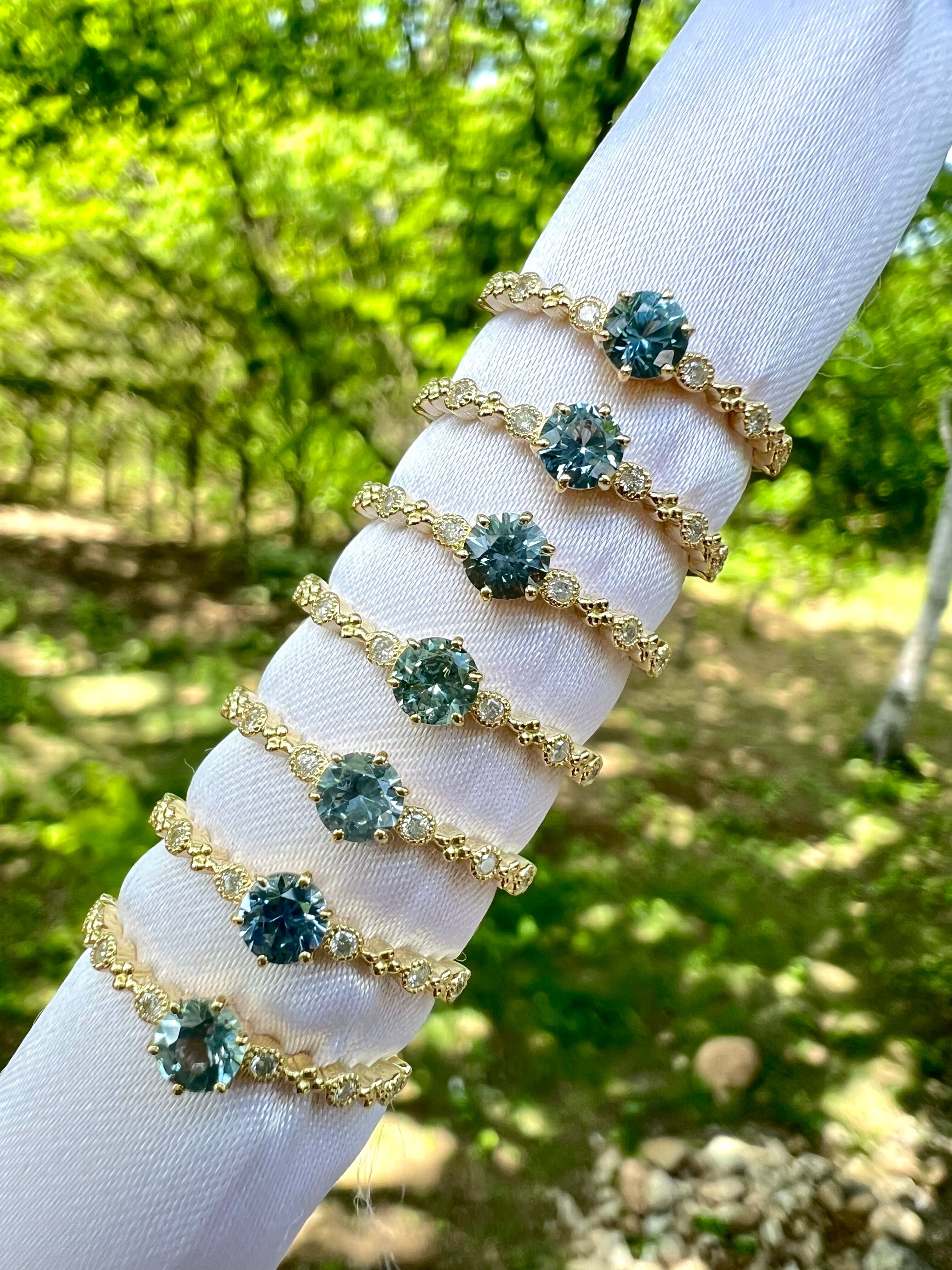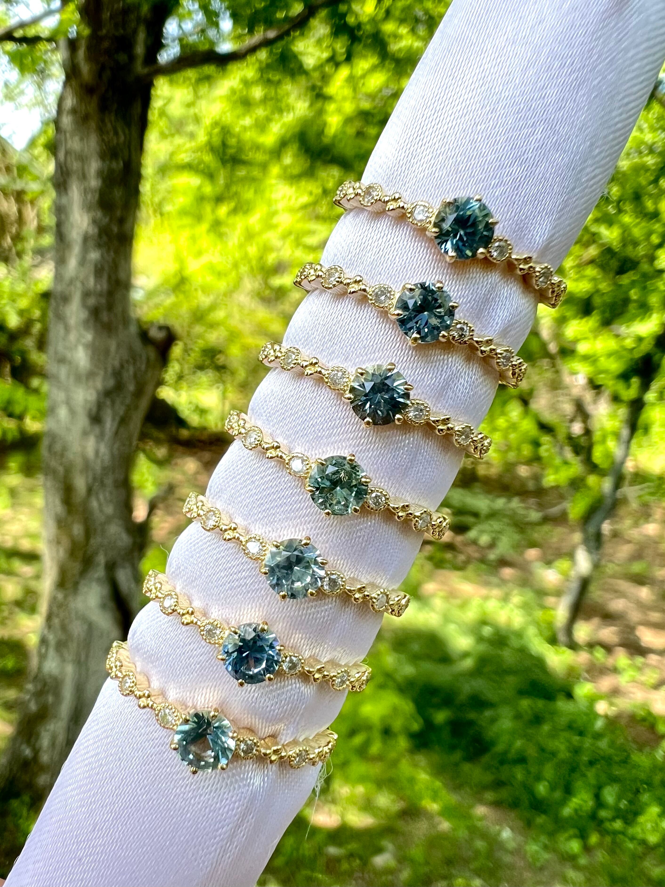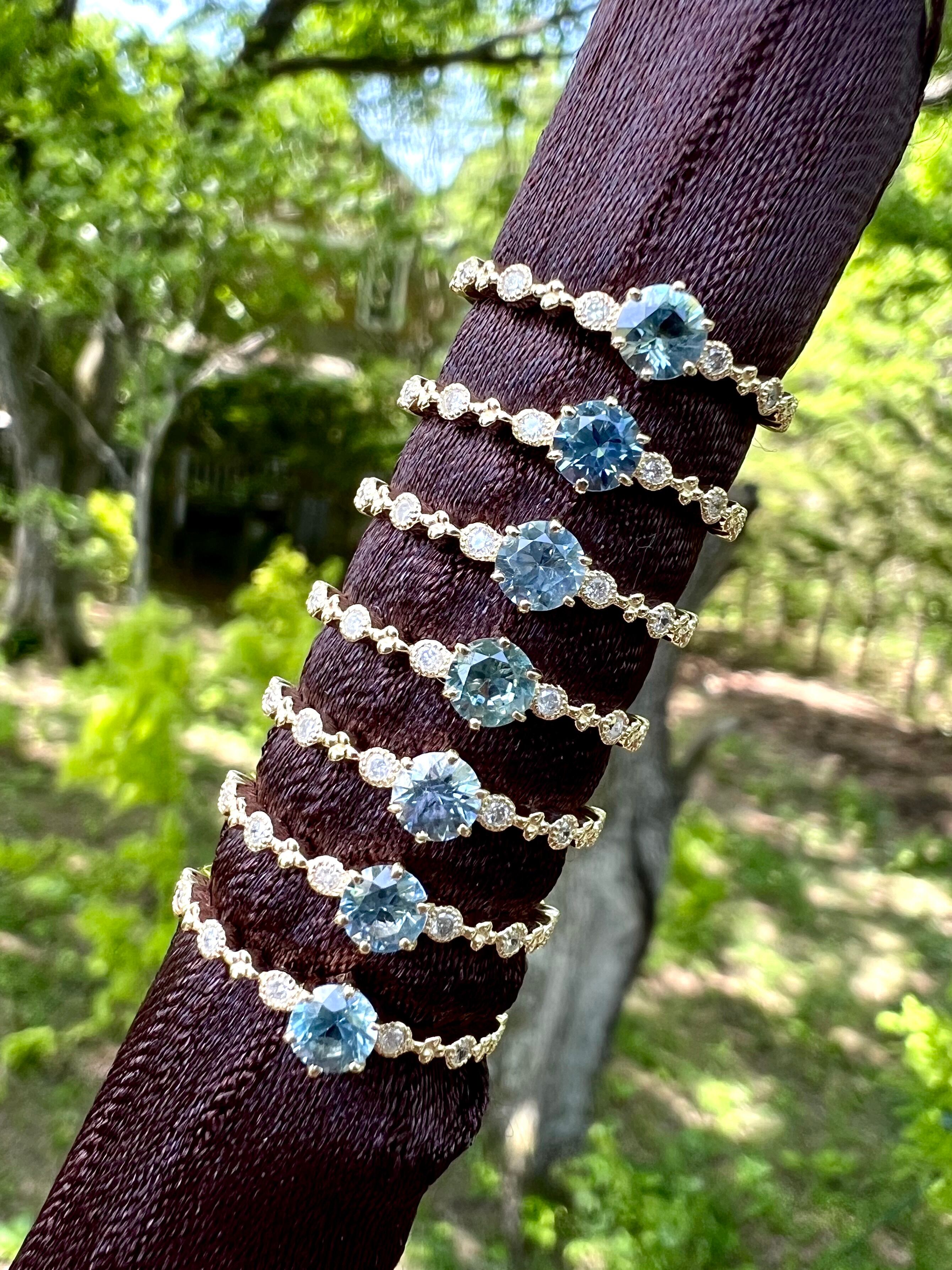 明るめの藍染めを思わせるようなインディゴブルーでかつファンシーカラーの可愛い色がモンタナサファイアらしい色という印象ですがイエローからグリーンからピンクまでいろんな色が存在します。