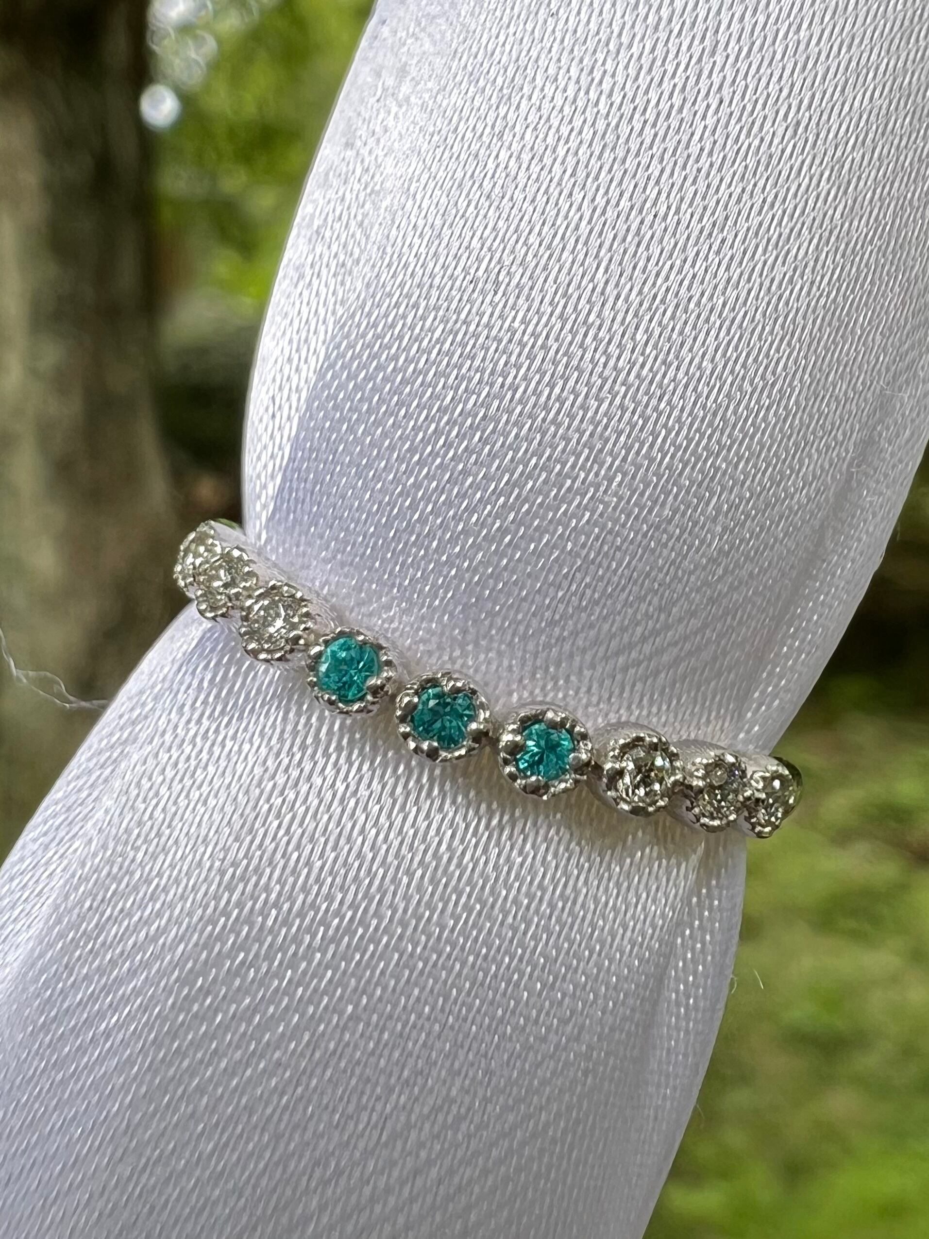 パライバ3石色合わせして一文字エタニティリングに仕上げる贅沢さ!